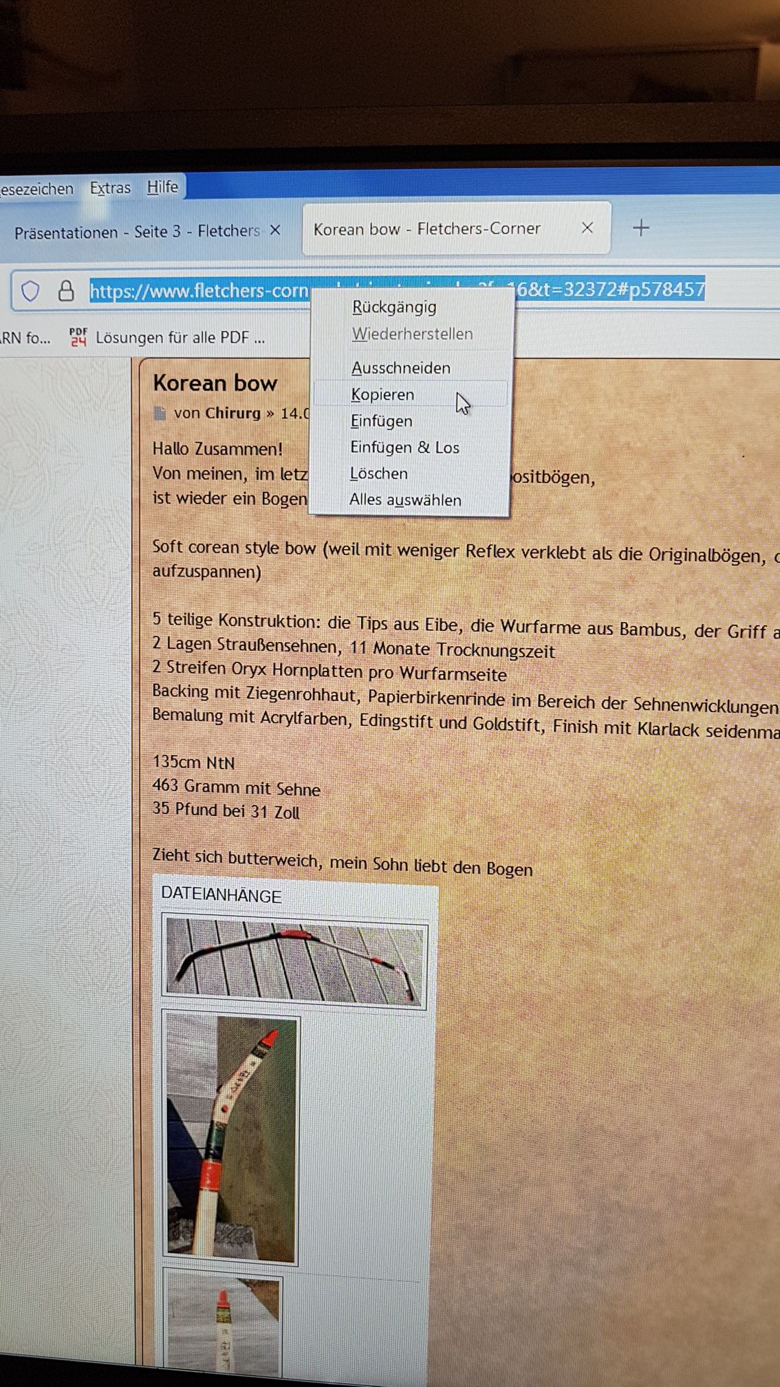 Danach schaue ich nach, ob ein Vermerk vorhanden ist den Bogen vom BdM auszuschließen und prüfe, ob alle erforderlichen Fotos vorhanden sind. Wenn z.b. ein Foto vom abgespannten Bogen fehlt, bleibt der Bogen außen vor (in der Regel wird bei einer Präsentation darauf aufmerksam gemacht, dass Fotos fehlen - soll sich also keiner beschweren, wenn sein Bogen wegen fehlender Fotos fehlt).