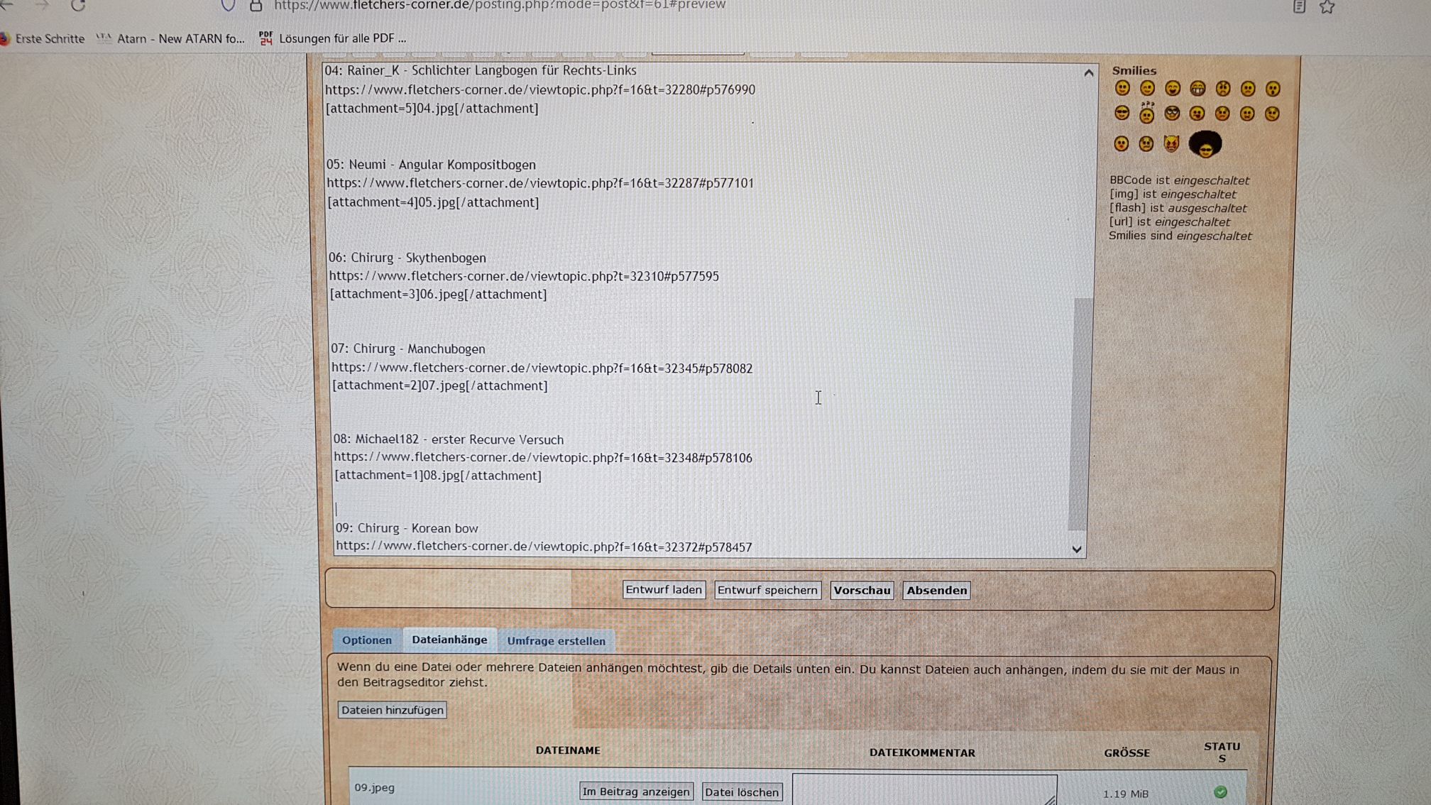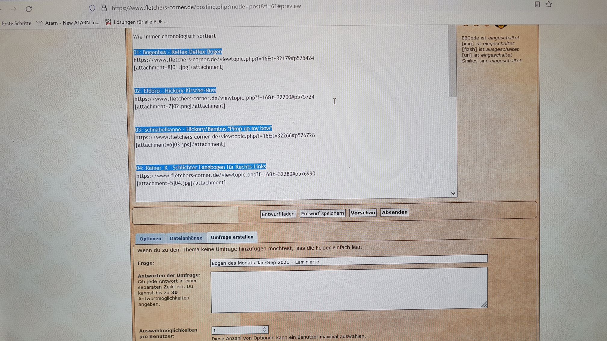 Danach markiere ich die einzelnen, nummerierten Bogentitel, kopiere und füge diese im Feld "Antworten der Umfrage" ein. Dann nur noch den eingefügten Block auf einzelne Zeilen bringen und fertig ist das Ding. Vorm abschicken wird aber auf alle Fälle die "Vorschau" benutzt und ich öffne alle links in einzelnen Fenstern um zu checken, ob's passt.