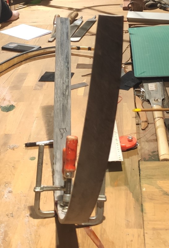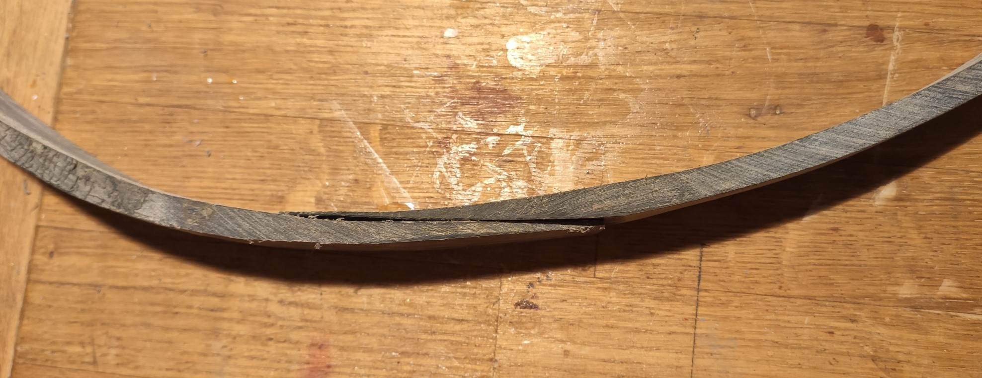 Die original Sheephorn bows wurden tatsächlich mit Horizontalfuge verklebt. Die überlappenden Teile müssen zusammen der dickste Teil im Bogen sein. Die Fuge muss perfekt gearbeitet sein. Hautleim bei der Verklebung hätte den Vorteil, dass Du bei dicker Konsistenz mit Schraubzwingen pressen kannst. Super dichte Fuge. Bitte keine Belastungstests. Da muss erst Sehne drauf! Sehne zirkulär gewickelt im Griffbereich, dann in Längsrichtung über den ganzen Bogenrücken und dann wieder zirkulär im Griffbereich. Dann Trocknen, Am besten 6 Monate. Jetzt erst wären Belastungstests möglich. Bei Epoxy würde ich nicht mit Zwingen pressen. Ich wickle immer nur fest mit Isolierband. Gibt ausreichend Druck und der Kleber bleibt drinnen! Und nach dem Trocknen (Ich würde wegen dem Horn keine Hitze verwenden, der Kleber wird bei Hitze zusätzlich dünnflüssiger und rinnt aus) wieder keine Belastungstests. Auch da muss erst Sehne drauf!