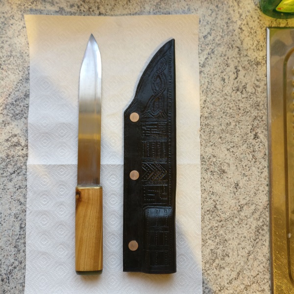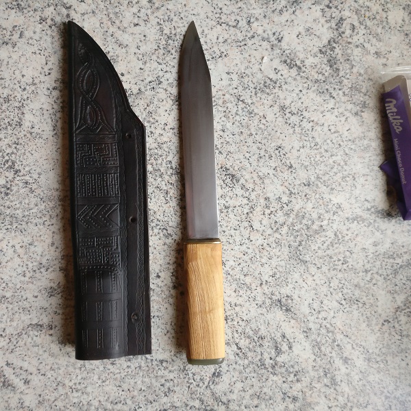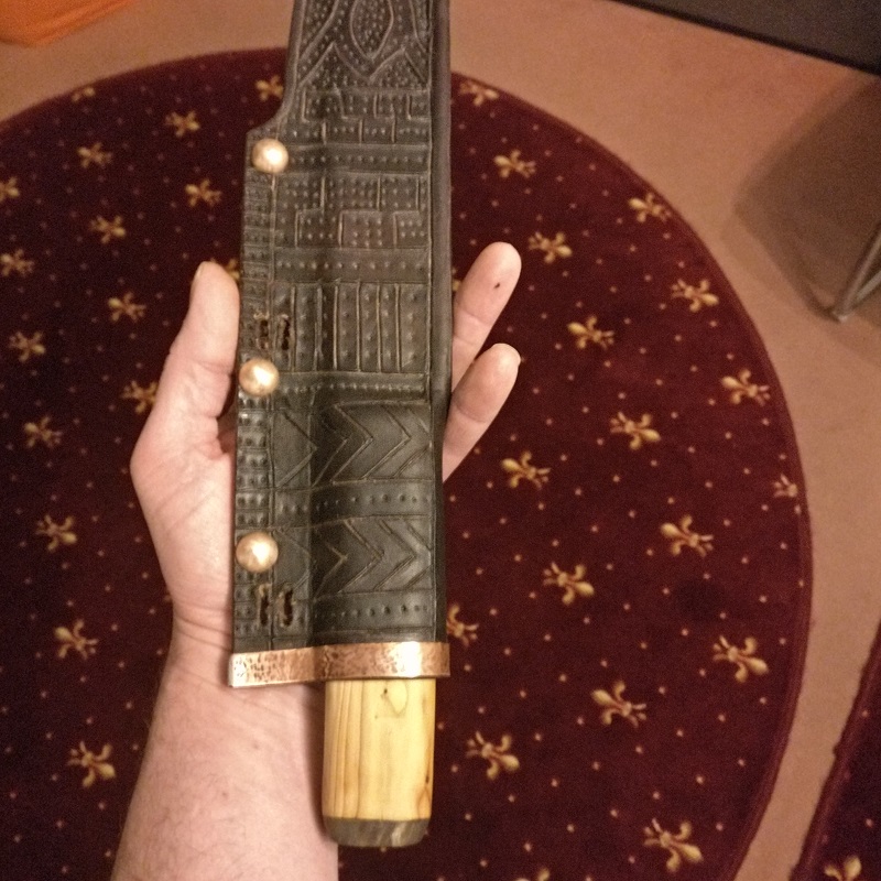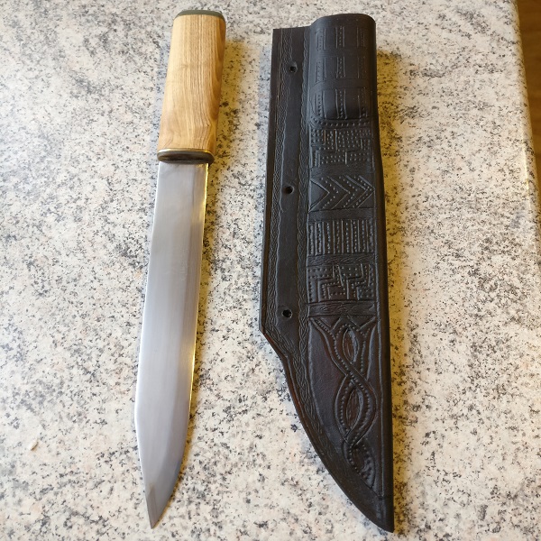 Wieder ein altes Sägeblatt benutzt und ähnliche Bauweise der Saxscheide aus natürlich gegerbtem Leder mit 3mm Stärke.