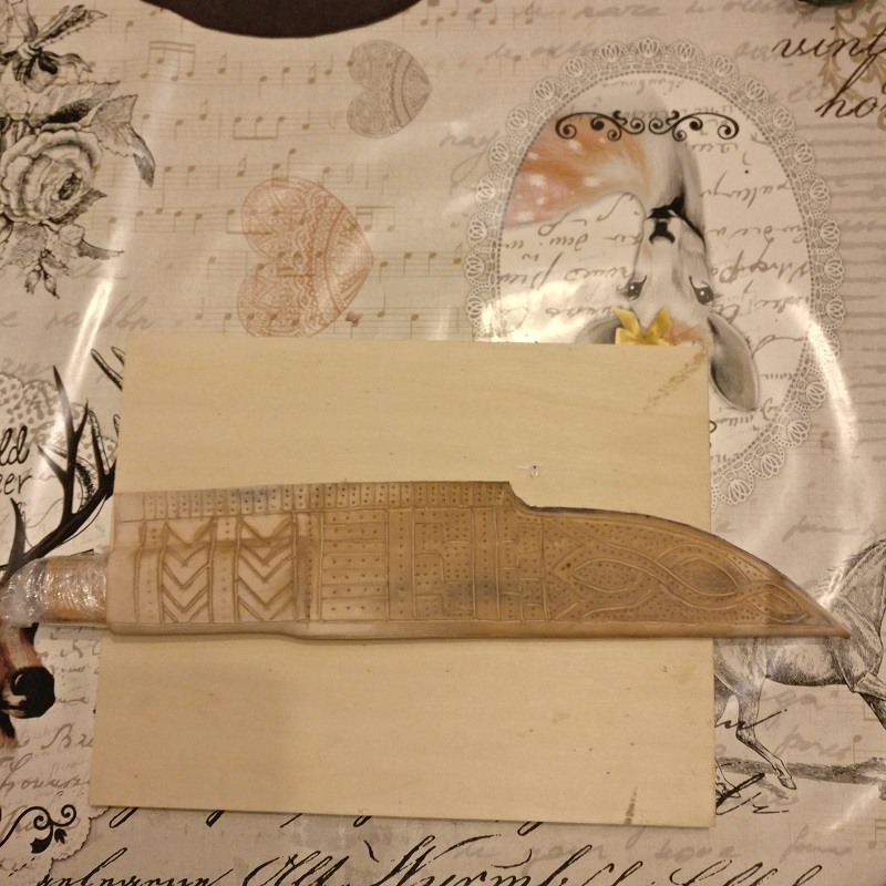 Die meiste Arbeit macht die Saxscheide mit den Verzierungen, einlegen in Wasser, pressen, und die verzierungen vorzeichnen, einschneiden mit dem "Lederswiefel" und anschliessend nochmals mit dem Kugelpin nach drücken. Am besten Fungernägel kurz schneiden, sonst sind schnell auch die auf dem Leder. Anschliessend wieder mit Lederfarbe bestreichen und kräftig mit Fett einreiben. (Motorradkombifett) Der Griff aus Eibe und einem kleinen Stück Horn von einem Allgäurind. Die Angel geht komplett durch den Griff bis hinten zu Horn.