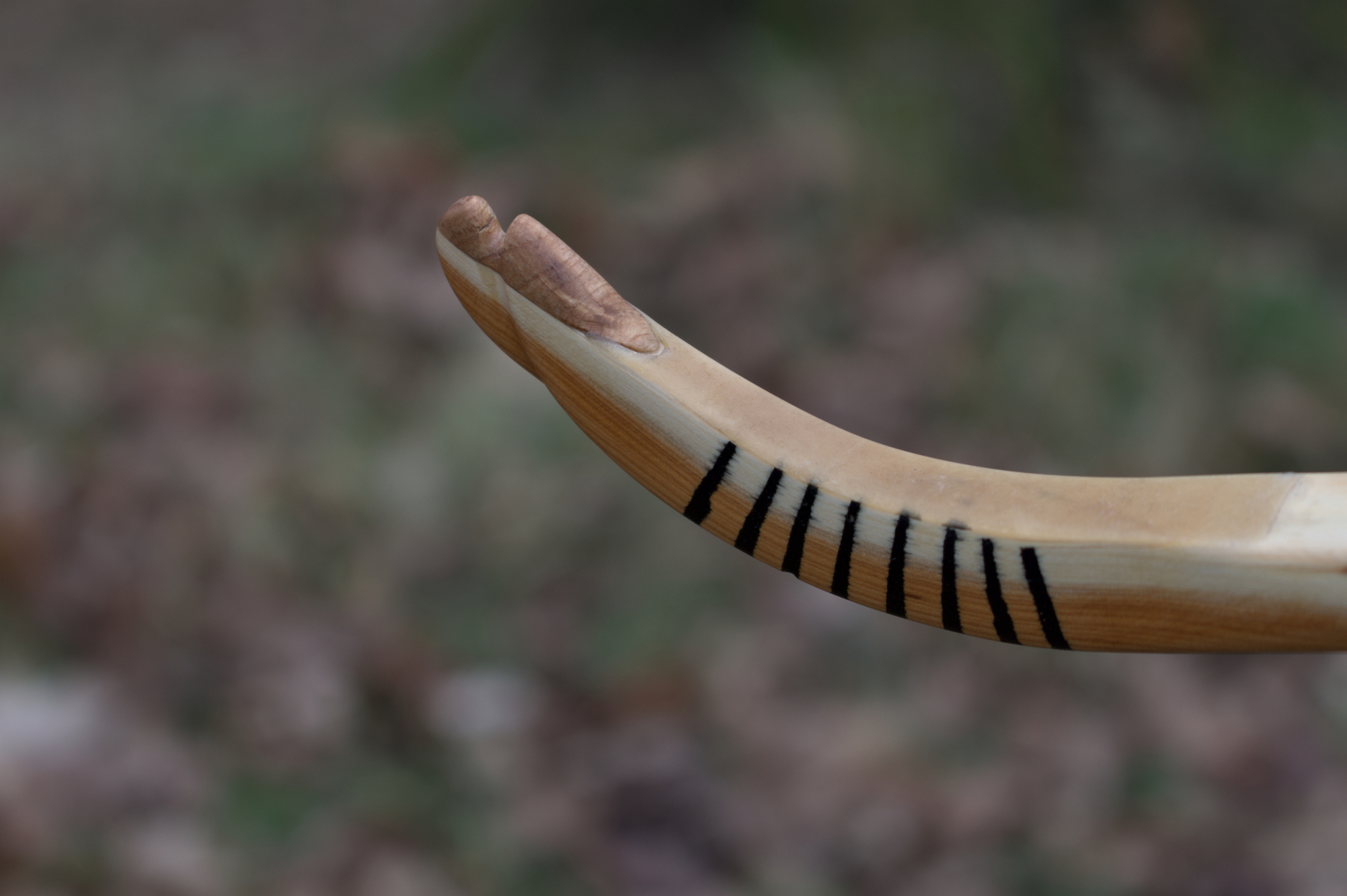 Die Recurves sind bewusst schmal und dick gehalten, habe sie durch Einsägen und Auffüllen mit Zahnstochern und Epoxy + Kohlenstoffigment gebogen. Die Rohhaut soll nur etwas unsaubere Sägeschnitte verdecken. Seltsame Technik, aber erfüllt ihren Zweck sehr gut.