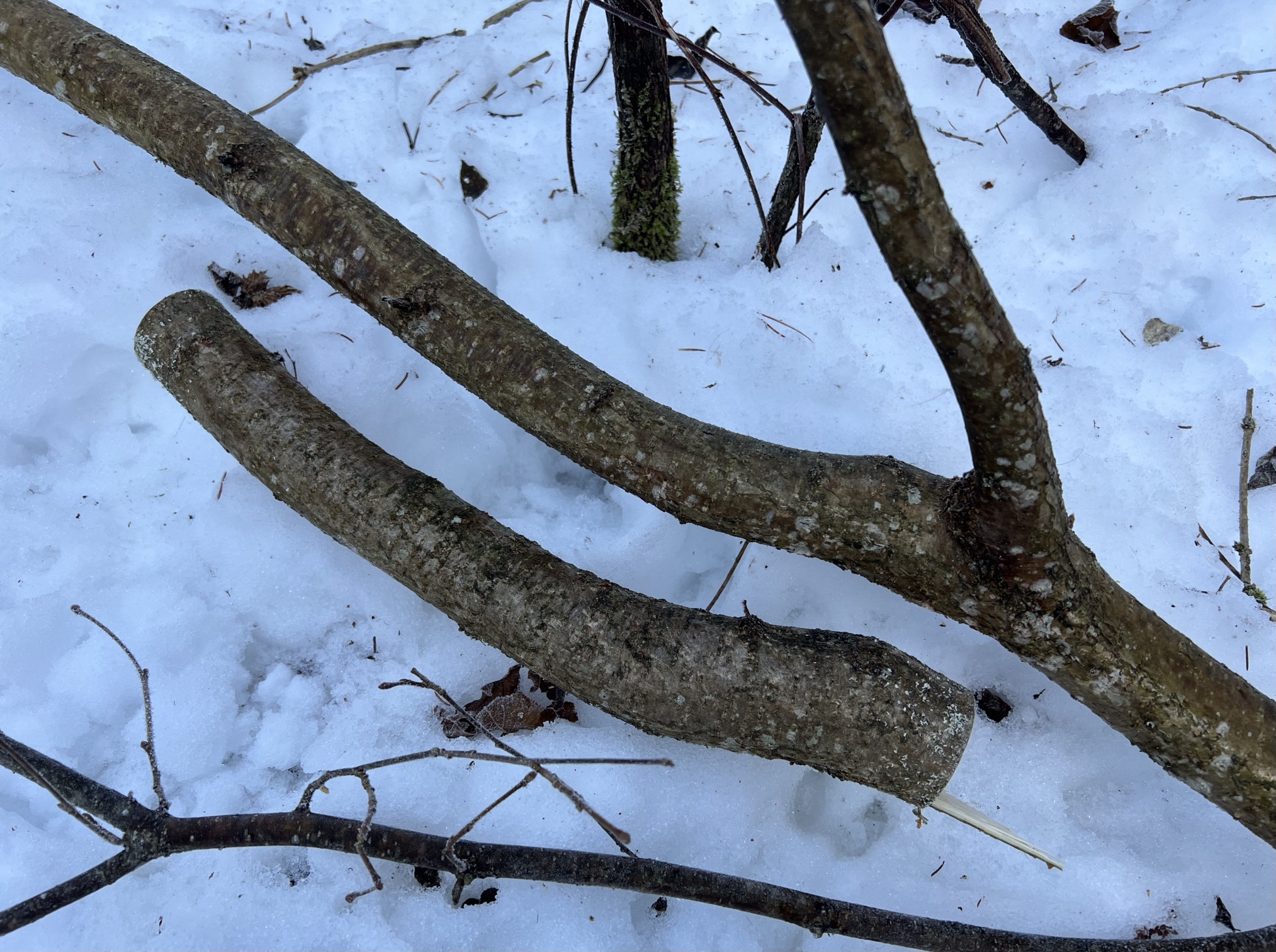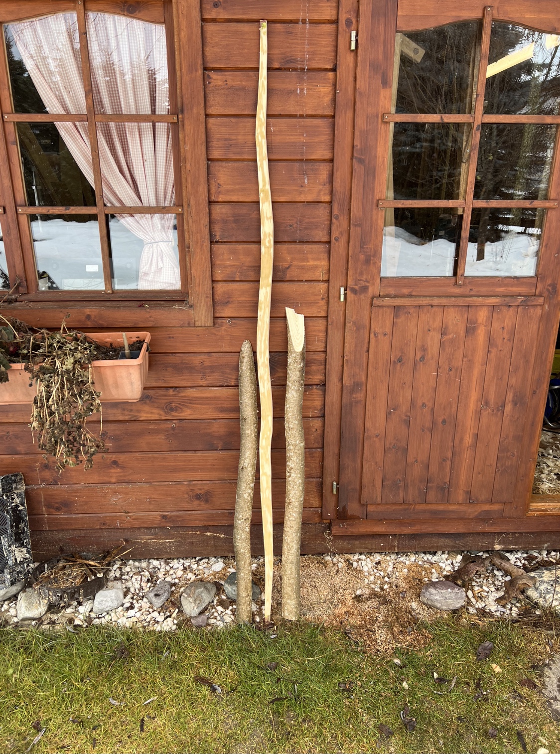 Bei uns gibt es ja noch Winter mit Schnee. Heute -5 Grad, die Rehe im Wald haben mich begleitet, natürlich immer mit Sicherheitsabstand. Geerntet habe ich 2x Holler, einmal gemeinen Flieder und einmal Hasel (super snaky) was schlägt Ihr vor: Langbogen oder Flachbogen? Aus den mit geernteten Haselabschnitten hab ich auch so eine Idee, sage ich aber noch nicht, aus dem dicken Holler ginge ein Paddelbogen, aus dem dünnen Holler und aus dem Flieder vielleicht ein hollow limb design. Alles nur Ideen und man muss sehen, was von den Saplings und von den Ideen nach dem Trocknen überbleibt und welcher Bogen es bis zur Präsentation schafft. Beim Langlaufen habe ich einen Gemeinen Schneeball entdeckt. Der Strauch steht unter einem Laubdach und hat schöne Schösslinge hervorgebracht. 6 davon habe ich heute mit geerntet und sollen nebenbei zu Pfeilen verarbeitet werden
