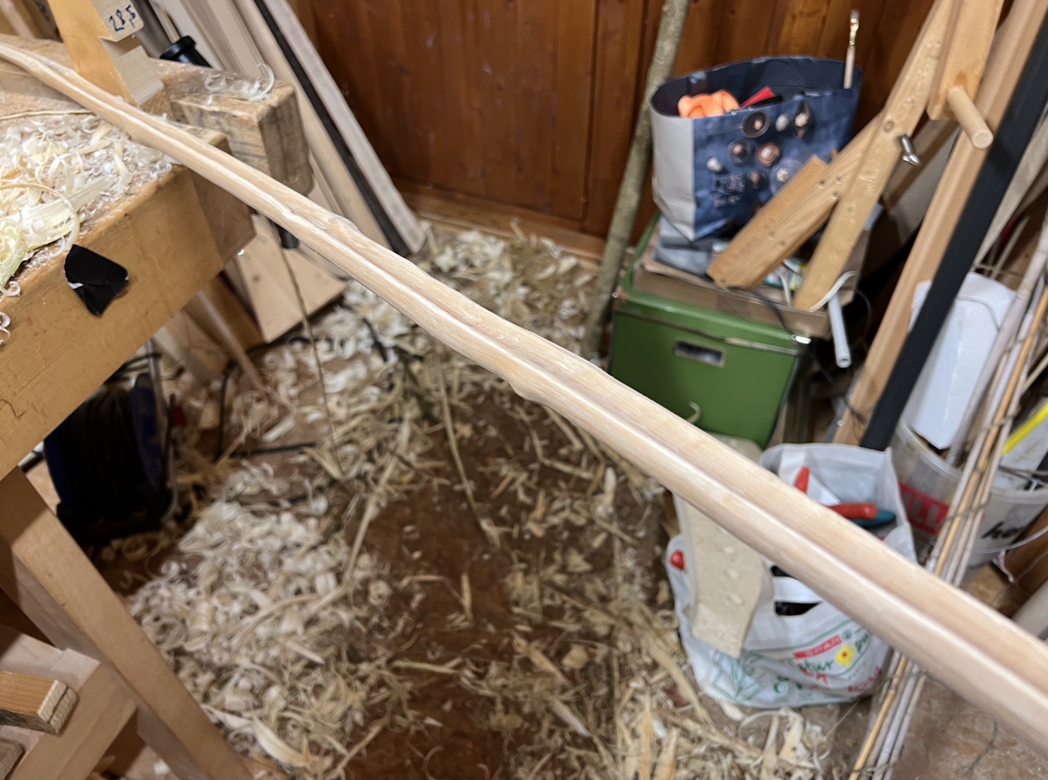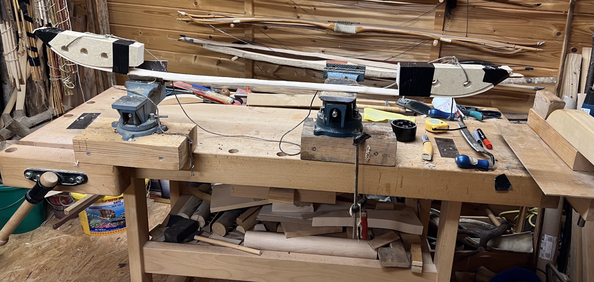 Danke für die Tipps! Werde es versuchen. Der Schlangenbogen ist der Hasel den mir die Rehe gezeigt haben. Der dünne Holler die Dachrinne (HLD). Der Dicke Holler hatte das viele Gammelholz im Kern, habe das Gammelholz beim Herunterarbeiten auf einen 1cm vollständig weggekommen, wird ein Paddelbogen im Design der Westküstenindianer. Aus dem Haselabfall wird jetzt ein Osmane (zumindest im Kopf). Da Epoxy verwendet werden darf, sollte der Rahmen in 2 Tagen soweit fertig sein, dass die Sehnen …….., schauma, LG Stephan