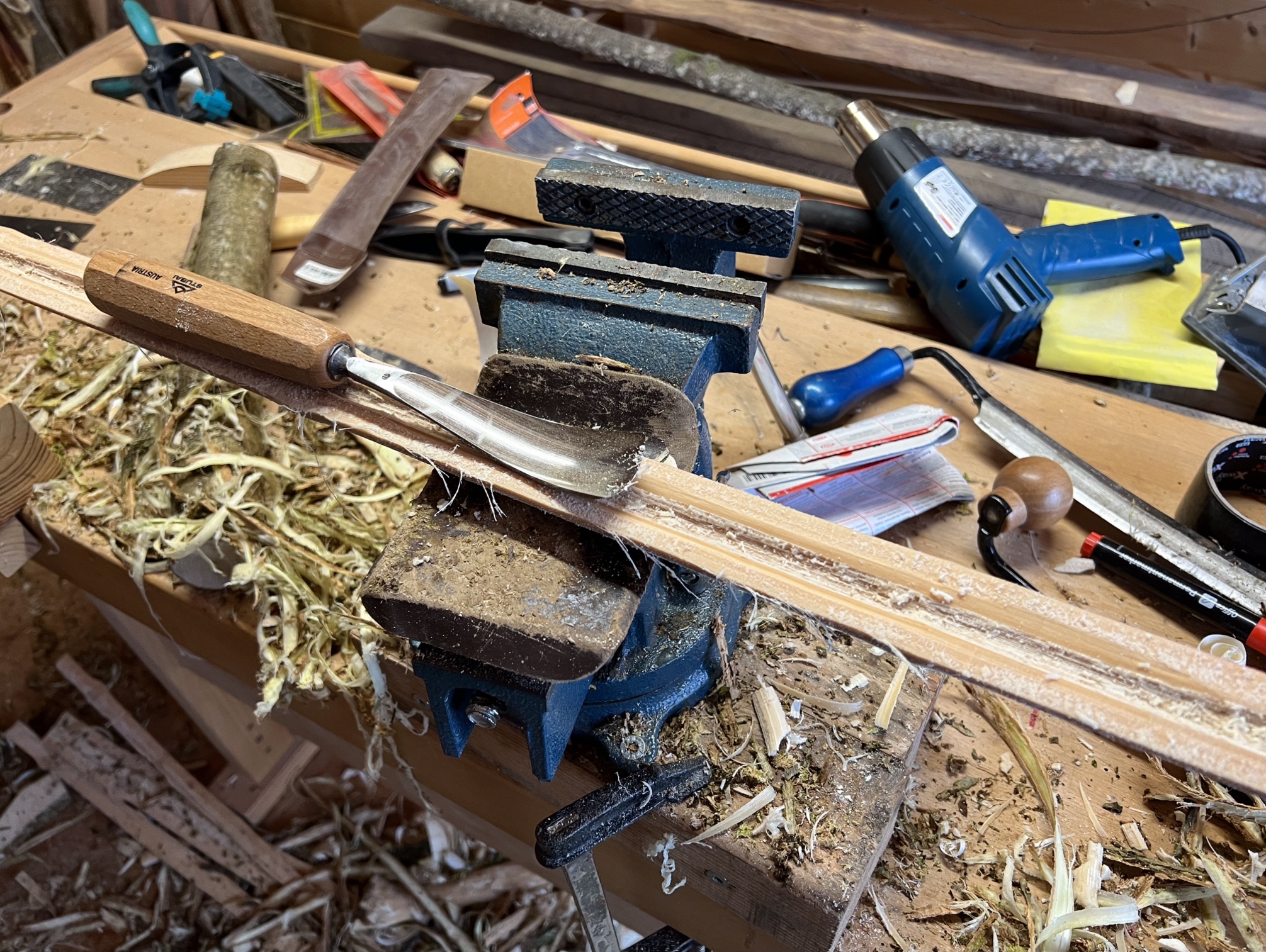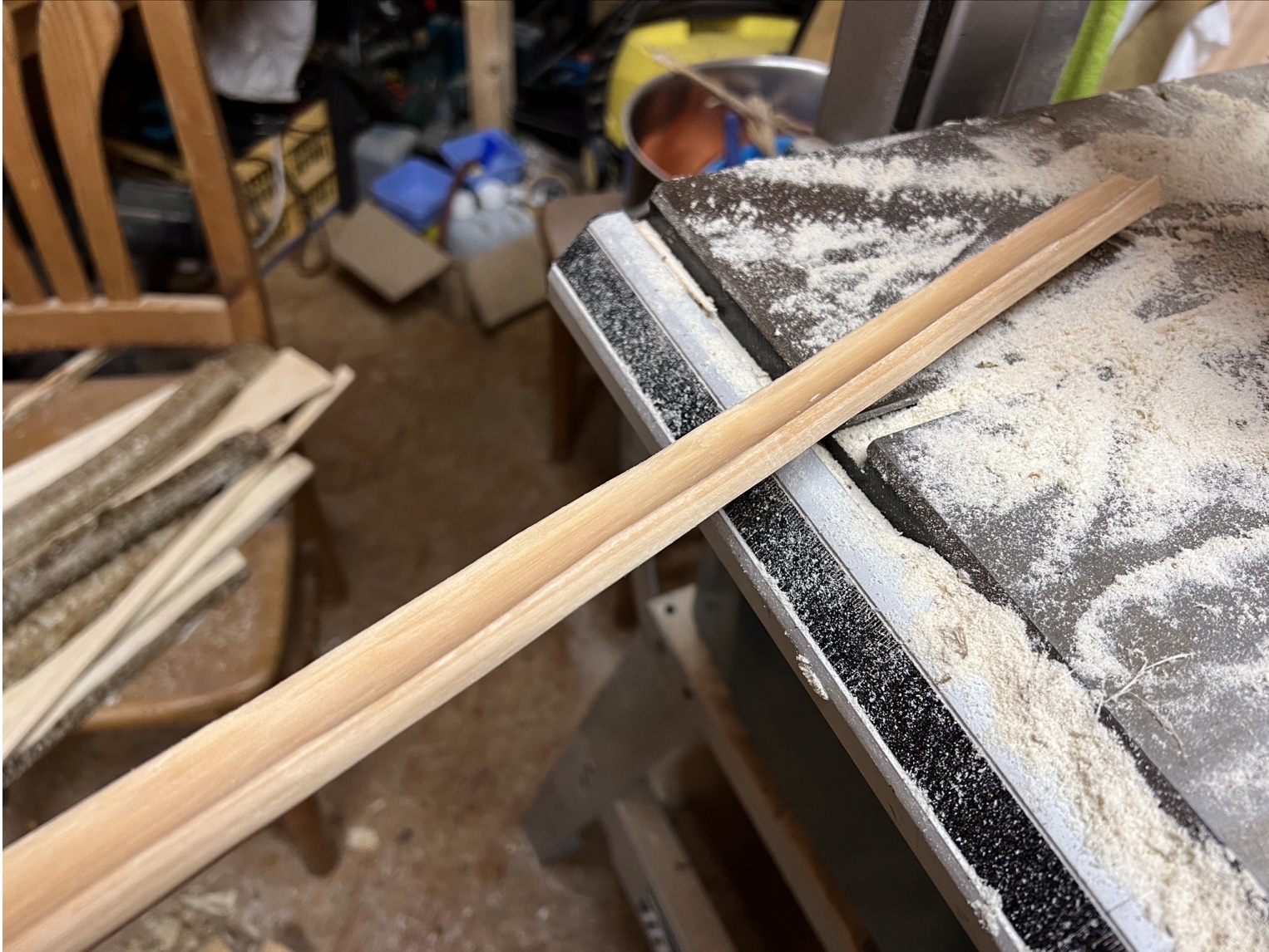 Und mit dem kleinen Holler gehts weiter: Schälen, Halbieren mit der Bandsäge, und Aushöhlen, Hollow limb design, habe ich noch nie gemacht, 170cm, 3cm breit im Griffbereich, auf 1,5cm an den Bogenenden getapert, die Dicke habe ich nur gering verjüngt, der Griff biegt mit, die Griffgestaltung wird aber mit dem Dachrinnendesign interessant. Beim Hasel wars eine Stunde Arbeit, bei der Dachrinne aber 2,5 Stunden, beim Paddelbogen waren es auch 2,5 Stunden Schnitzen und Biegen, nasses Holz läßt sich bearbeiten wie Eibensplint (cremig) und beim Sägen staubt nix!