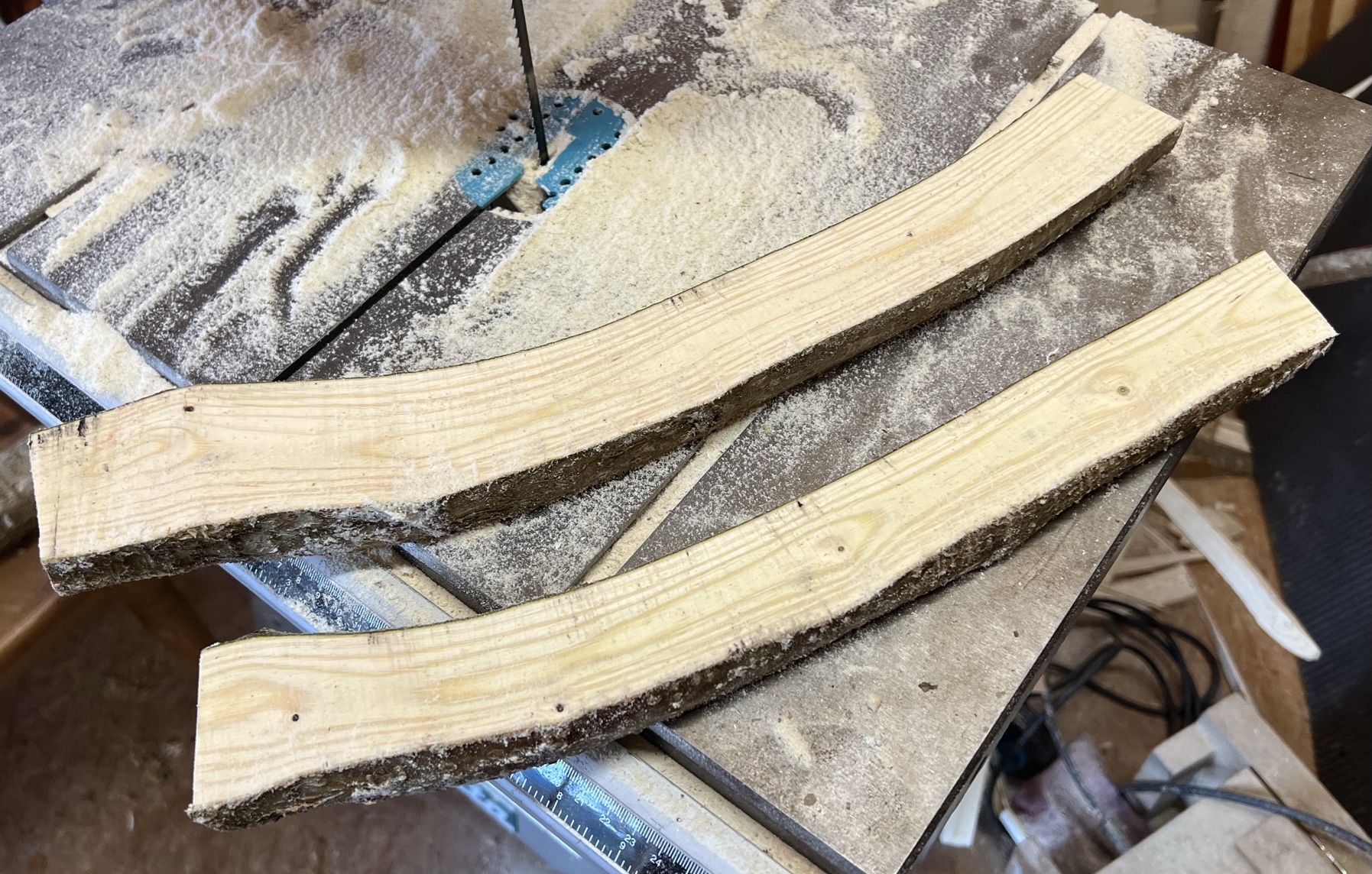 Weiter gehts mit dem Hasel. Mit der Bandsäge halbiert, Anzeichnung: Langbogendesign, Länge 192cm, Griff 4cm breit, 3 cm dick, getapert auf 2cm x 1,6cm, Rinde ab mit der Ziehklinge und dem Küchenmesser, die Enden mit Leim versiegelt, gewogen und ab in die Waschküche. Schöne Schlangenform