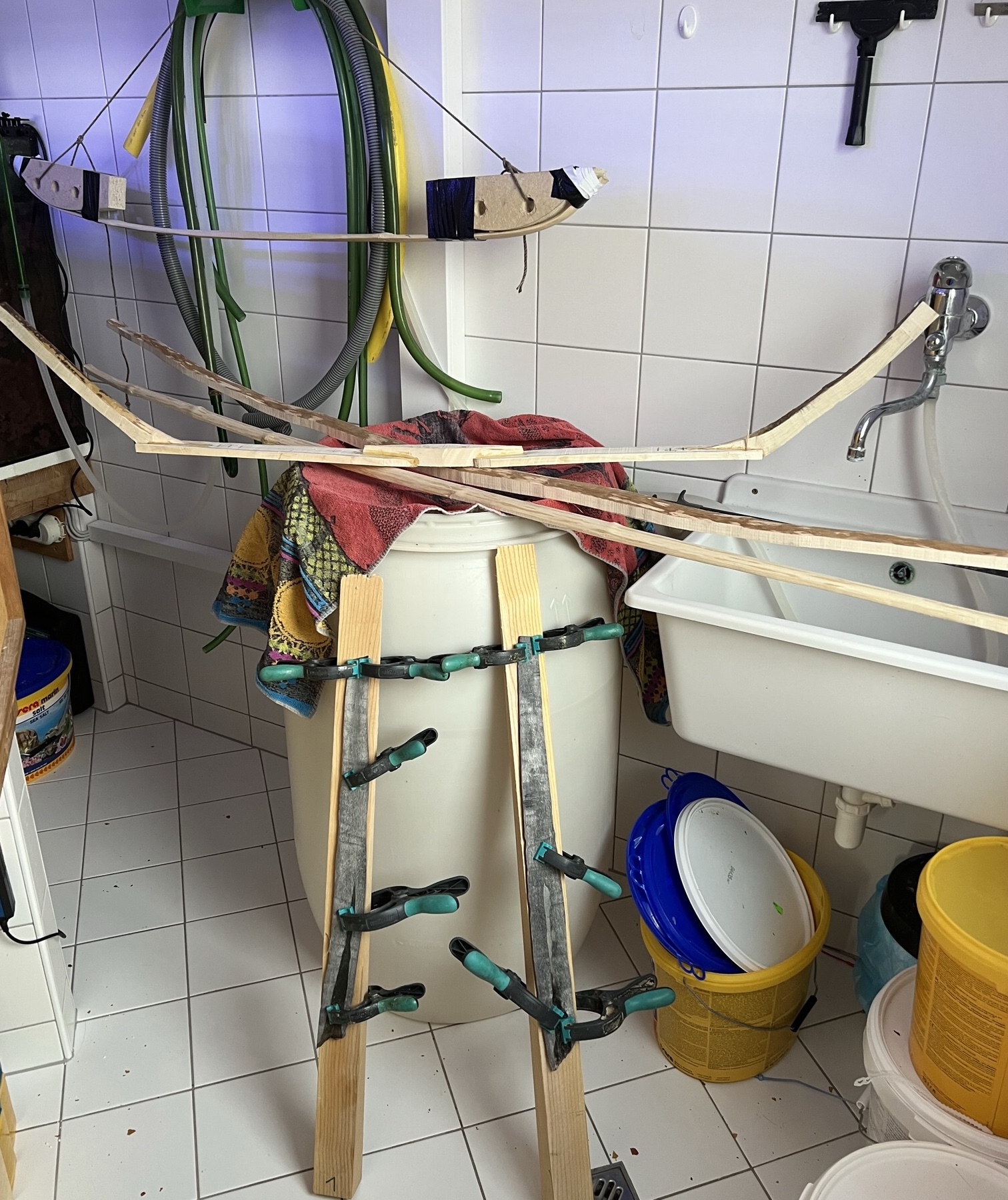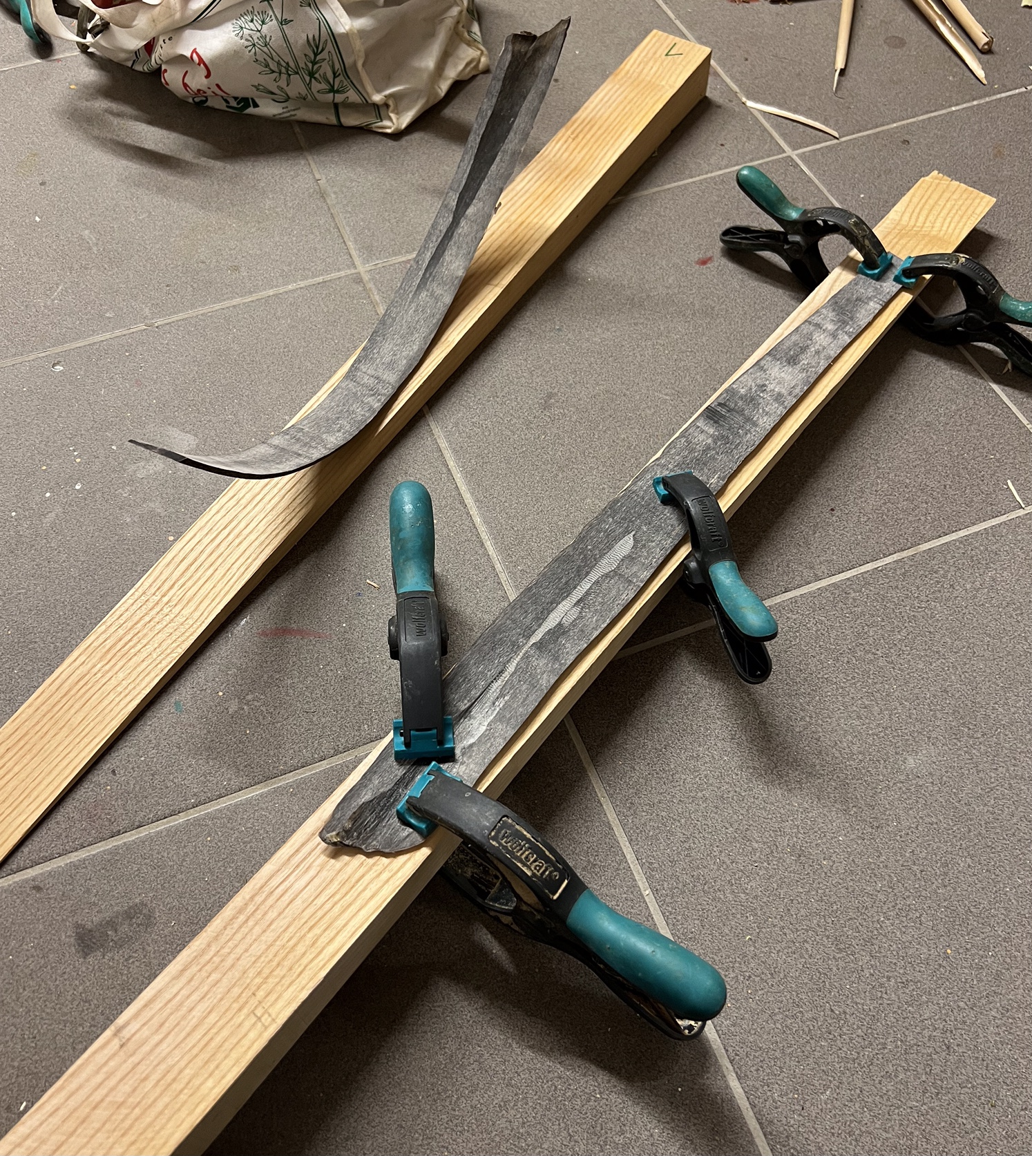 Den Rahmen fertig verklebt. Die selbst geschnittenen und geschliffenen Hornplatten mit Heißluft flach gebogen und am Holzbrett fixiert. Alles in die Waschküche, Holz zum Trocknen, Horn zum Rehydrieren. Morgen den Holzrahmen schleifen, den Bereich des Kasanauges verschmälern um gezielt den fehlenden Reflex in diesen Bereich zu biegen, in einen stabilen Rahmen klemmen und das Horn Aufkleben (Uhu Endfest 300). Am Donnerstag Sehnen klopfen, Zerfasern und Aufkleben mit Hasenhautleim gemischt mit Fischleim, alle Schichten auf einmal, dann in die Sauna bei 50 ° den überschüssigen Hautleim Abtropfen lassen. Nach vollständigem Abkühlen die Hosengummiwicklung entfernen und 4 Wochen trocknen lassen. Dann Finish. 35-40 Pfund Zuggewicht, nicht zuviel aber für mich passt es. Der Plan steht. LG Stephan