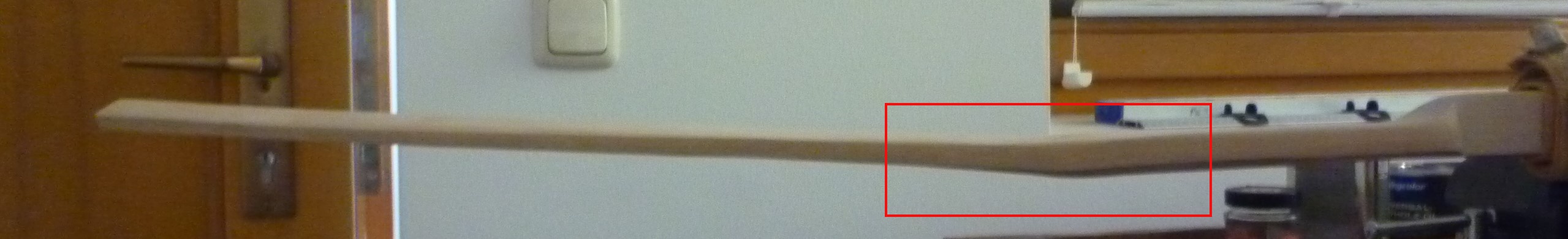Die Jahrringe sind recht dünn, aber 55# sollten kein Problem sein. Ich kann aber nur dringend empfehlen in Zukunft einen Bogen für 28" nicht so kurz zu bauen. Wenn man bedenkt dass noch 22 cm des unnötig langen Griffes wegfallen und eigentlich auch noch je ca. 10 cm am WA-Ende, ist die Gesamtlänge 166 cm sportlich. Außerdem ist Esche nicht gerade drucktolerant und sollte deswegen lang gebaut werden.