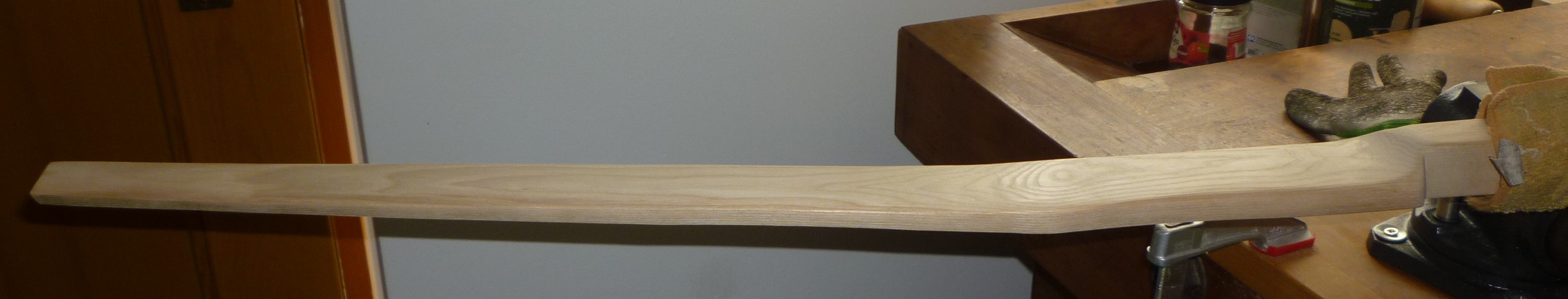 Jetzt bin ich schon etwas weiter. Die Wurfarmbreite habe ich auf ca. 2 Zoll an den Fade-outs und 1/2 Zoll an den Tips reduziert. Den Griffbereich habe ich noch nicht verkürzt, weil dadurch die Fade-outs bereits auf Höhe des schon relativ schmalen Griffbereiches beginnen würden, ist das bei Esche nicht ziemlich riskant?