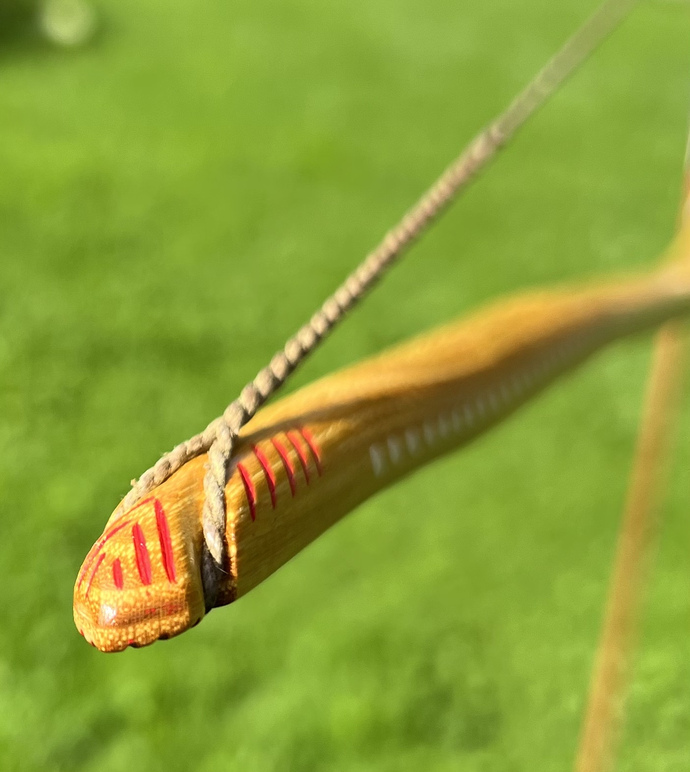 Griffleder aus hirngegerbtem Hirschlederstreifen fixiert mit gewachstem roten Leinenfaden