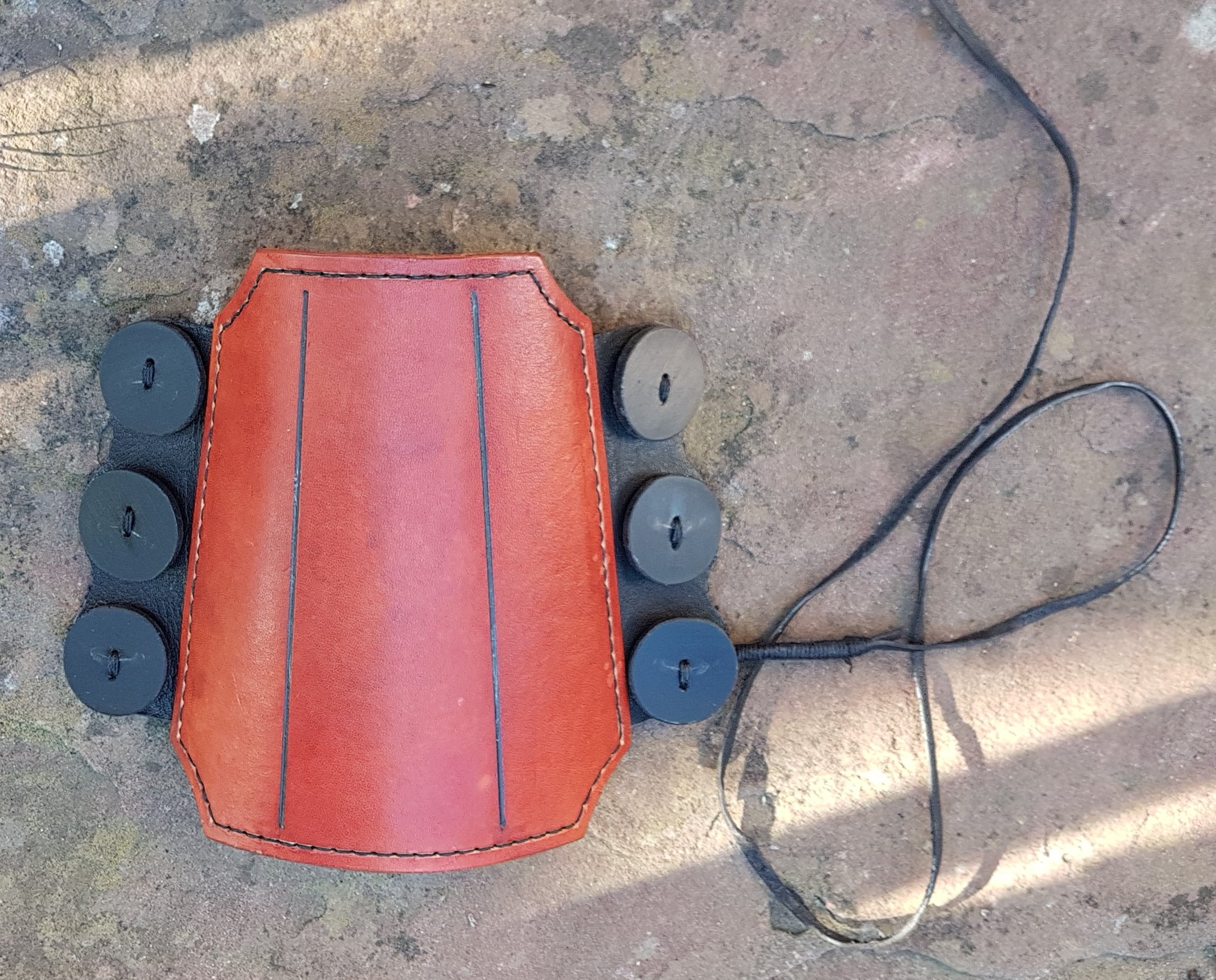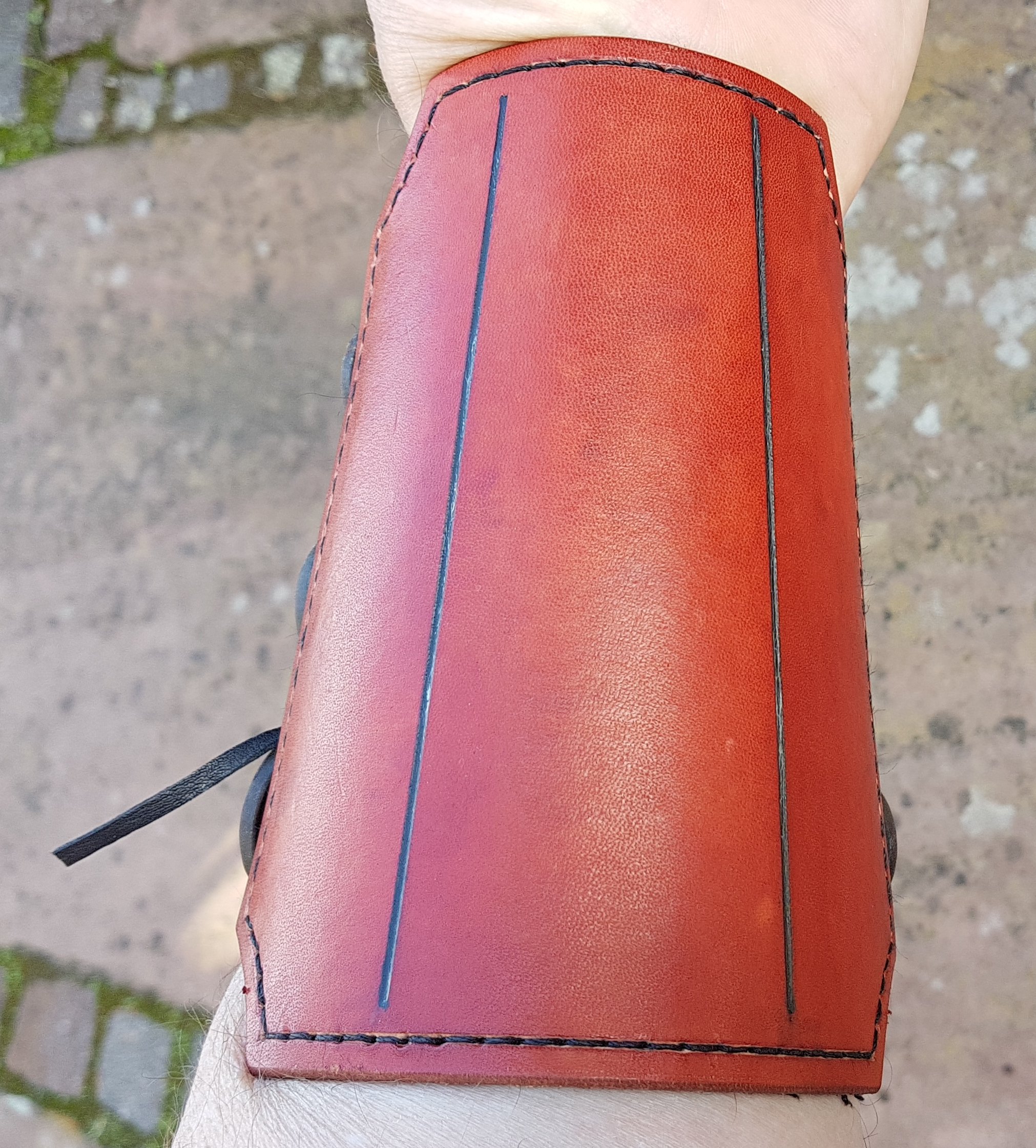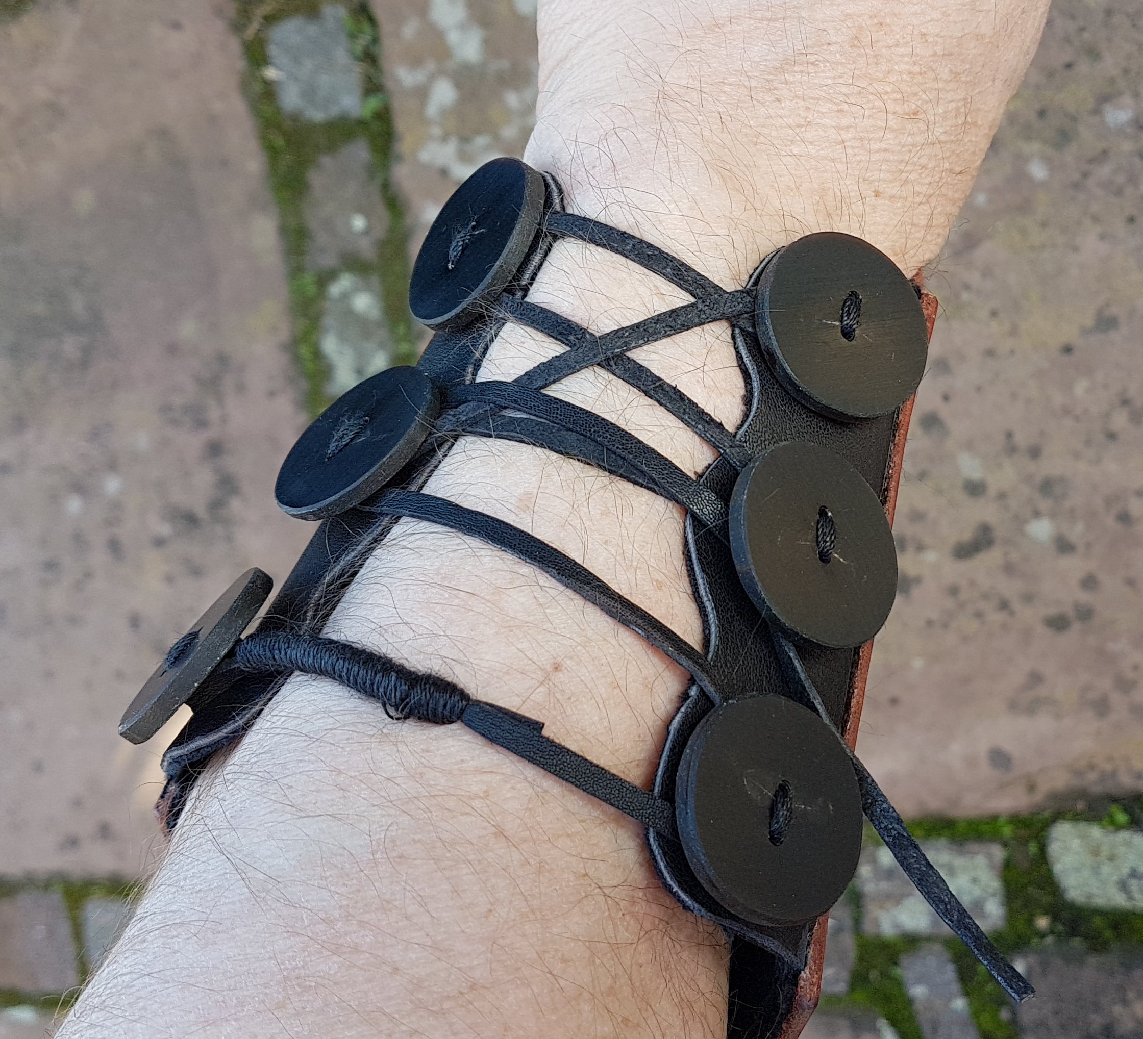 Und ein neuer Bracer sollte auch mal her. Nachdem ich verschiedene Befestigungs-Methoden getestet habe, bevorzuge ich ganz klar die Lederband-Knopf-Variante, wie hier zu sehen.