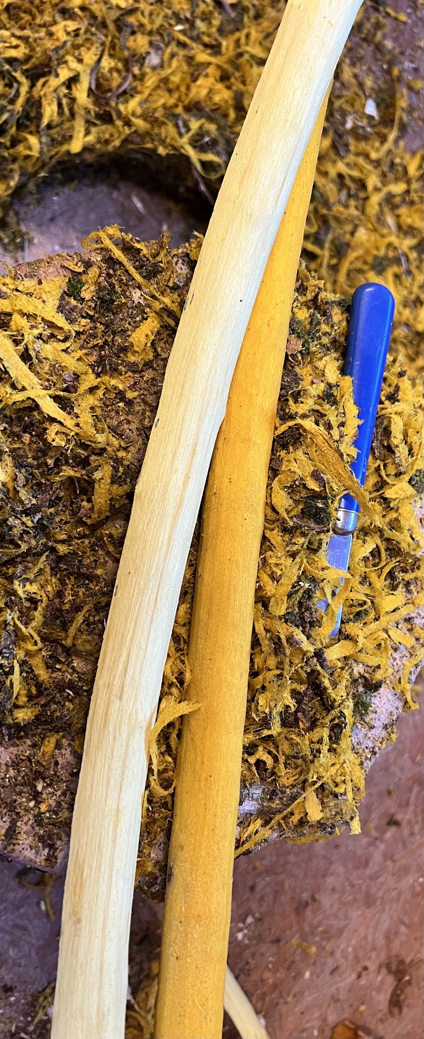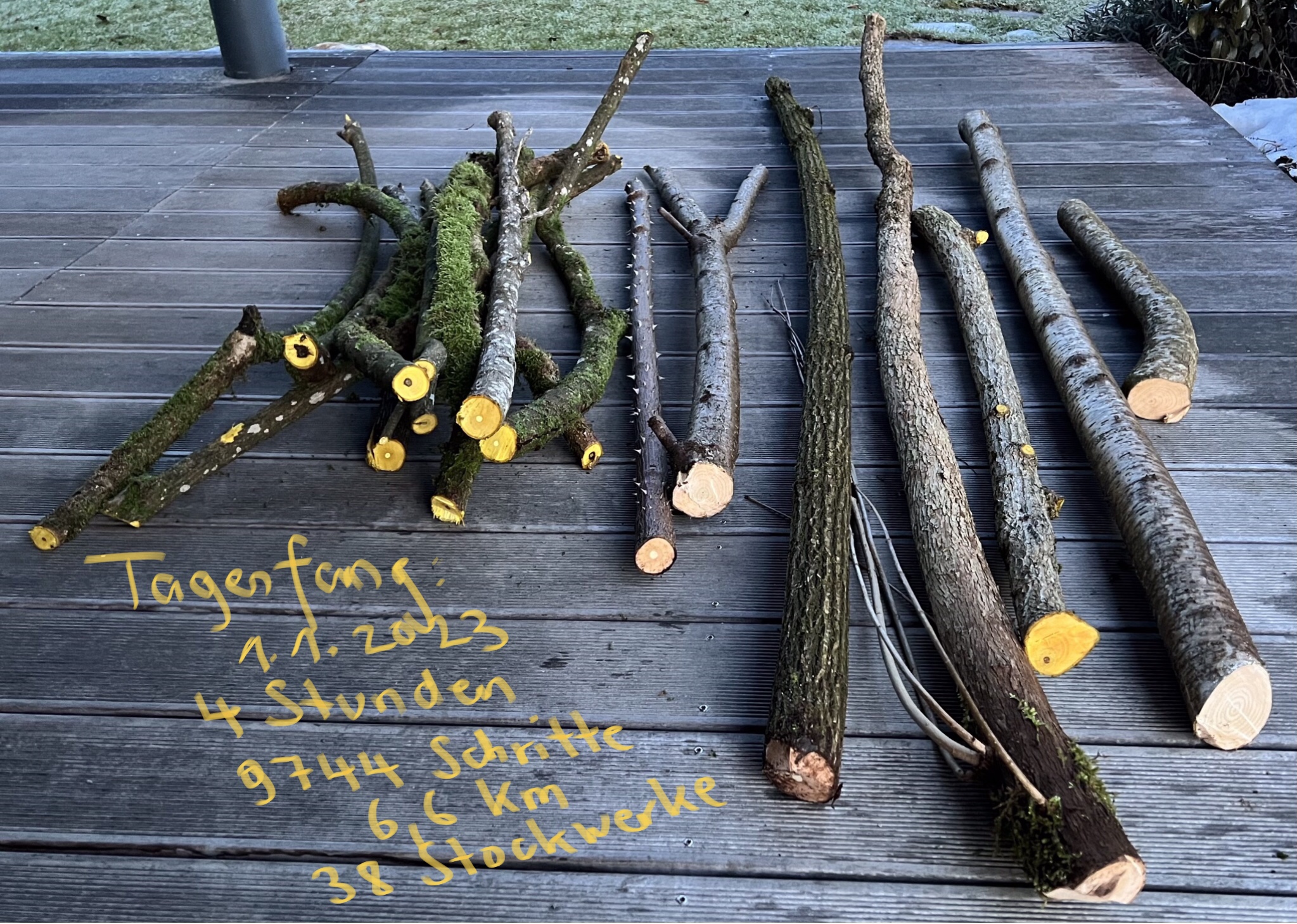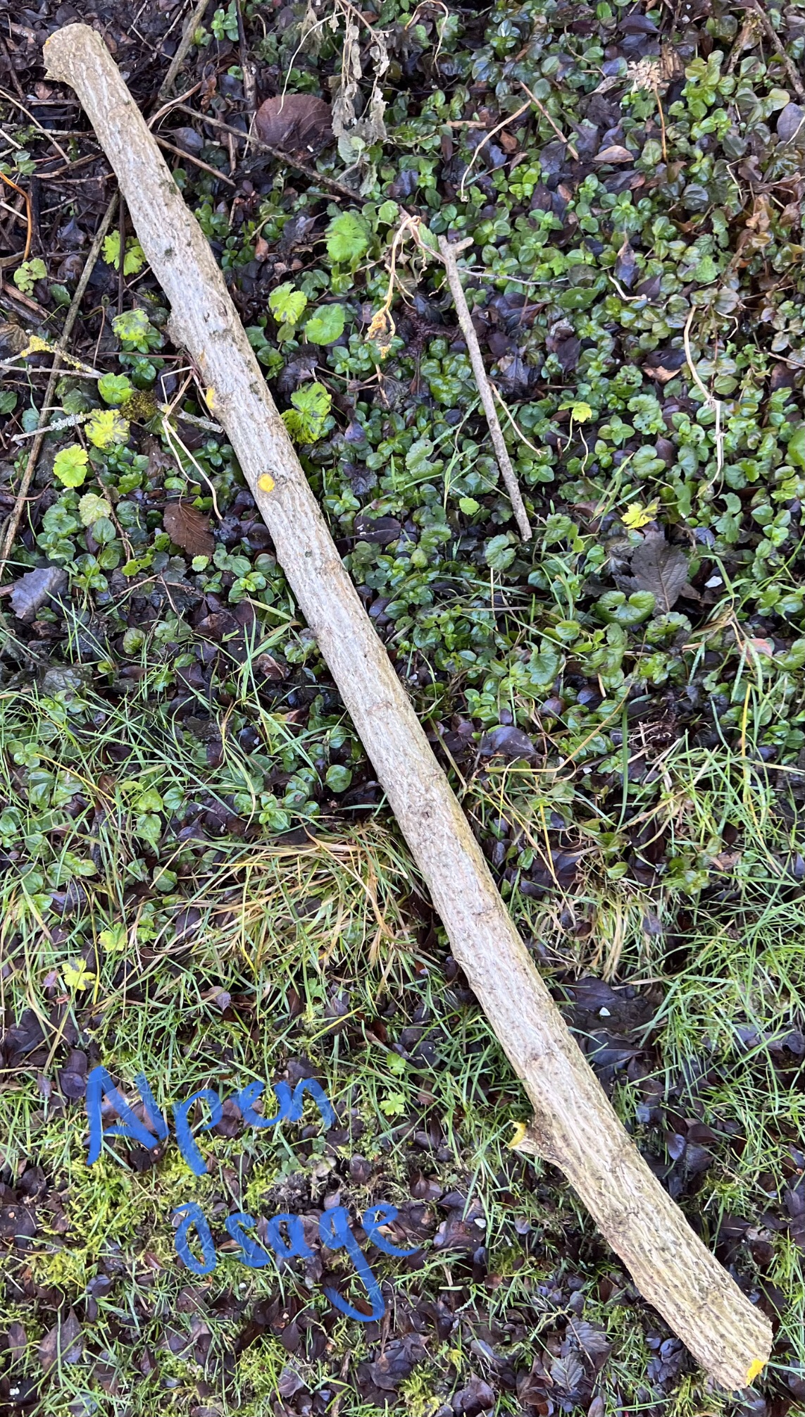 Meine erbeuteten Hölzer habe ich vorab bei Spaziergängen in einem Umkreis von 3km von zuhause ausgespäht und heute geerntet. Der schneearme Winter hat es möglich gemacht, dass ich auch Alpen Osage ernten konnte, da dieser strauchartig wächst und sonst immer eingeschneit ist. Es ist viel “Reißholz” dabei. Die nächsten Wochen werden zeigen, was davon übrig bleibt und in die Präsentation will. Aus diesem Grund sind auch 2 Reservehölzer (Hasel und Holunder) dabei. Ich wünsche allen gutes Gelingen.