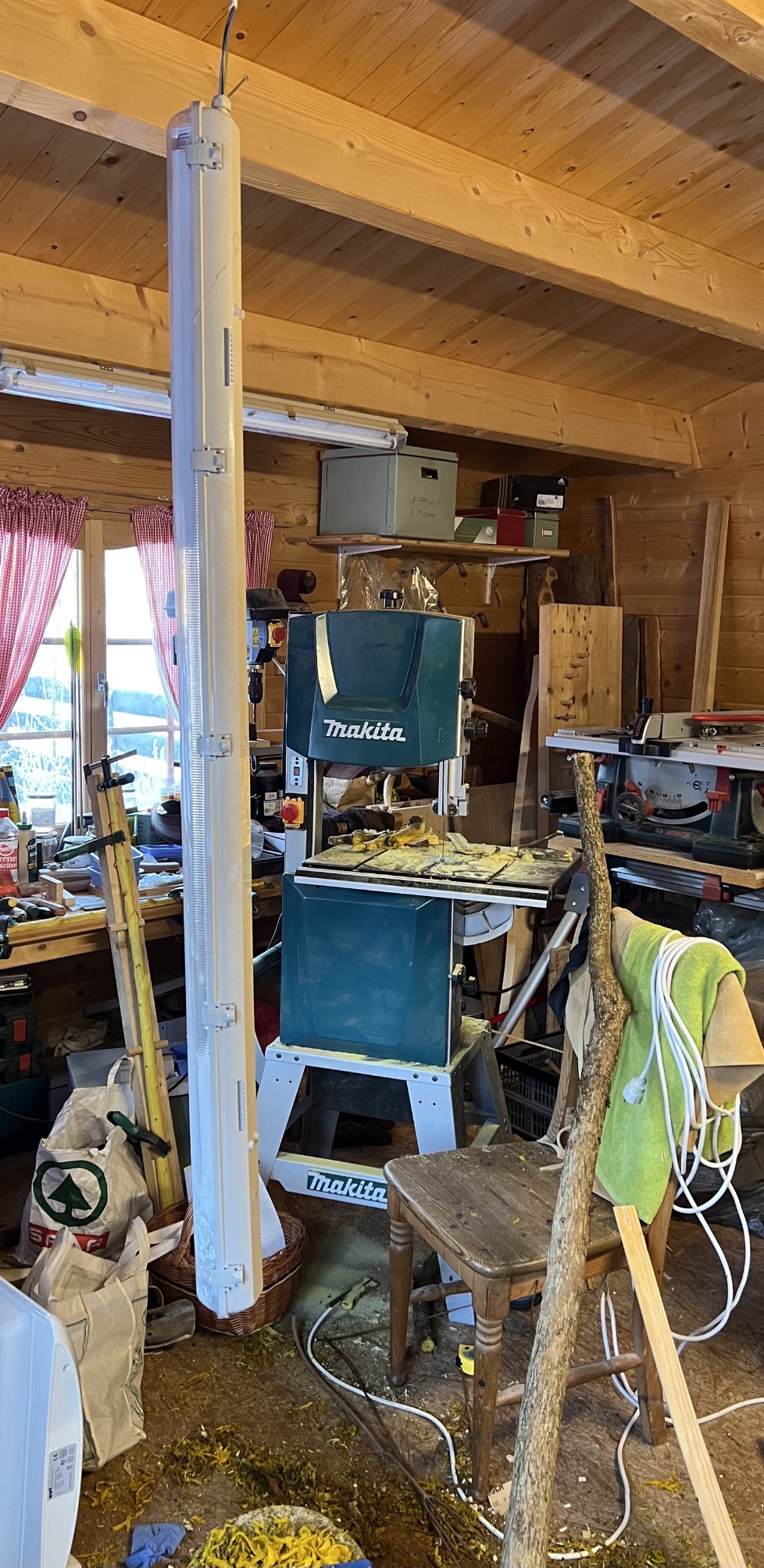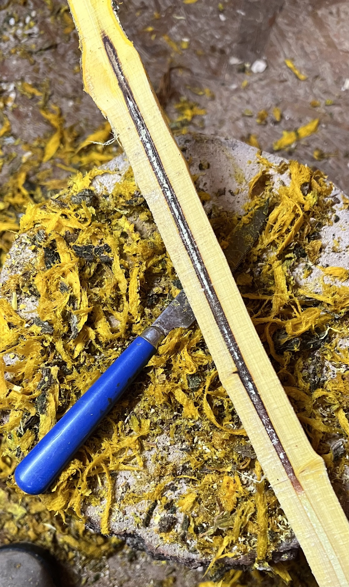 Nasser V Spleiß, läßt sich passgenau zusammenpressen. Das Entrinden ist ziemlich mühsam. Der Rücken brennt schon. Leider auch viel Gammelholz dabei, der Bast wäre am schönsten. Werde ihn bei einem Bogen drauf lassen. Mein Flieder hat die Lampe von der Decke geschlagen. Brauche einen neue Röhre. ;D