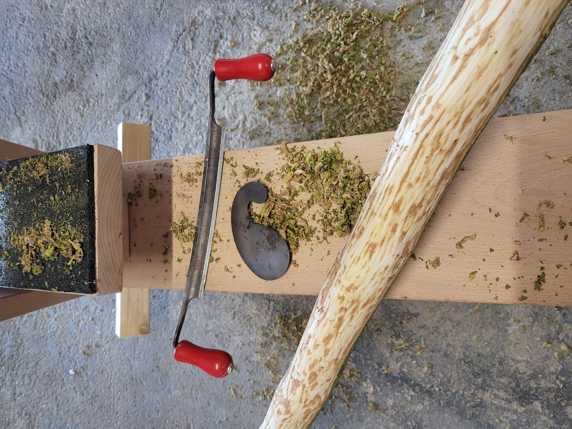 Kaum war ich daheim hab ich gleich mal begonnen ihn zu entrinden. Dafür hab ich den Rücken meines Reifmessers und eine Schwanenhals-Ziehklinge verwendet.