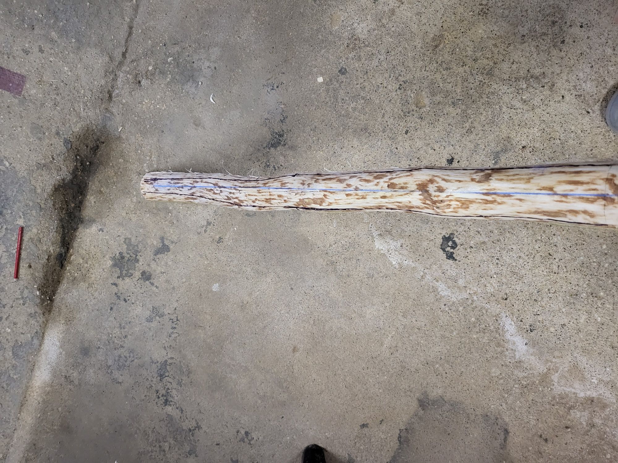 Dann hab ich die Enden verschlankt und in der Stärke reduziert. Dabei stellte sich heraus dass das Holz doch stärker verfärbt und getrocknet wurde als zu erkennen war. Beim Foto von der Seite aufgenommen erkennt man gut wie tief die austrocknung geht. Ich halte es für unbedenklich.