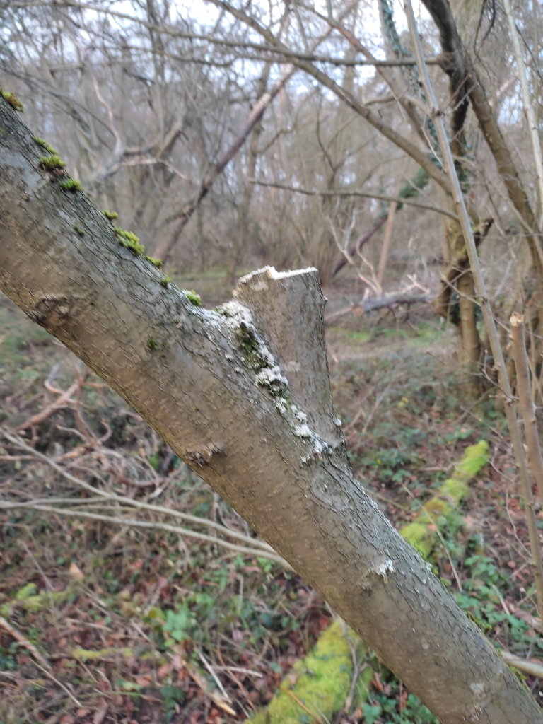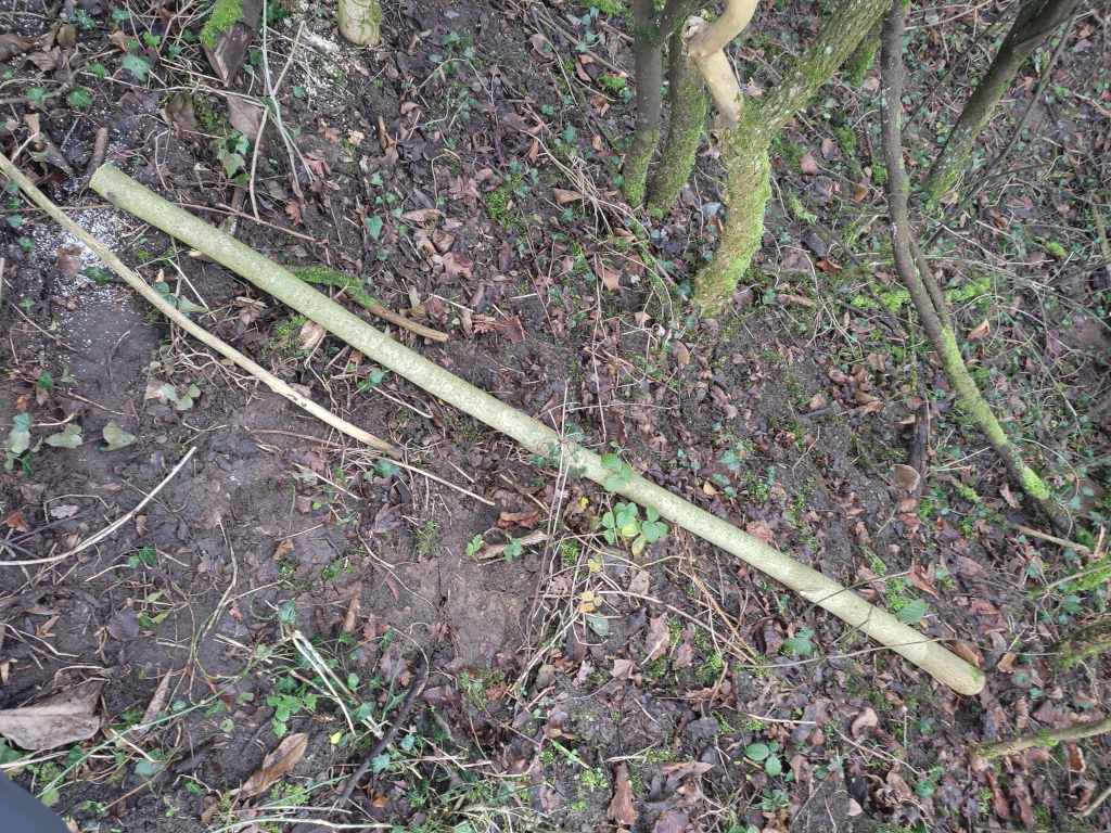 Eine kleine Walnuß. Blätter habe ich keine gefunden. Länge ca 225cm abgesägt. Ist unten der dickste der drei Kandidaten. Dann ein Hasel (Wassertrieb), hier habe ich keine Knospen fotografiert, Blatt sieht man bei Nr 2, aber dass das Hasel ist, sieht man. Hat über den Verlauf einen leichten Reflex.