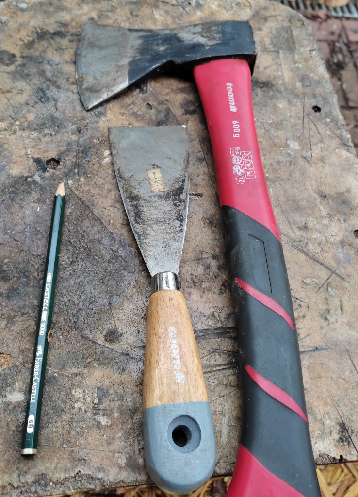 Hier die Bilder der bisher verwendeten Werkzeuge, unspektakulär. Klappsäge, Meterstab, Ziehmesser, Bleistift, Spachtel, Axt. Ein Foto sehr verwackelt, aber man erkennt es.