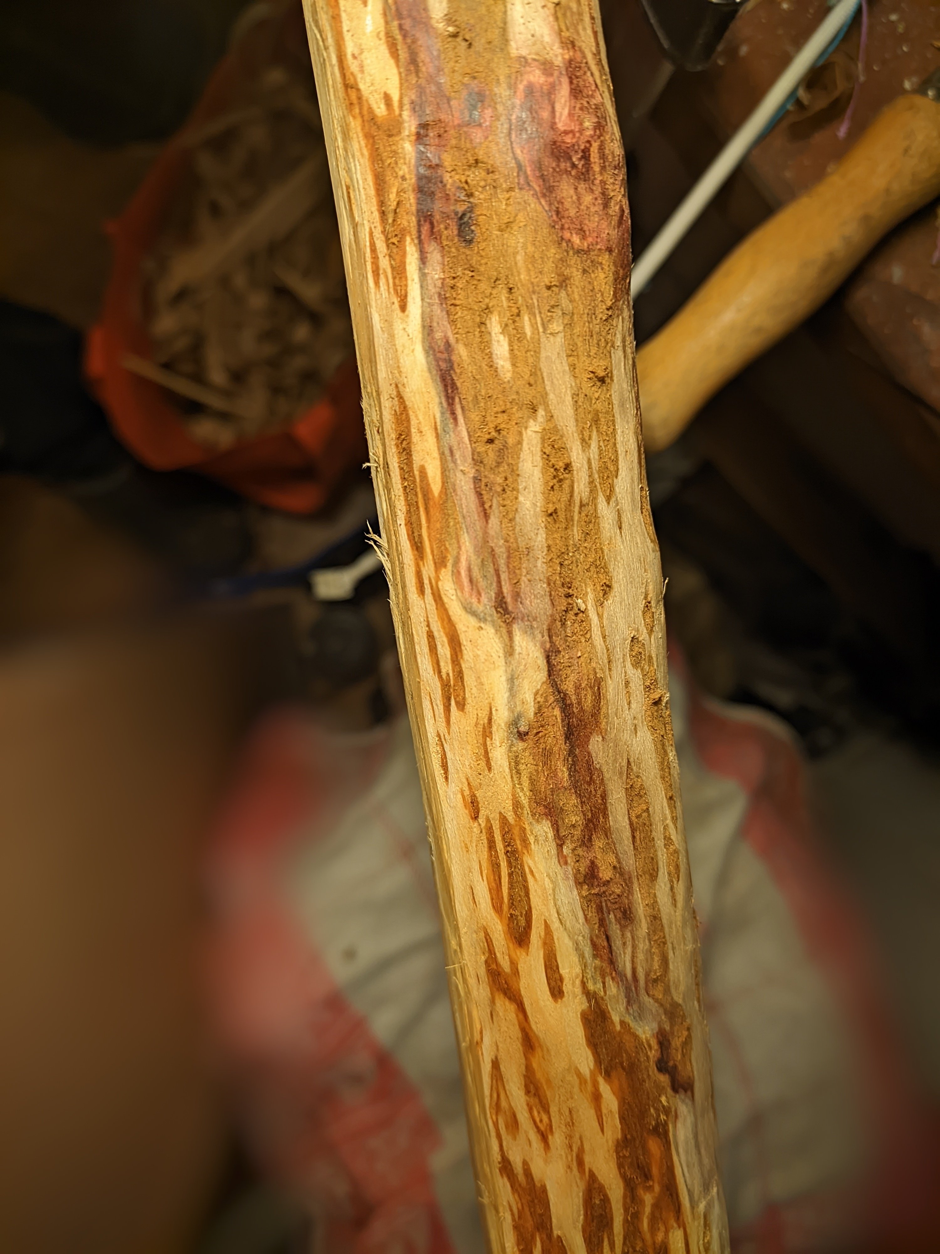 Nachdem ich gesehen habe, dass Schwarzdorn hier aber auch schon erfolgreich im Sap-Turnier verwendet wurde, habe ich den zweiten, um den es hier gehen soll, heute grob in Form gebracht und dem Rücken (unter größten Mühen) die Haut abgezogen. Dabei sind mir ein paar Dinge aufgefallen, die ich nicht so recht einordnen konnte und bei denen ich jetzt auf Rat und Weisheit hoffe.