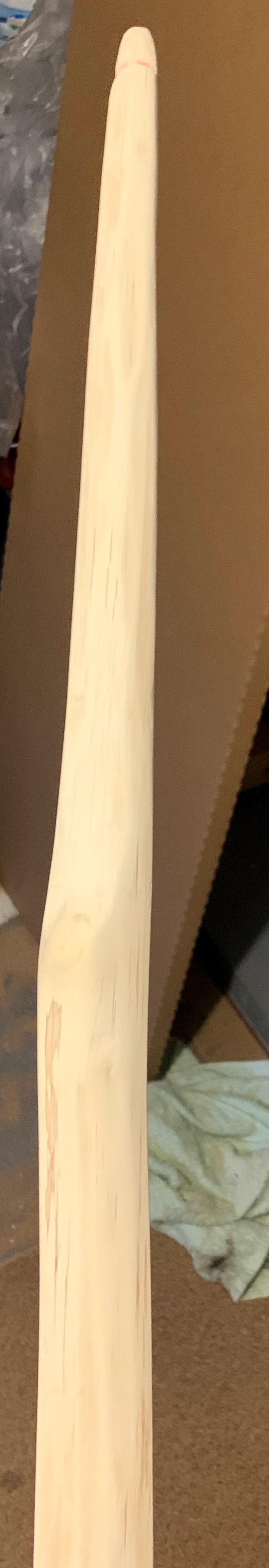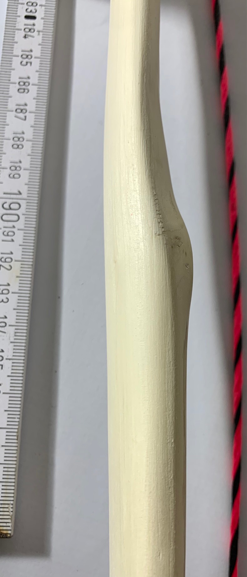 Die Frage ist nun, wie muss ich die Hasel korrekt tillern (links ist mir recht spät einmal das Ziehmesser ausgerutscht, das sieht man…) und können dann noch ca. 35-38 lbs übrig bleiben?