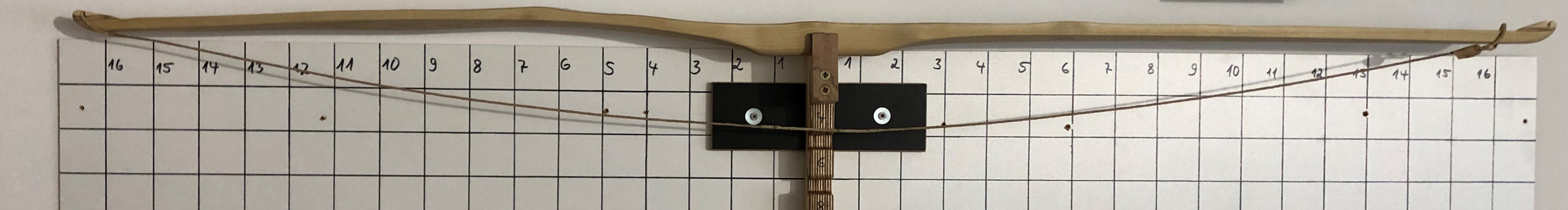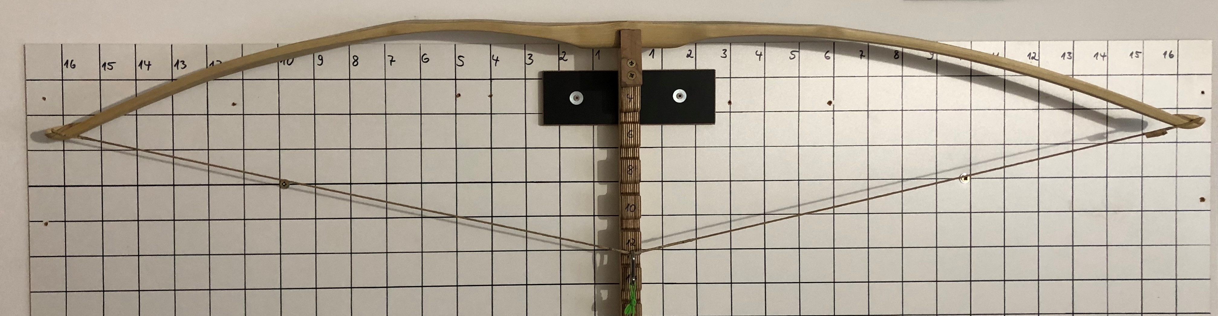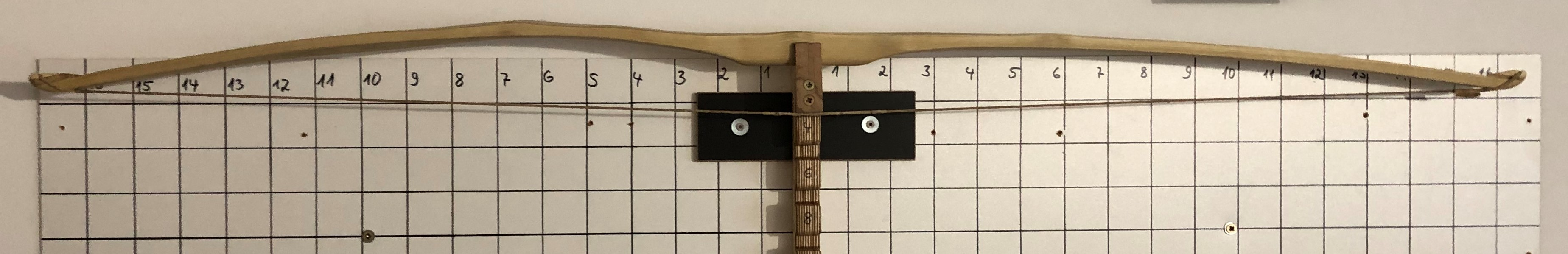 So sieht er abgespannt aus: Auf "niedriger" Standhöhe", d.h. die Tillersehne ist geringfügig kürzer als der Bogen: Und hier der Tiller bei Auszug 12'': Nach meiner Einschätzung biegt der untere WA (im Bild links) eigentlich nur an der deflexen Stelle, deshalb würde ich diesen zunächst nach dem FA (im Bereich 2 - 4) und im Bereich 8 - 12 (vielleicht auch bis 13) schwächen.