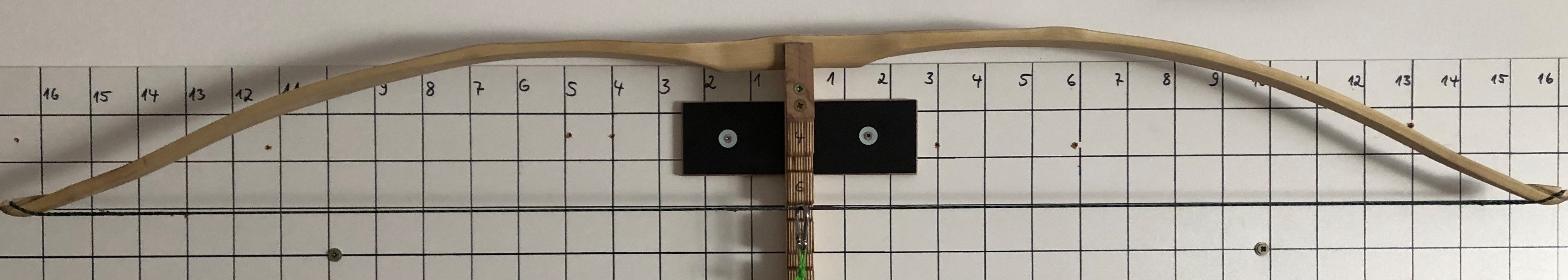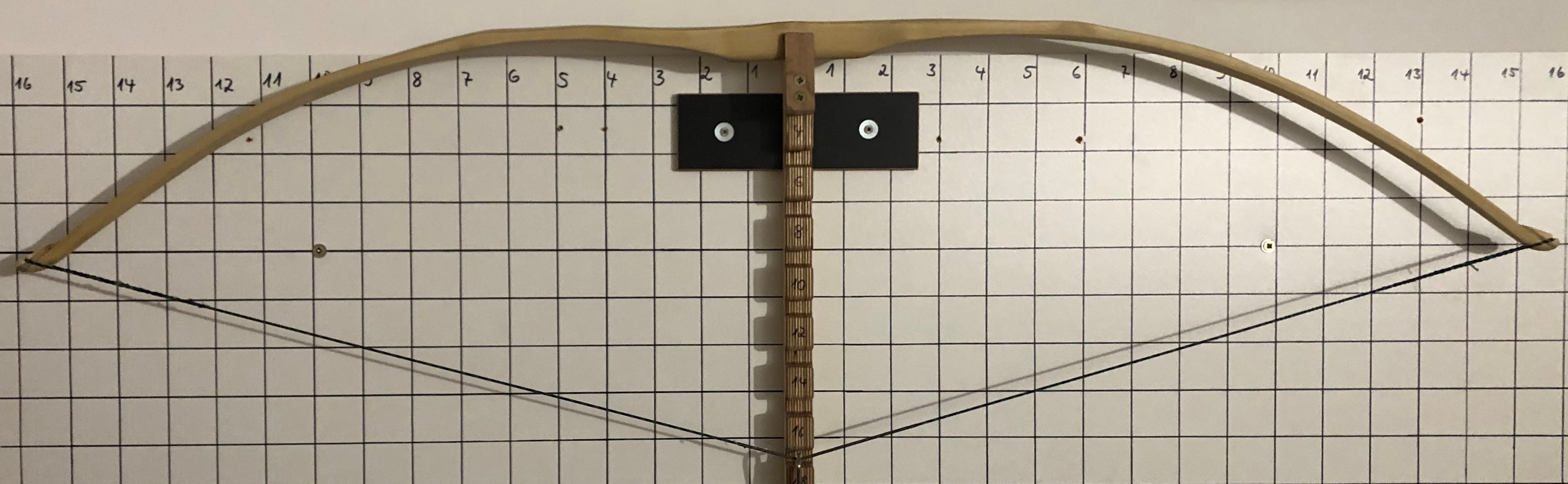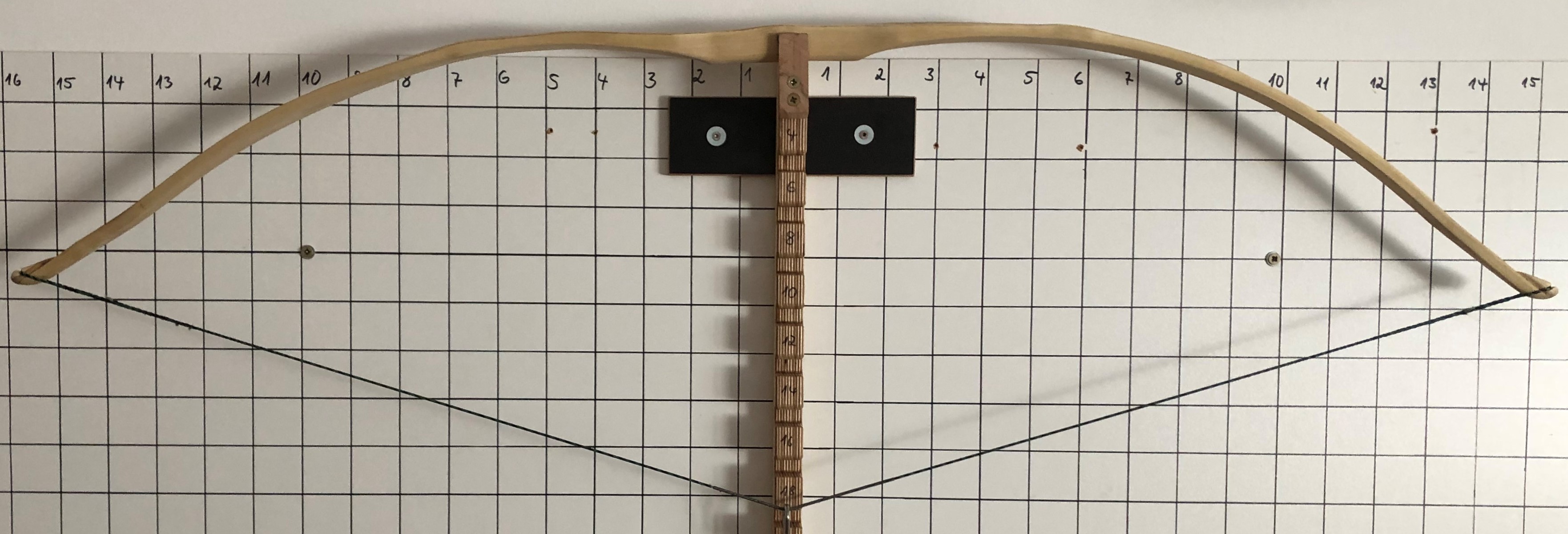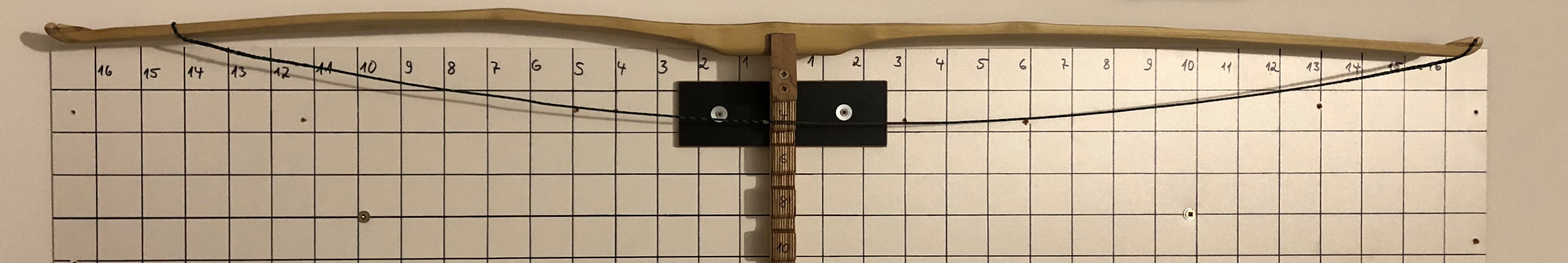 So sieht er abgespannt aus: Auf "niedriger" Standhöhe", d.h. die Tillersehne ist geringfügig kürzer als der Bogen: Und hier der Tiller bei Auszug 12'': Nach meiner Einschätzung biegt der untere WA (im Bild links) eigentlich nur an der deflexen Stelle, deshalb würde ich diesen zunächst nach dem FA (im Bereich 2 - 4) und im Bereich 8 - 12 (vielleicht auch bis 13) schwächen.