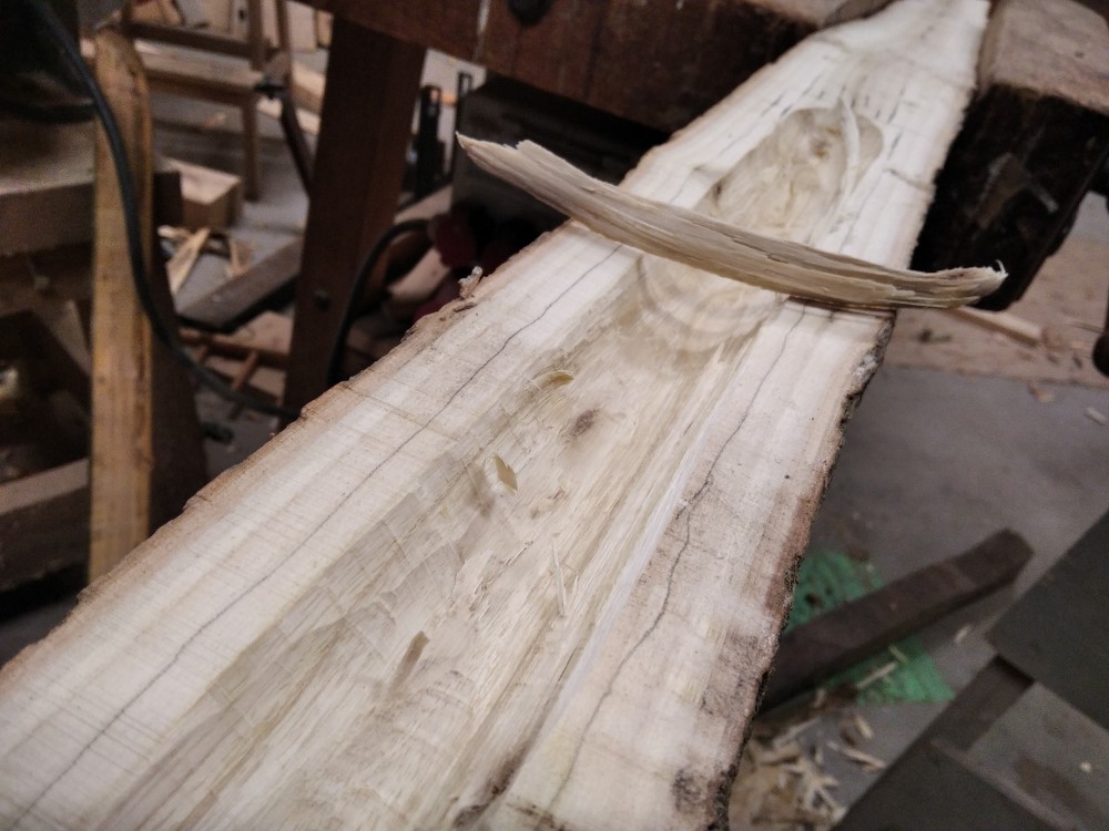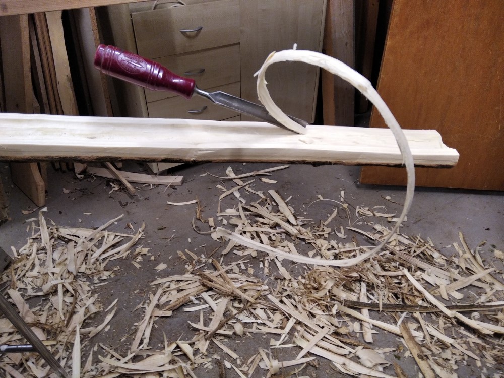 Damit lassen sich lange, feine Späne ziehen. Die Griffe und die Schneide müssten besser in einer Flucht sein. Nun muss man am Griff etwas gegendrehen. So mächtig wie ein Ziehmesser ist das Werkzeug leider nicht. Vielleicht schmiede ich mir doch noch einmal ein "besseres".