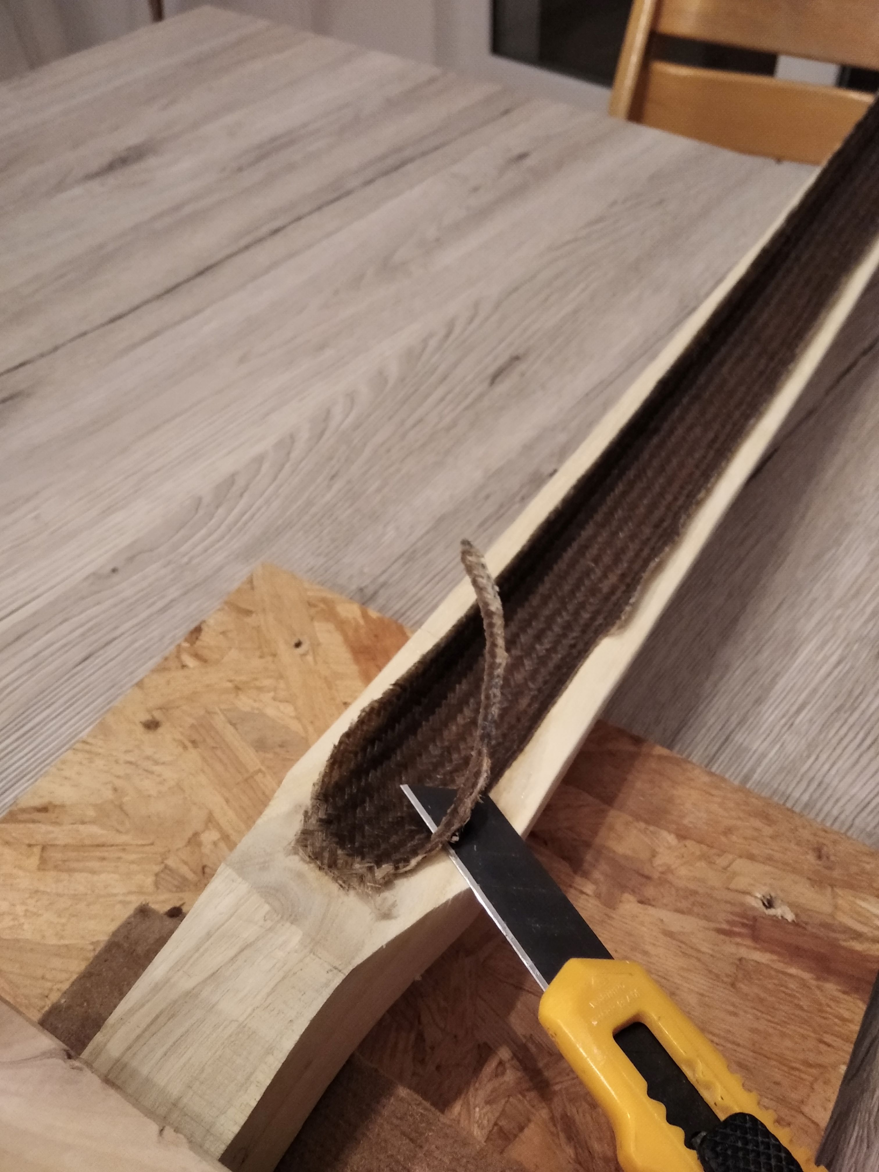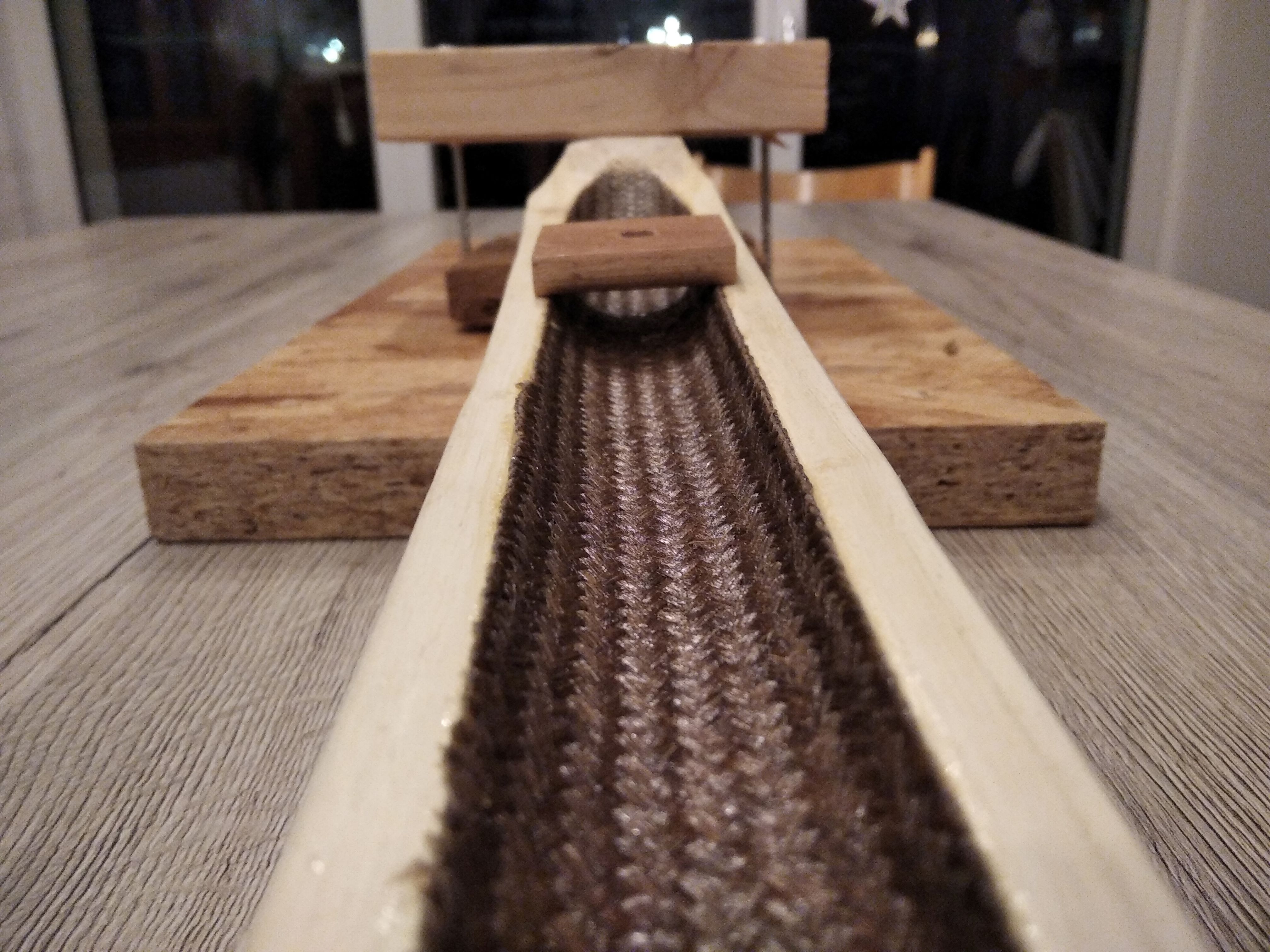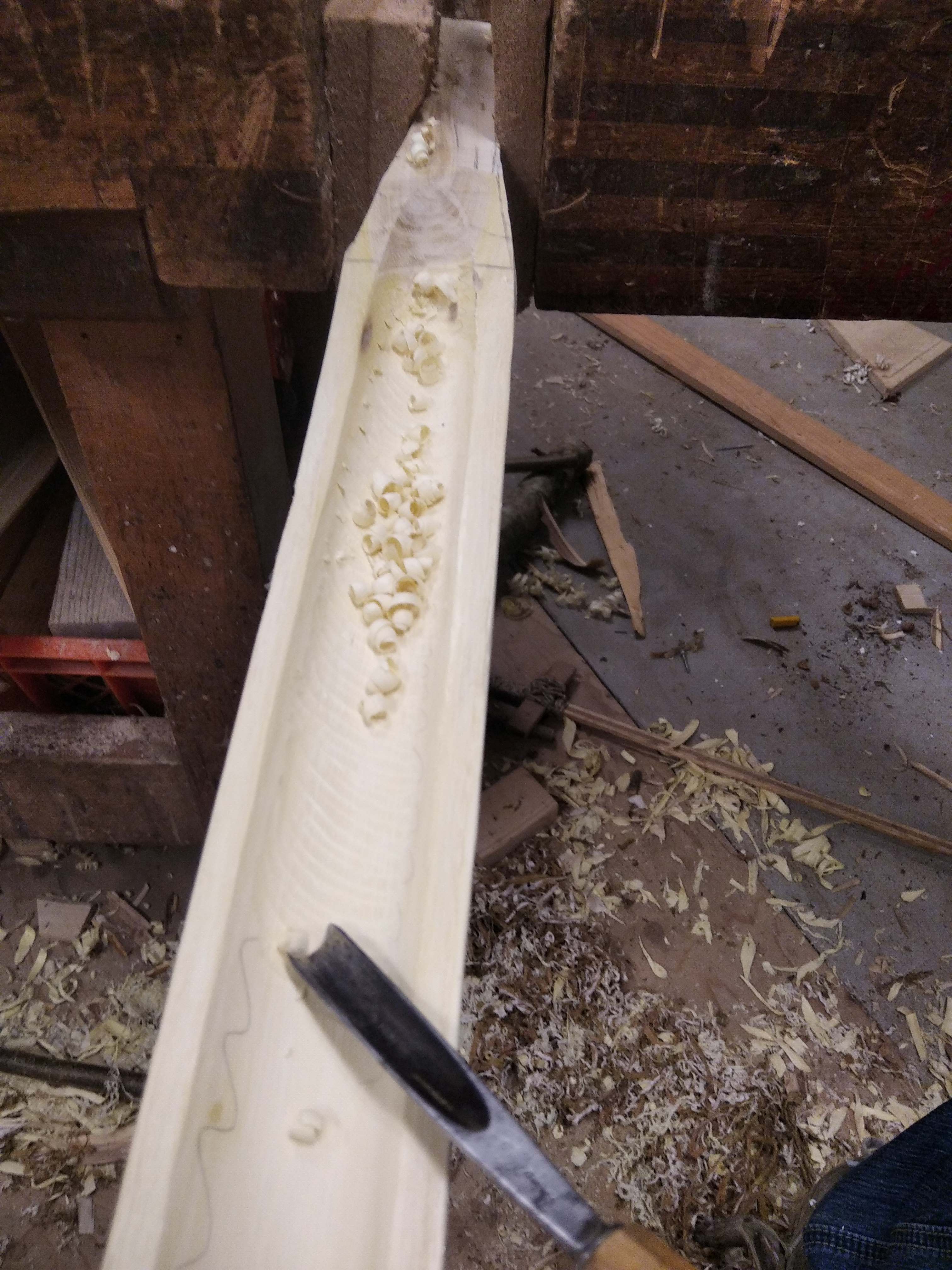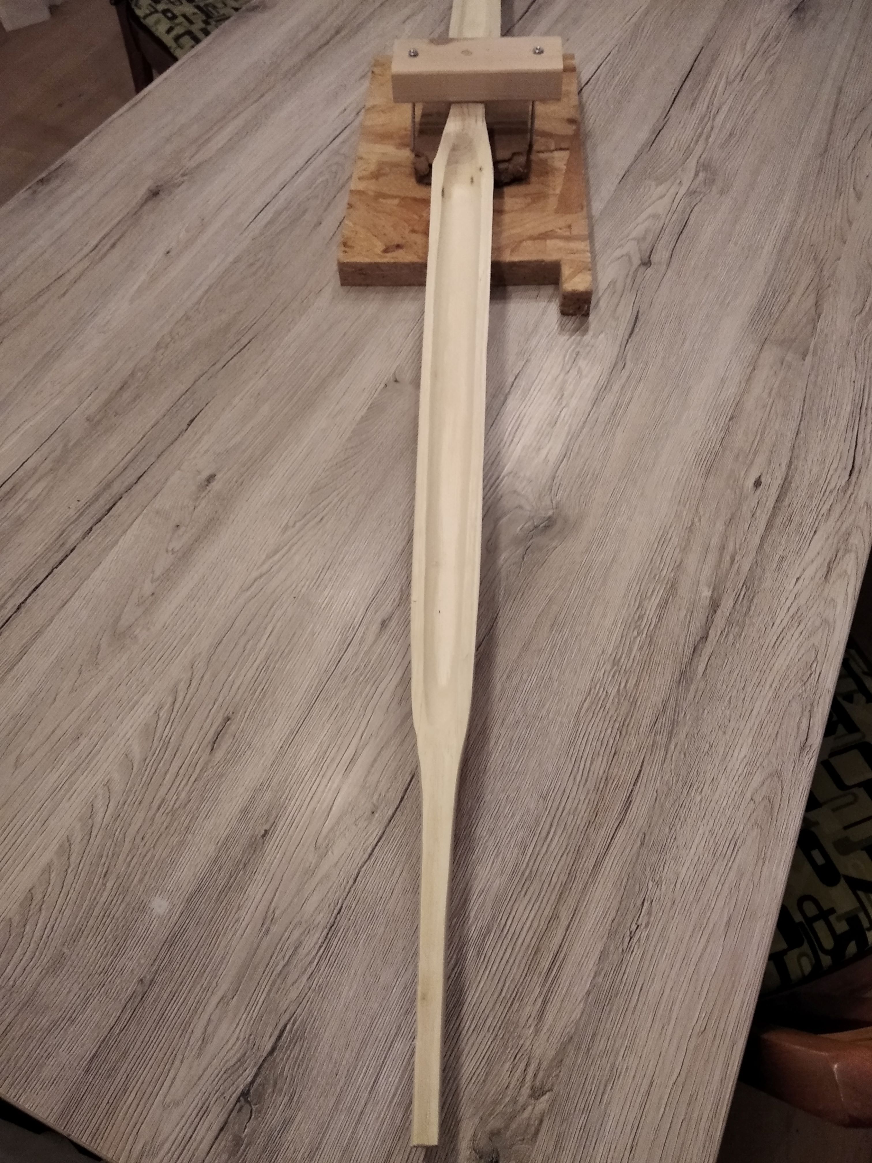 Inzwischen habe ich die Wurfarme weiter ausgehöhlt. Eigentlich wollte ich mir ein Ziehmesser zum aushöhlen schmieden. Mangels Zeit habe ich mir eine Krücke gebastelt: