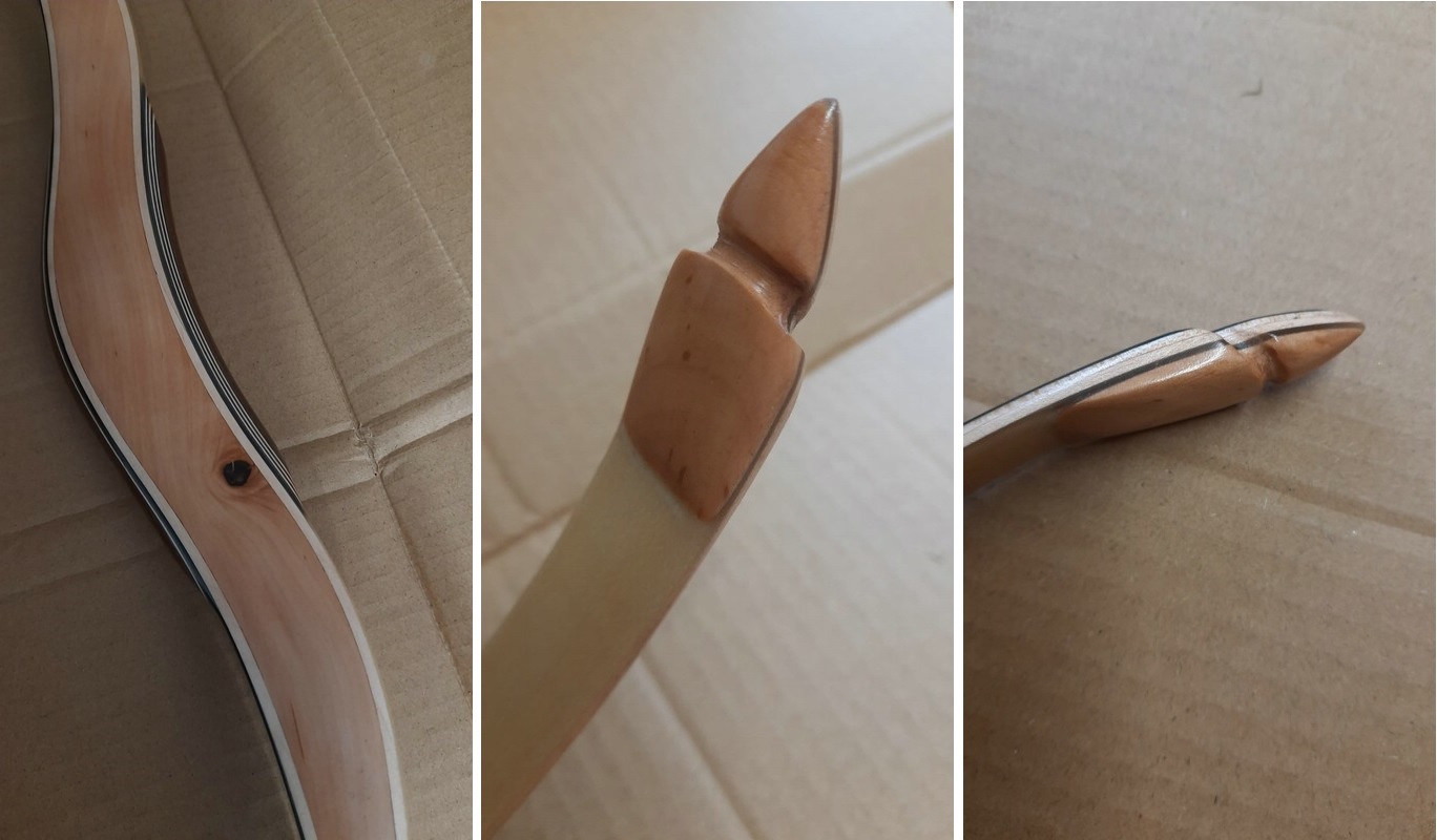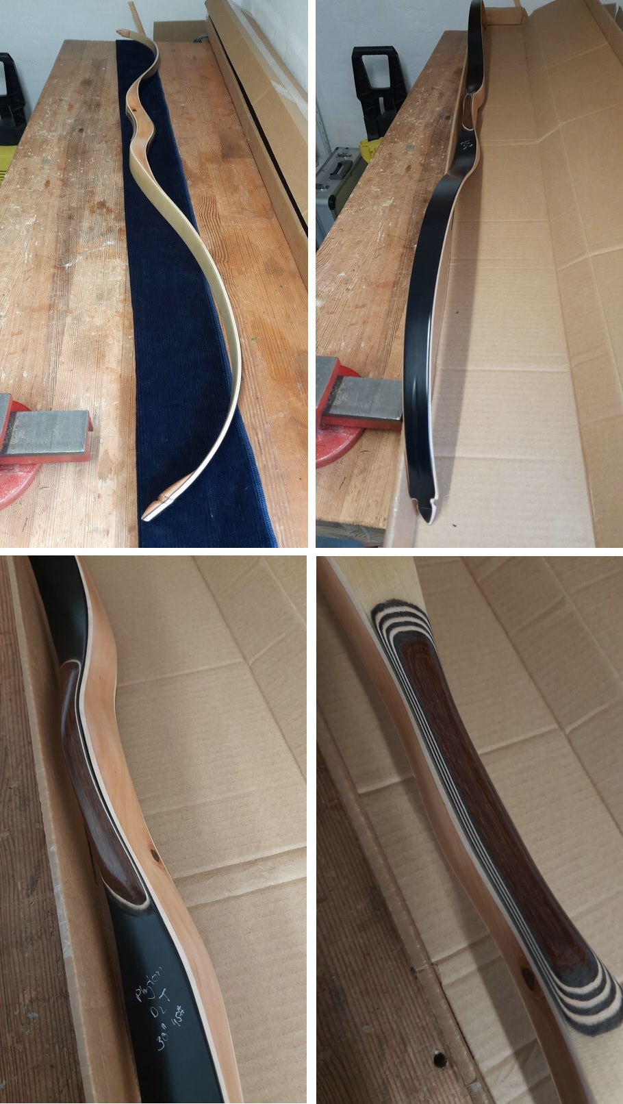 Für die Erreichung der hohen Auszugslänge wurde der Bogen aufwendig aus einem mehrfach-Laminat aus Ahorn- und Elsbeerenholz sowie zwei verschiedenen hellen und dunklen Glasbelägen gebaut.