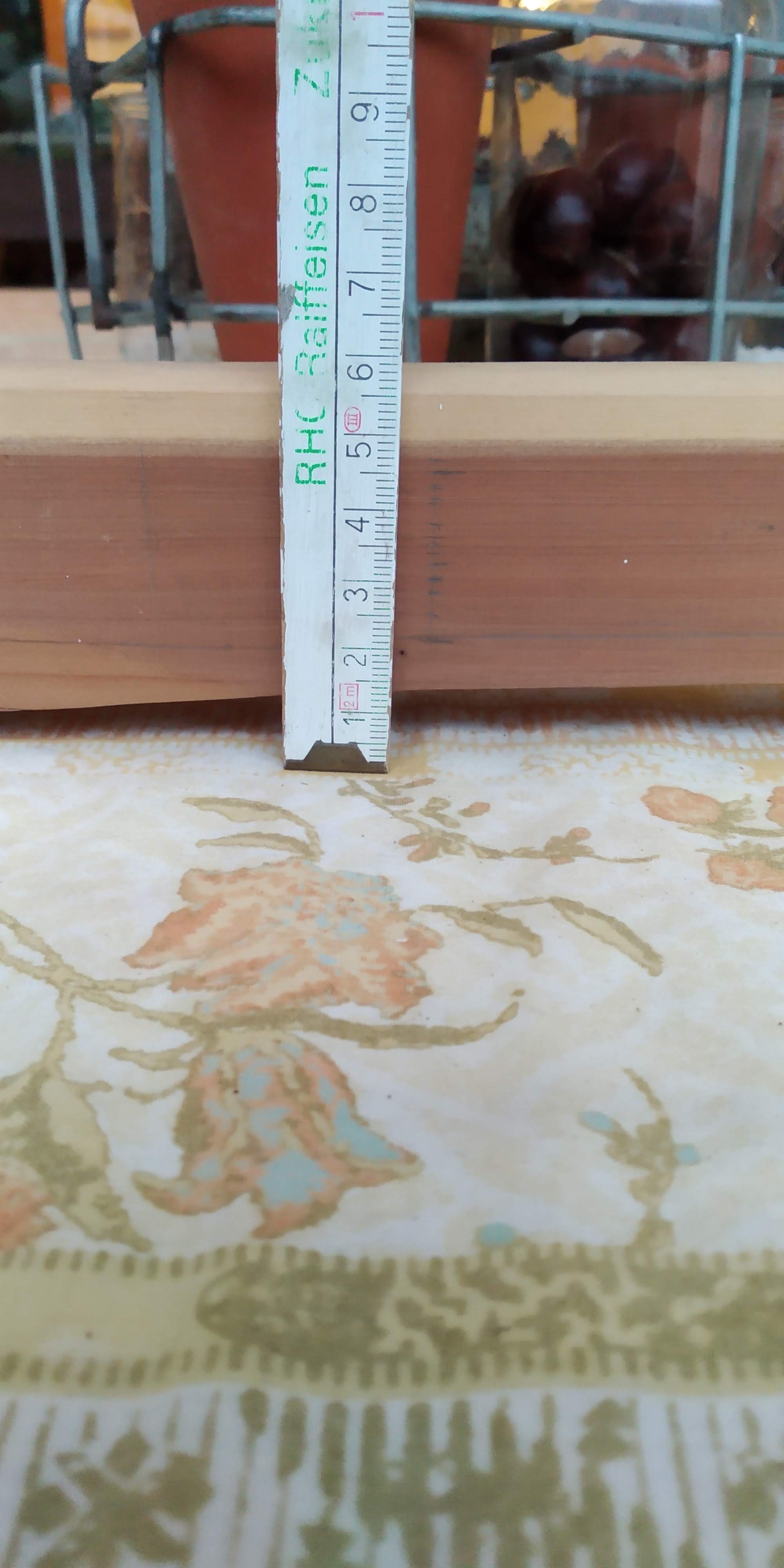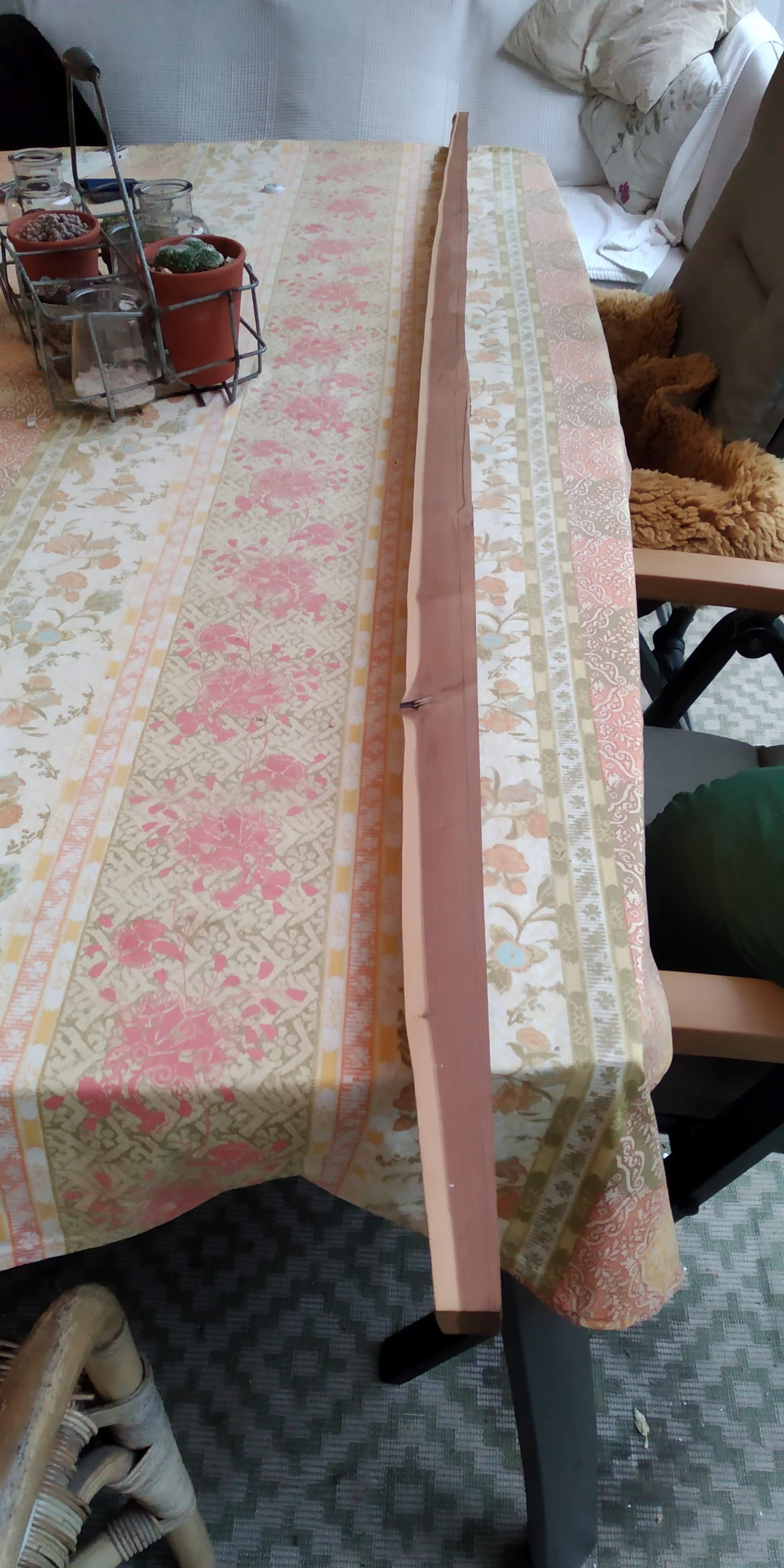 Um den Deflex zu zeigen, hab ich den Bogen mit seinem Mittelstück an einen Holzbalken gestellt. Es sind oben wie unten etwa 25-30mm.