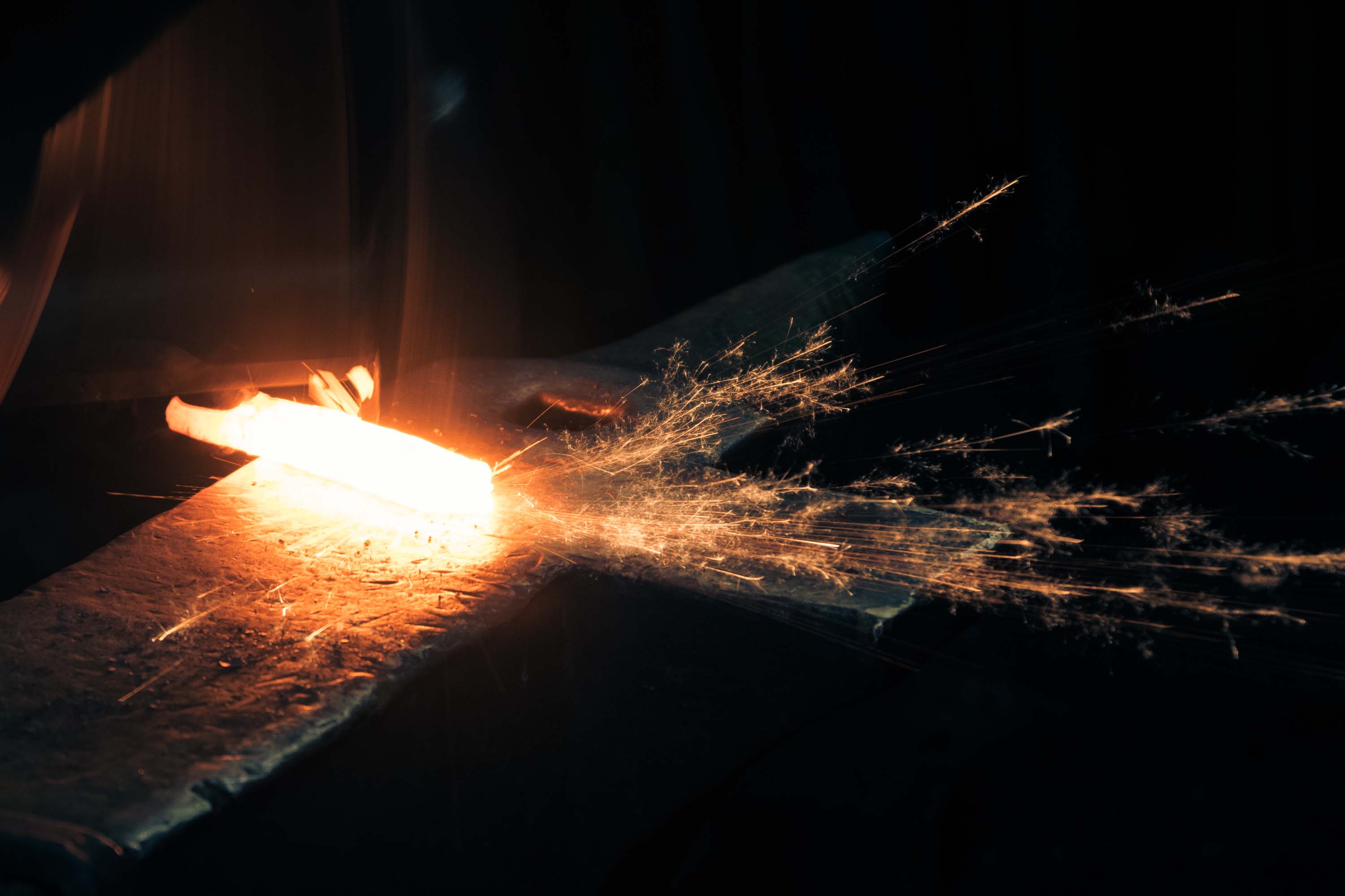 Das Verschweißen geschah ohne Flussmittel. Wir haben den Klumpen nach Augenmaß auf eine gewisse Temperatur (Farbe) gebracht und dann schnell und kräftig mit zwei Hämmern abwechselnd geschlagen. Wenn dabei flüssiges Metall weg spritzte (die Funken im 2. Bild), war das ein Zeichen dafür, dass es wohl funktioniert hat.