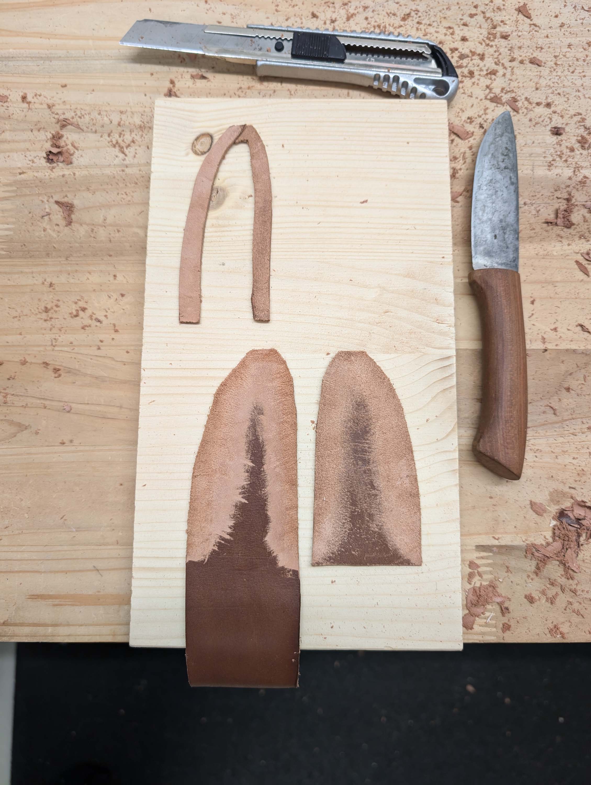 Dieses Jahr habe ich endlich eine passende Lederscheide dafür fertigen können. Auch hier habe ich wieder versucht mit weitgehend simplen Arbeitsmitteln auszukommen. Da ich zum ersten Mal mit Leder gearbeitet habe, war jeder Arbeitsschritt neu für mich - insbesondere die Sattlernaht.