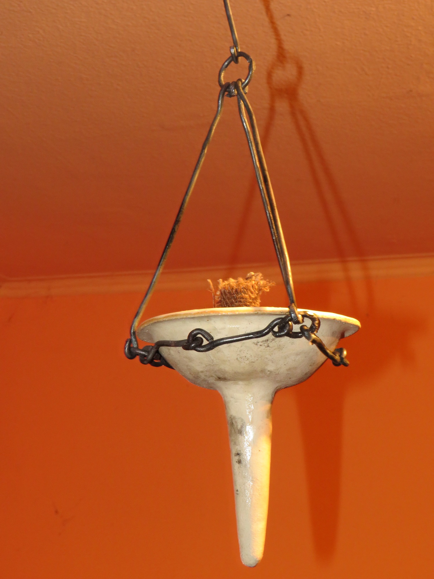 Ich habe eine ähnliche Talglampe. Und eine andere Variante, die nan auf den Tisch stellen kann, die auch so einen "Zipfel" hat, nur nach oben. Der Zipfel ist zum Tragen gedacht