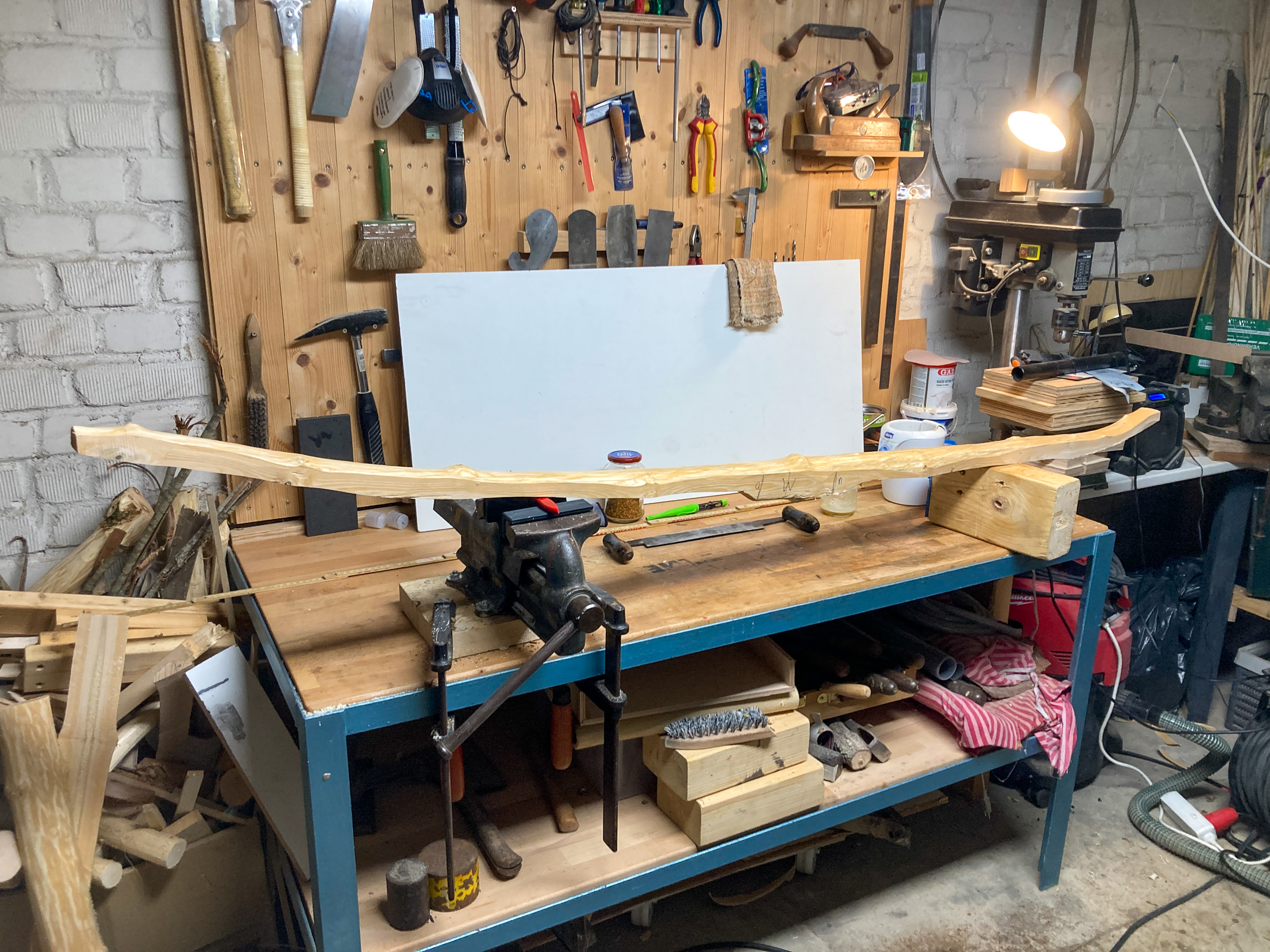 Mein Sap hat schon am 6. Januar deutlich abgespeckt und eine grobe Bogenform bekommen, um das seitliche Profil zu korrigieren wurde er dann auf einem Balken fixiert. Leider war ich so versunken in die Arbeit, dass mit erst am Ende eingefallen ist Fotos zu machen.
