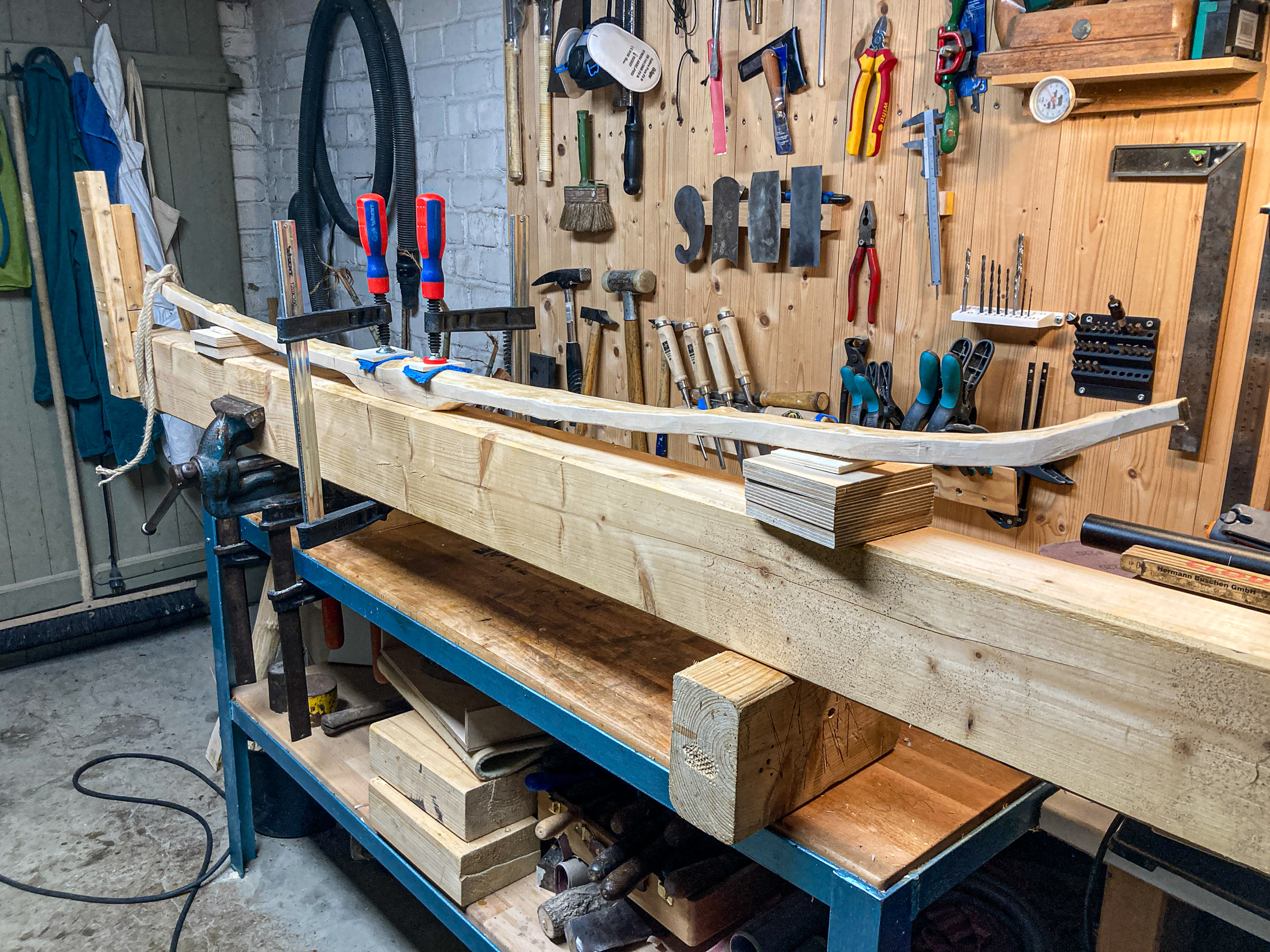 Sieht jetzt schon ganz gut aus, finde ich, morgen soll es weitergehen und dann auch bald aus dem Keller in die wärmere Bude. An einem Ende hat der Rohling ein natürlich geflipptes Tip, das werde ich auf der anderen Seite mit Dampf oder Hitze reinbiegen, beim seitlichen Profil habe ich Hoffnung, dass das Trocknen in der "Form" ausreicht, für einen halbwegs ausgeglichenen Reflex.