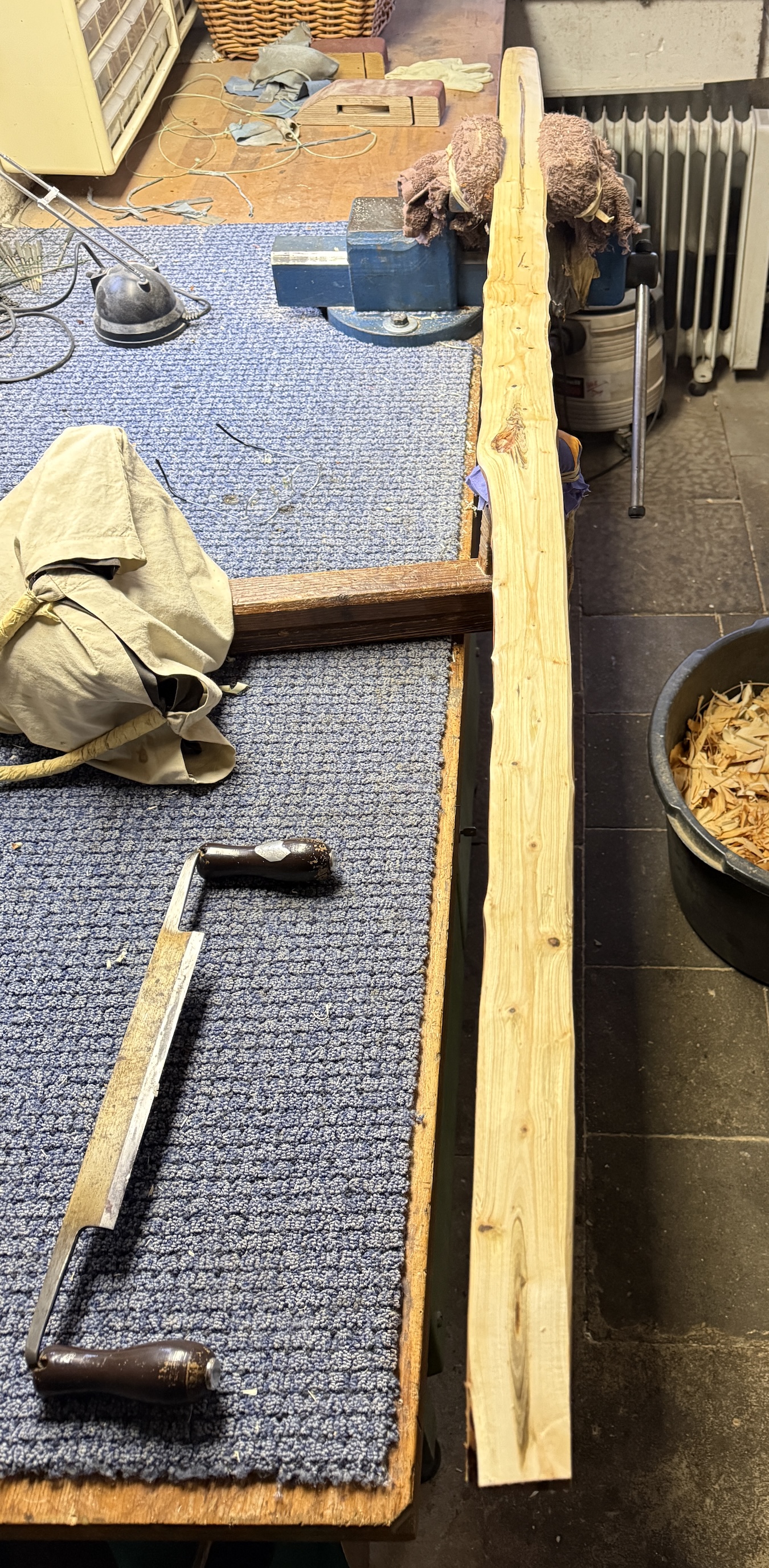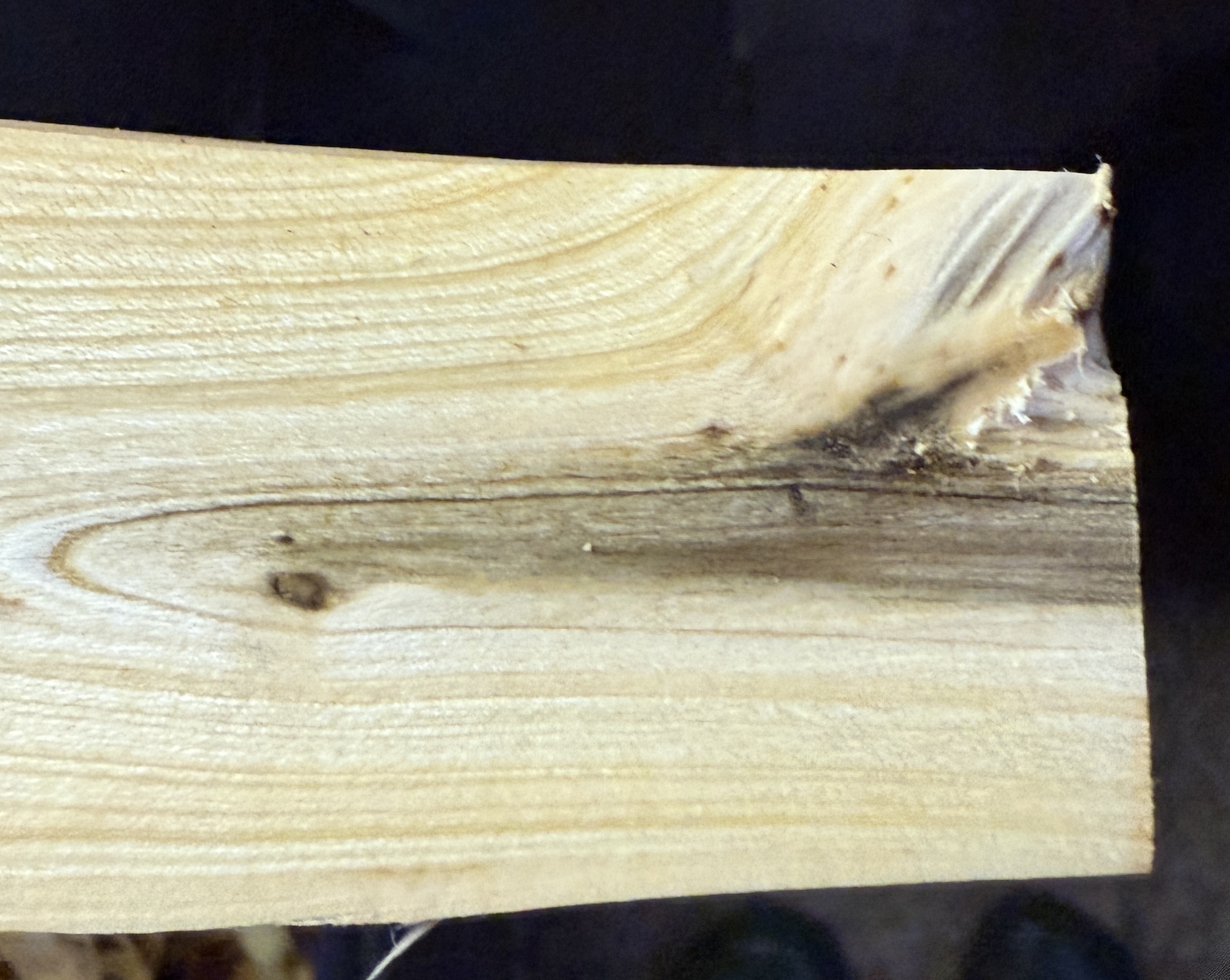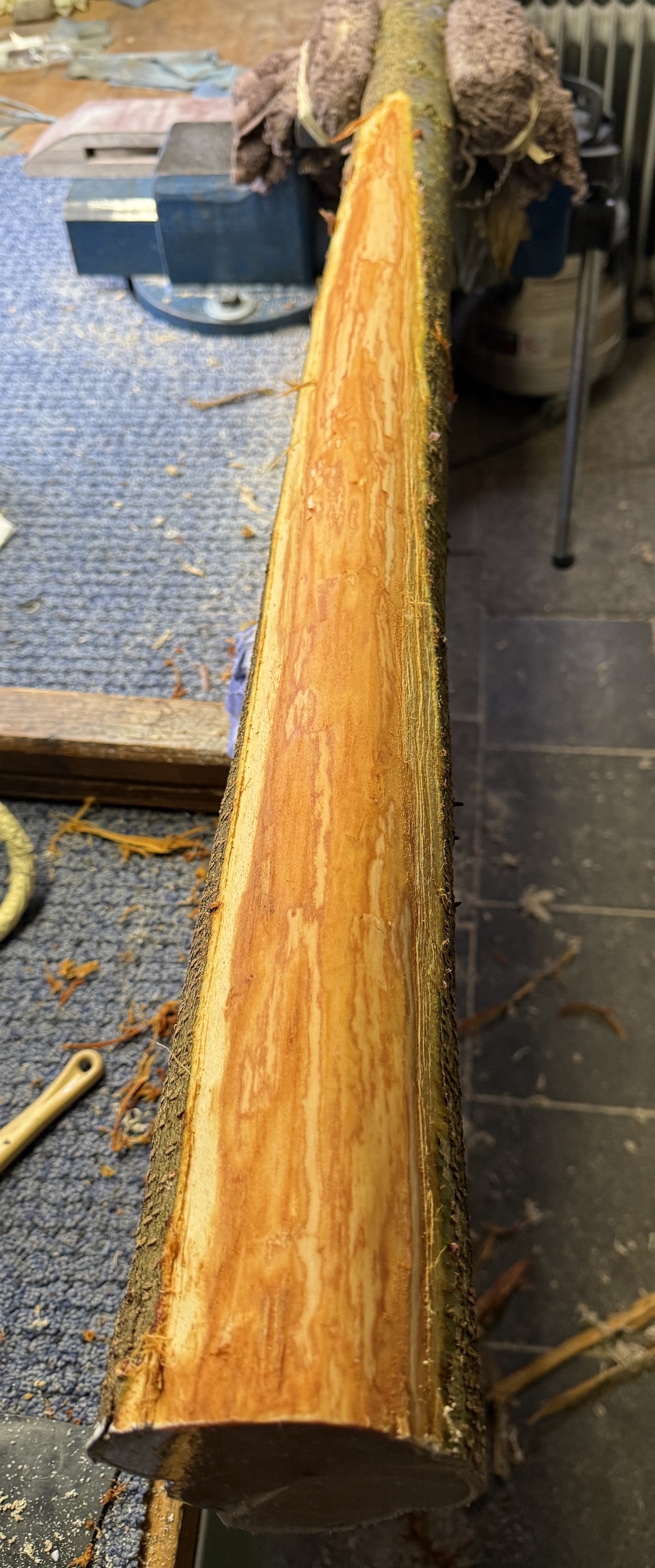 Ich entrinde die Pflaume gleich noch weiter und streiche sie mit verdünntem Holzleim ein. Beim entrinden hat sich dann auch noch ein leichter Drehwuchs zu erkennen gegeben.