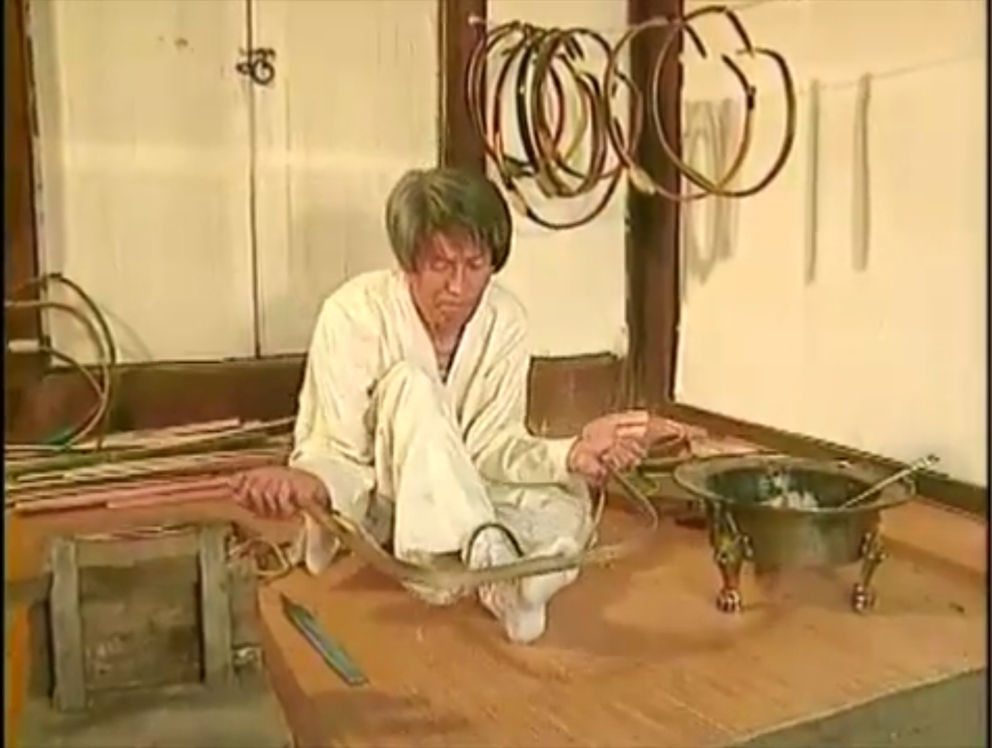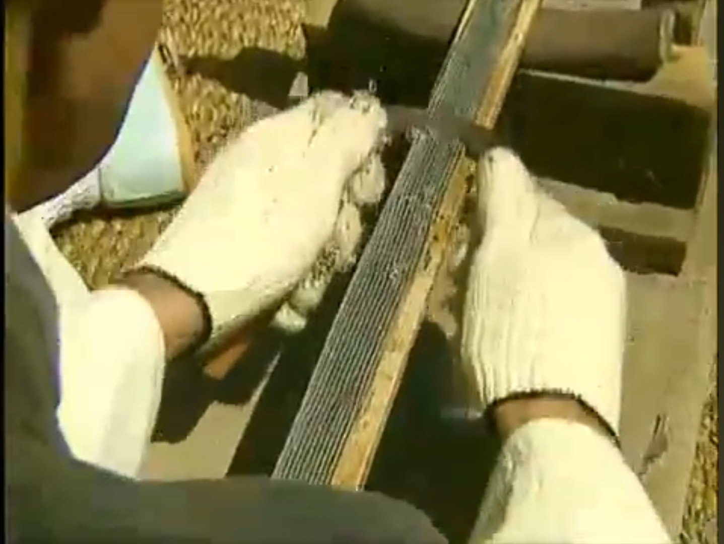 Der Rücken wird nun fertig ausgeformt. Im Video schlecht zu erkennen ist der genaue dickenverlauf und die Formgebung im Bereich des Siyahs. Hier wurde eigentlich der ganze Rücken Ellipsenförmig ausgearbeitet. Nur der Bereich des Siyahs nach dem stark reflexen Knick ist noch in Rohzustand. Danach werden die Enden mit Hilfe eines Holzplättchens zusammengebunden. Anschließend wird der Rücken mit Schwimmblasenleim grundiert. Besonders interessant finde ich es, wie die Sehnen für den Belag vorbereitet werden.