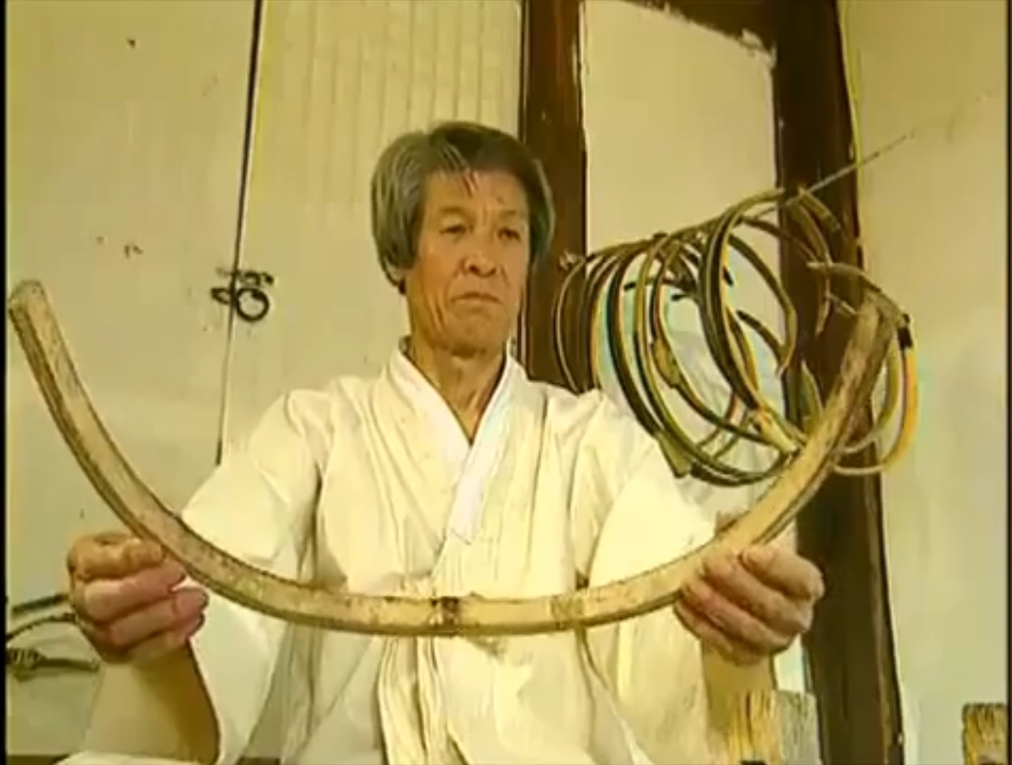 Hier ist zu erkennen dass der Spleiß keine geraden Linien hat, sondern leicht gebogene. Die Form des Spleißes wird dann vom Siyah direkt auf den Bambus übertragen und ausgesägt. Hier fällt auf dass der Schnitt mit der Säge ein ganzes Stück weiter in den Wurfarm fortgesetzt wird. Dies bewirkt dass sich der Spleiß vom Bambus beim zusammenfügen mit dem Siyah etwas auseinander drücken lässt. Dadurch halten die Teile beim verkleben besser zusammen. Der Spleiß wird dann mit Schwimmblasenleim geklebt (sowie alle weiteren Klebungen auch) und mit Schnur umwickelt. Nun wird der Bambus im bereich des Griffs Rückenseitig ausgedünnt. Die Bauchseite des Rahmens wird nun Verzahnt , sowie die ausgedünnte Stelle für die Griffschale Rückenseitig und die Griffschale selbst. Hier fällt nur indirekt auf, dass der runde Bogenbauch vom Bambus flachgefeilt wurde. Nun werden 2 Hornstreifen (einer je Wurfarm) ebenfalls mit Schwimmblasenleim mit dem Rahmen verklebt. Dafür wird innenliegend eine Holzform für die Formgebung und zum verhindern von Verdrehungen beigelegt. Im Video ist zu sehen dass auch über das Horn etwas beigelegt wird. Dann wird alles Stramm mit einem Seil umwickelt. Im Video wird das Werkzeug dafür als "Lever" also Hebel übersetzt. Wenn jemand den Fachbegriff dafür weis, immer her damit