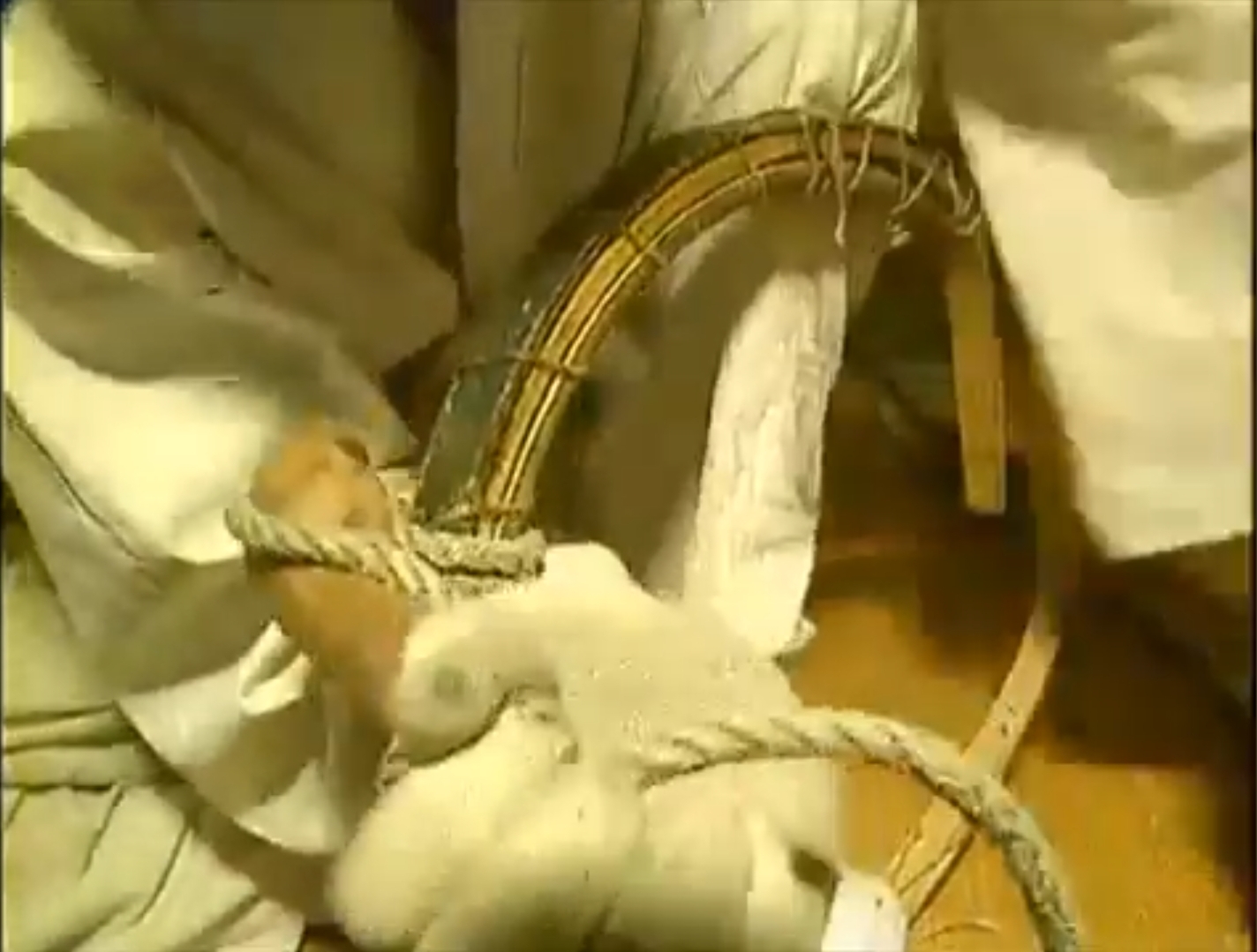 Dann kommt der Moment, bei dem den meisten Bogenbauern, beim schauen des Videos kurz das Herz aussetzen dürfte. Der Bogen wird, mit dem Fuß am Griff und den Händen an den Wurfarmenden abrupt in den Vollauszug gebracht. Ob dies wirklich so gemacht wurde, oder nur durch den Videoschnitt so rüber kommt, weis ich nicht.