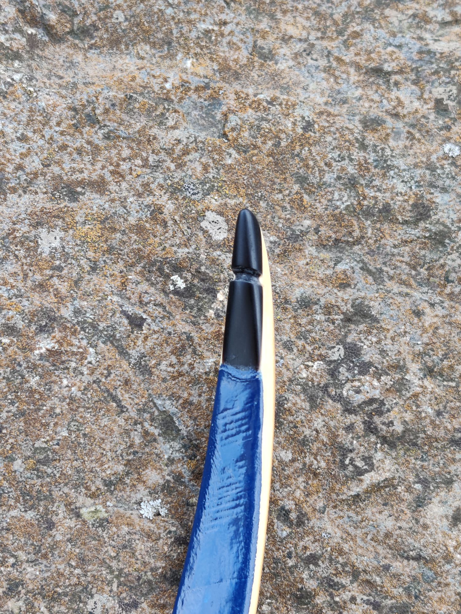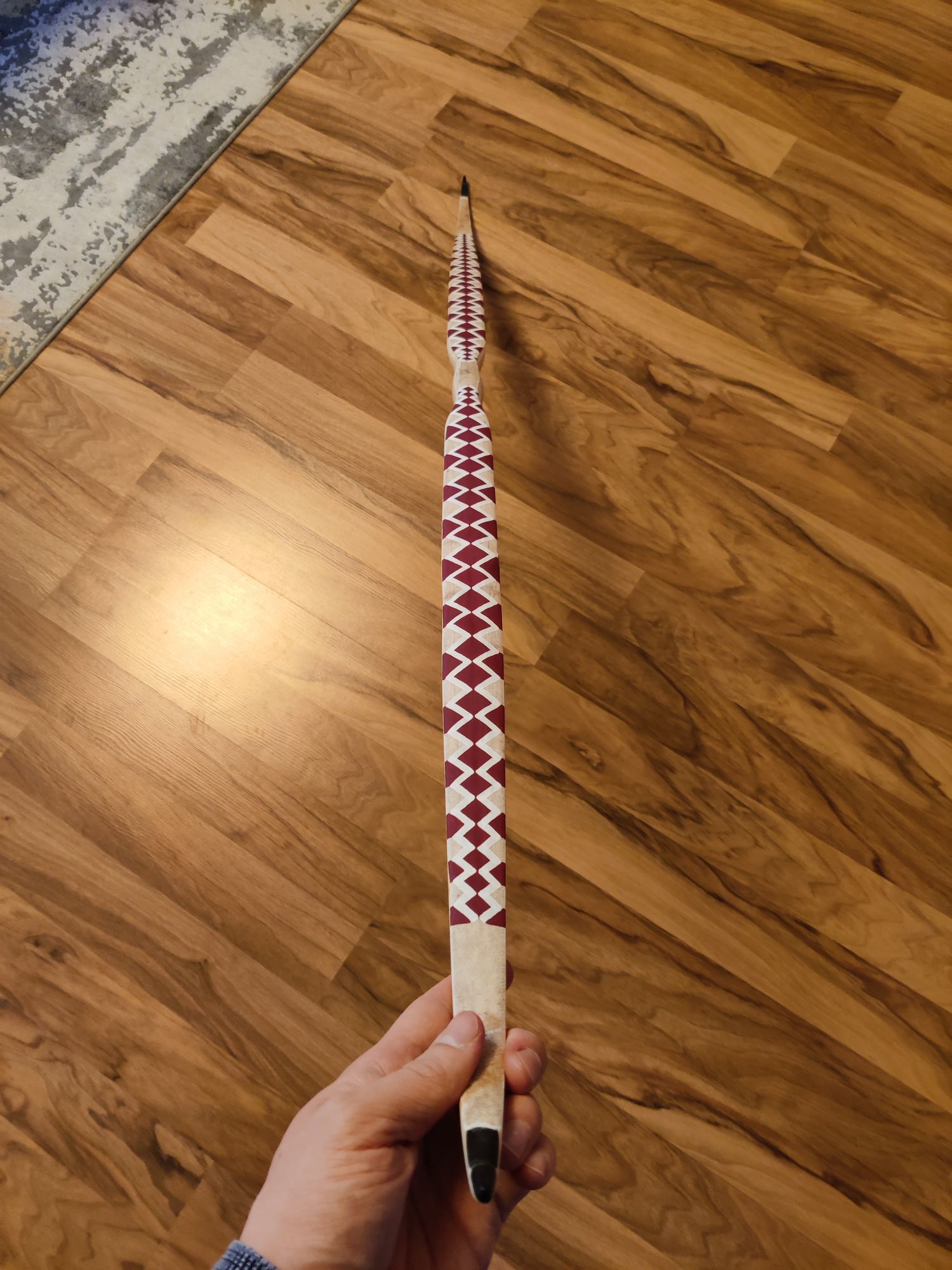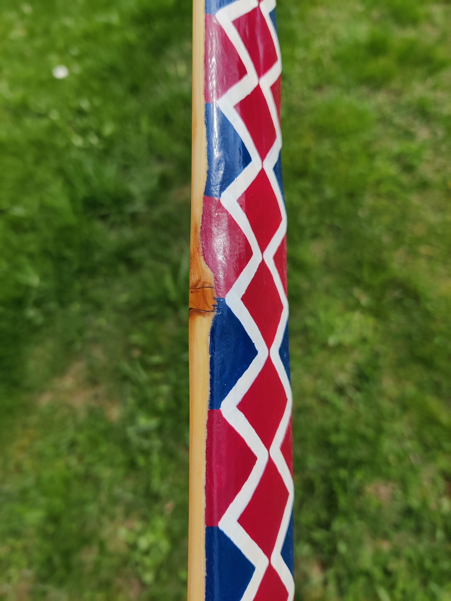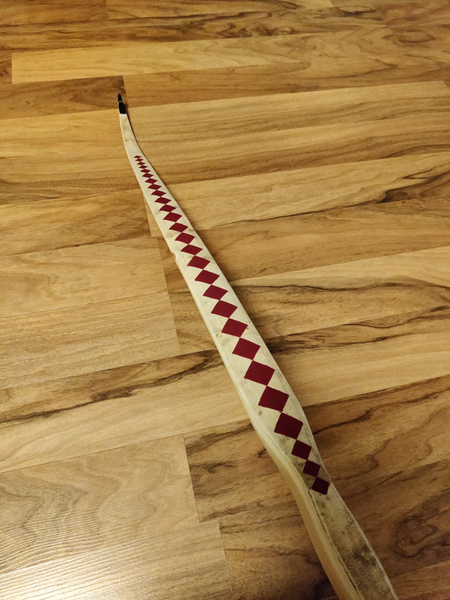 Es ist ein Eibe-Recurve mit einer Schicht Sehnenbelag, Ziegenrohhaut und einer Bemalung im Hupa-Stil. Den Sehnenbelag hab ich hauptsächlich gemacht um sicher zu stellen dass ich arbeitende Recurves machen kann ohne dass die Dampfbiegung wieder rauskriecht. Die Ziegenrohhaut ist mit 0,3-0,5mm sehr dünn. Bemalt hab ich ihn mit wasserfesten Acrylfarben mit Pinsel aufgetragen und mit 2 Schichten Bootslack versiegelt. Den Totast im Randbereich vom oberen Wurfarm hab ich ausgebohrt und gedübelt. Der Ging von der Bauchseite im Wurfarm liegend schräg zum Rücken hin seitlich raus. Da war ursprünglich bauchseitig noch ein Steg der beim Tillern später weggefallen ist. Bei Eibe scheint sowas aber nicht so kritisch zu sein. Und Bruchschutz hat der Bogen ja sowieso genug
