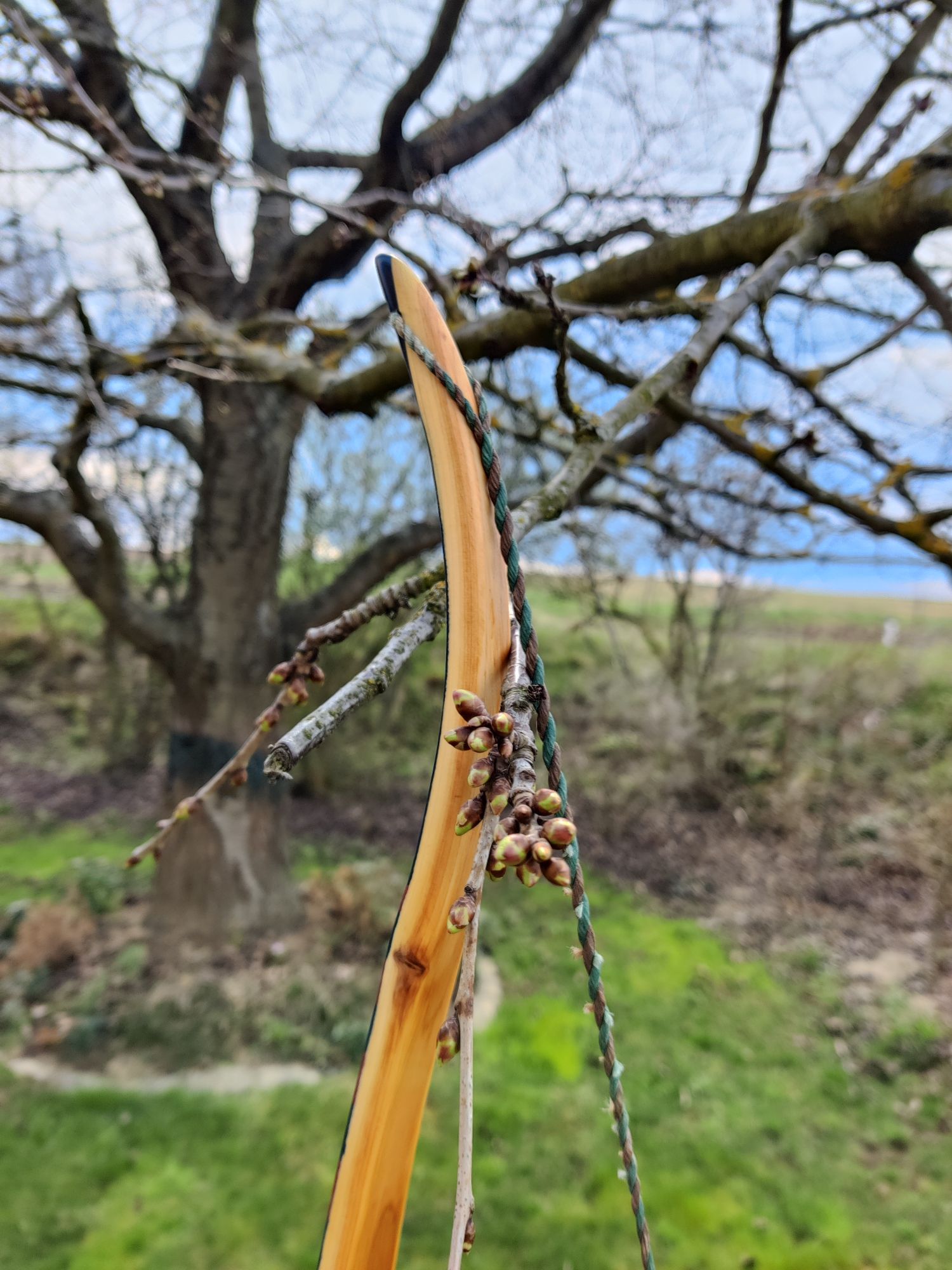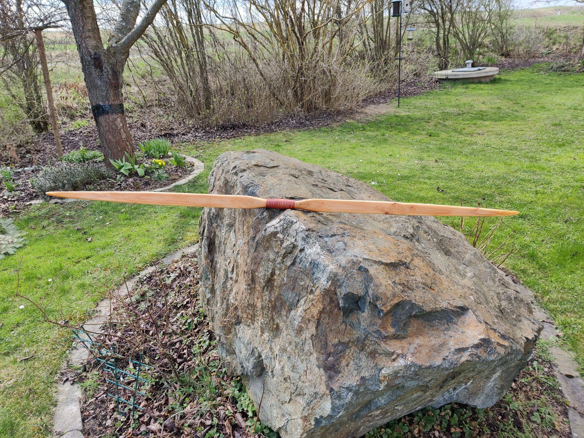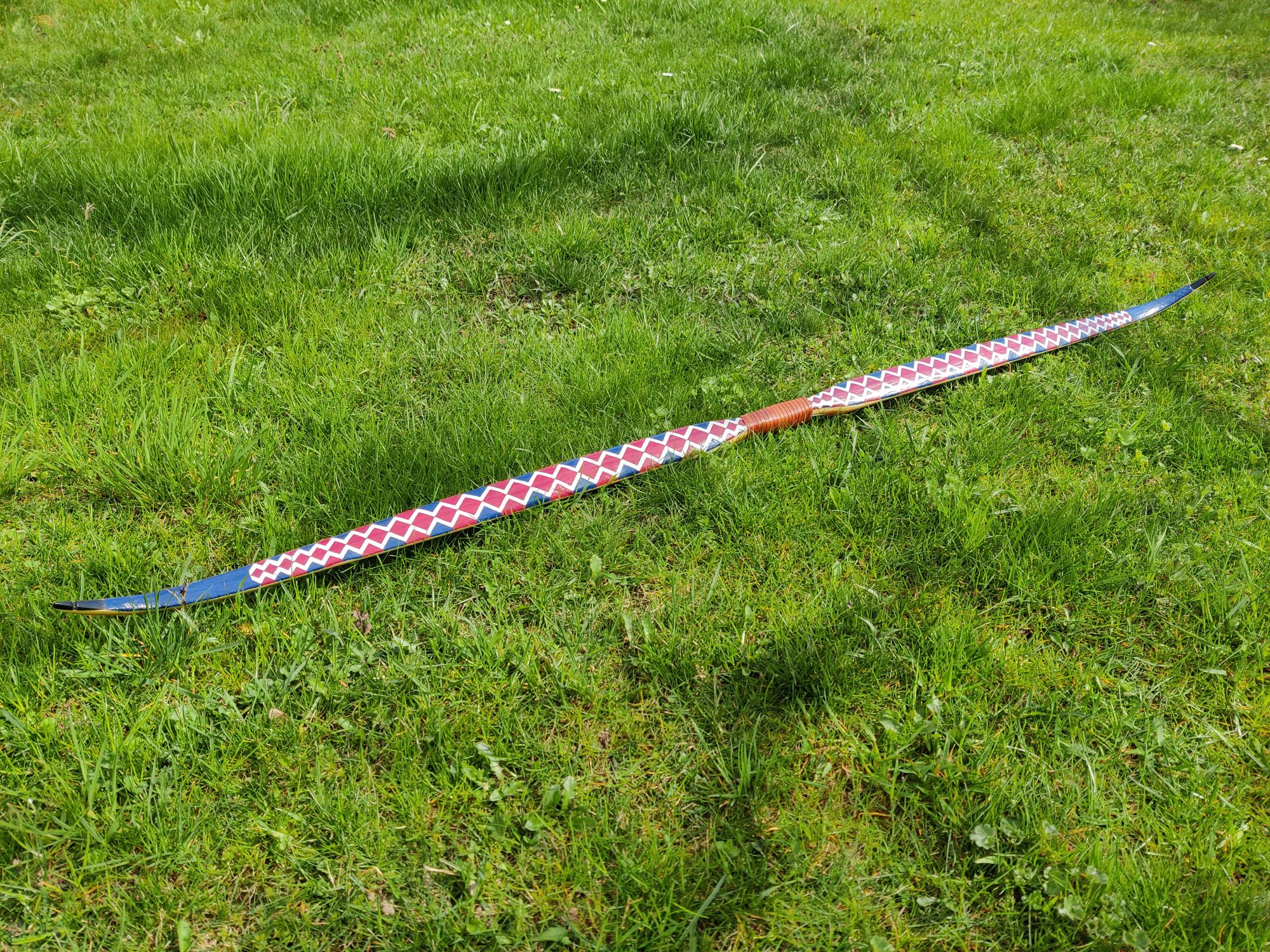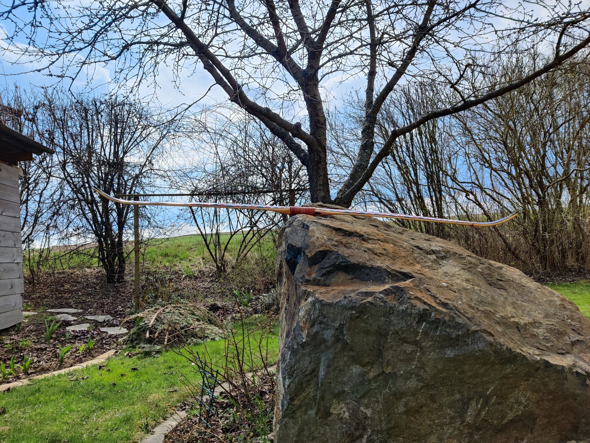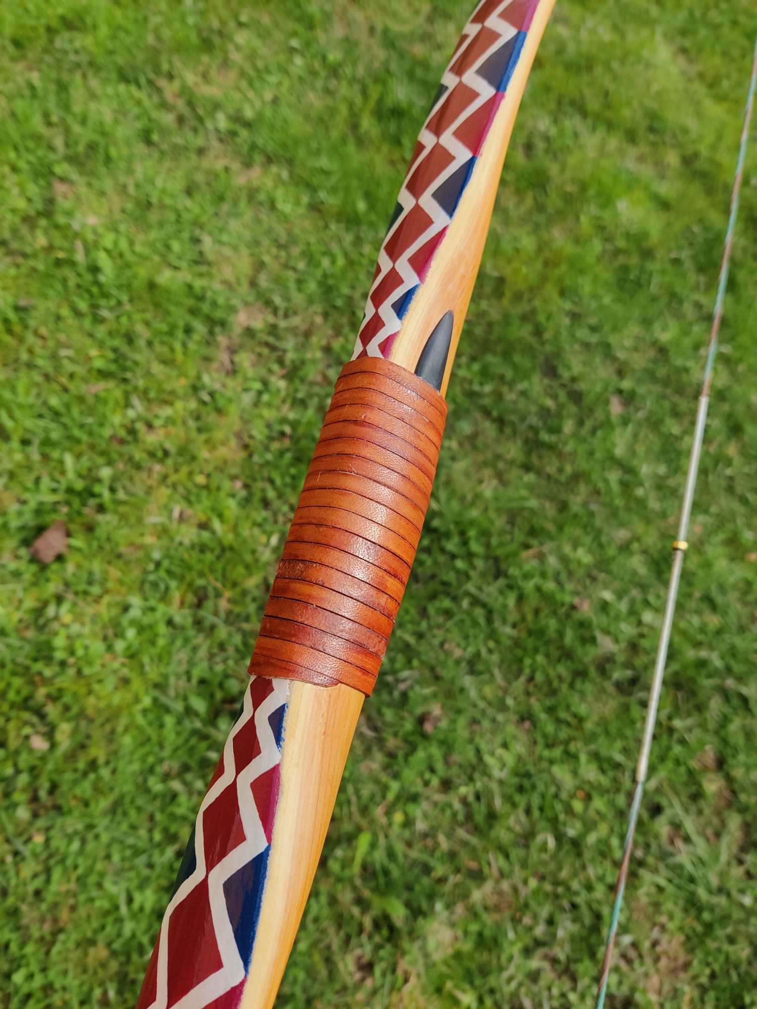 Es ist ein Eibe-Recurve mit einer Schicht Sehnenbelag, Ziegenrohhaut und einer Bemalung im Hupa-Stil. Den Sehnenbelag hab ich hauptsächlich gemacht um sicher zu stellen dass ich arbeitende Recurves machen kann ohne dass die Dampfbiegung wieder rauskriecht. Die Ziegenrohhaut ist mit 0,3-0,5mm sehr dünn. Bemalt hab ich ihn mit wasserfesten Acrylfarben mit Pinsel aufgetragen und mit 2 Schichten Bootslack versiegelt. Den Totast im Randbereich vom oberen Wurfarm hab ich ausgebohrt und gedübelt. Der Ging von der Bauchseite im Wurfarm liegend schräg zum Rücken hin seitlich raus. Da war ursprünglich bauchseitig noch ein Steg der beim Tillern später weggefallen ist. Bei Eibe scheint sowas aber nicht so kritisch zu sein. Und Bruchschutz hat der Bogen ja sowieso genug