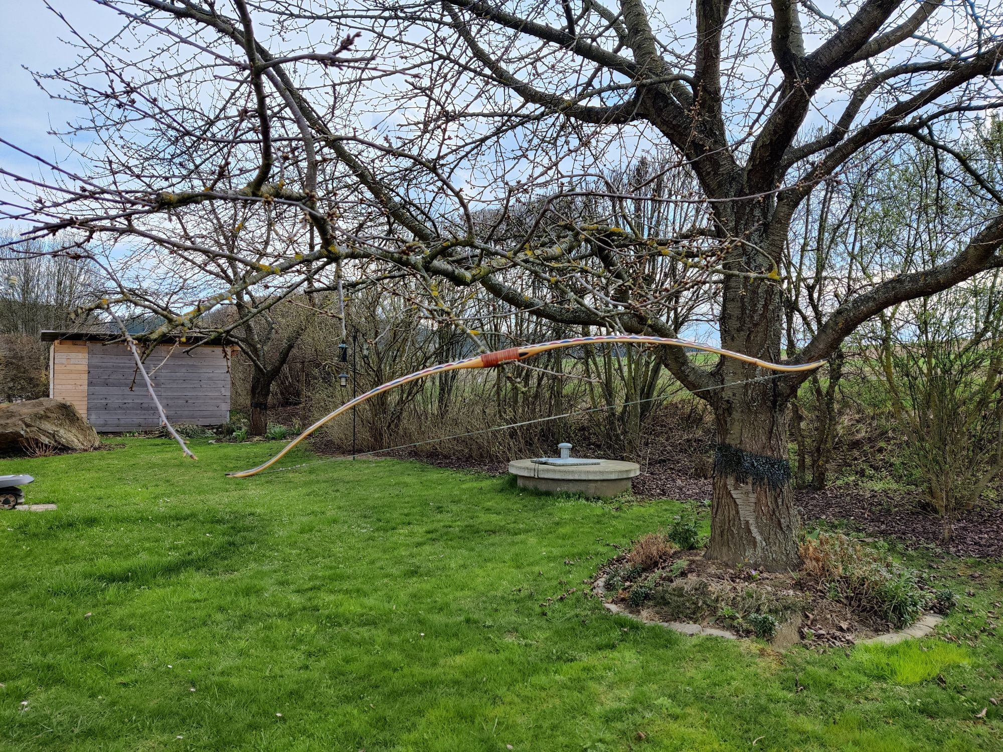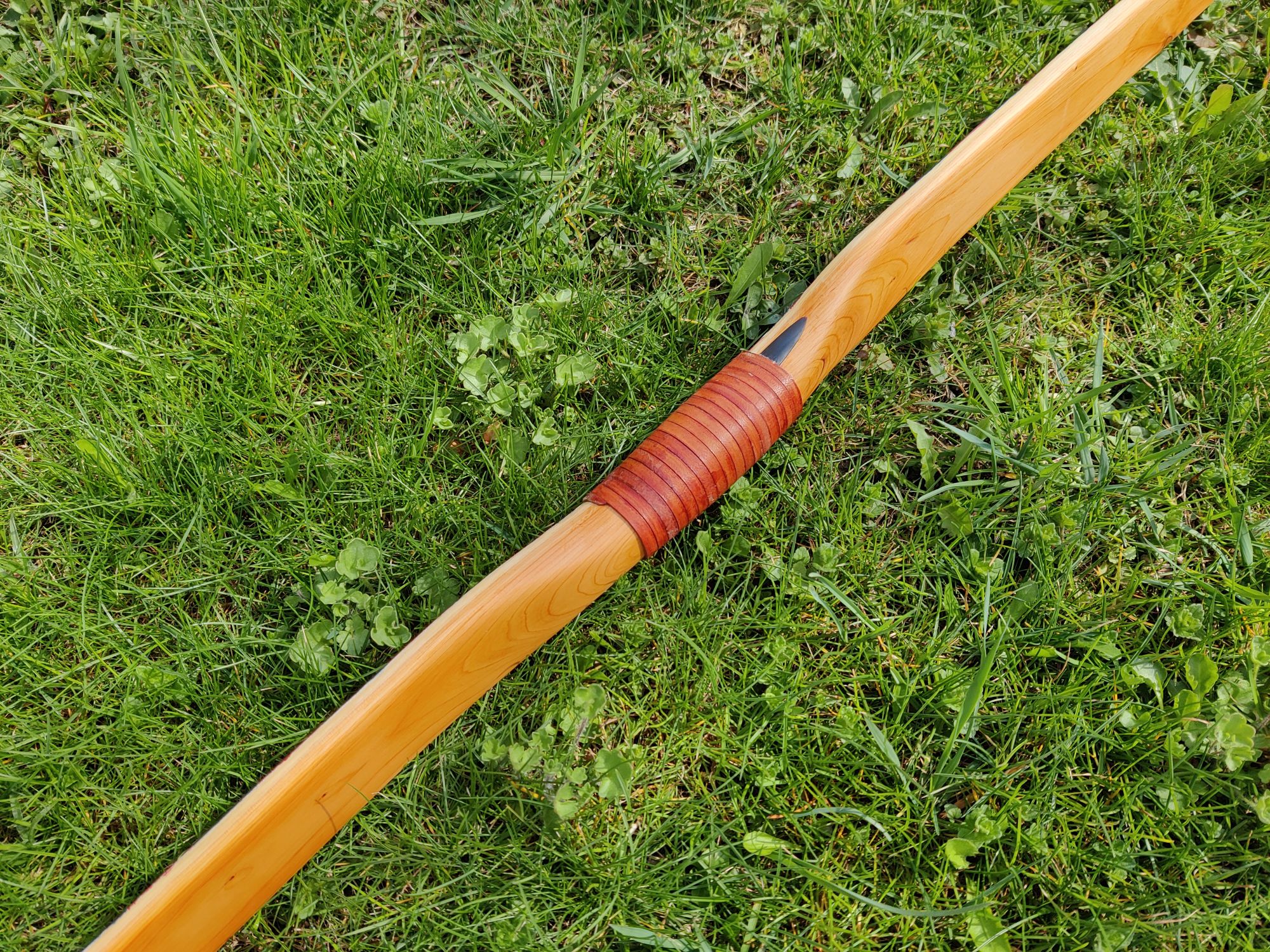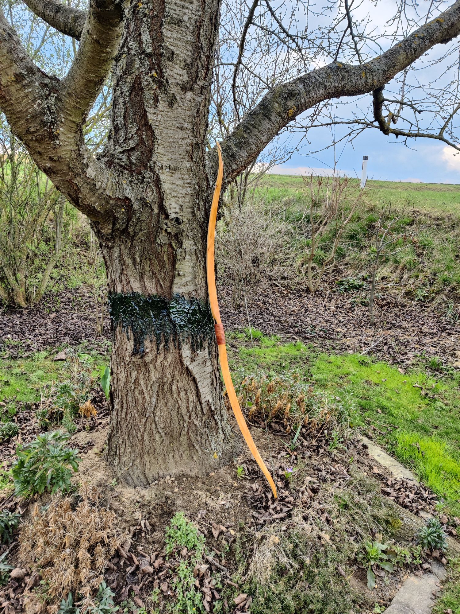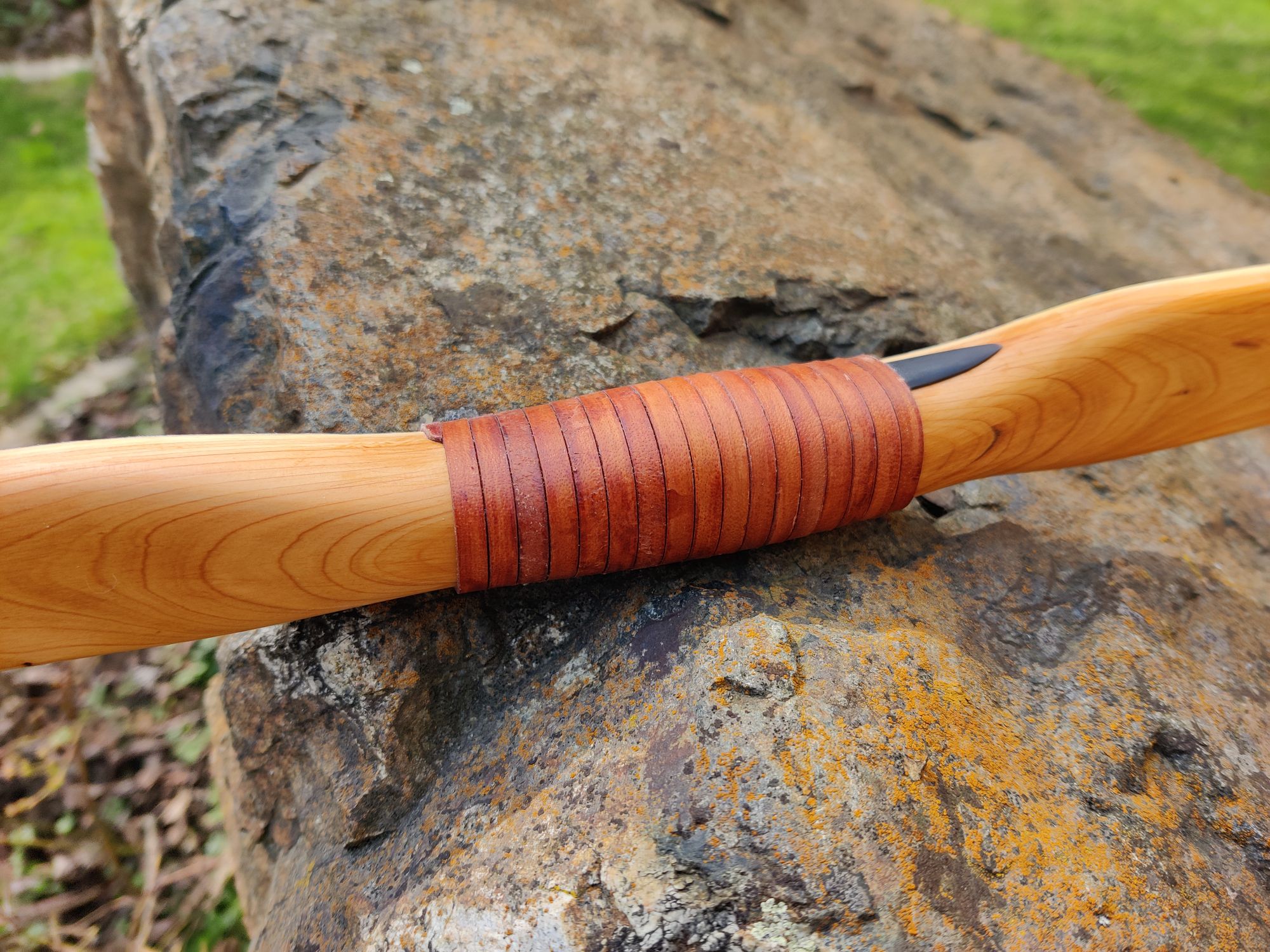 Es ist ein Eibe-Recurve mit einer Schicht Sehnenbelag, Ziegenrohhaut und einer Bemalung im Hupa-Stil. Den Sehnenbelag hab ich hauptsächlich gemacht um sicher zu stellen dass ich arbeitende Recurves machen kann ohne dass die Dampfbiegung wieder rauskriecht. Die Ziegenrohhaut ist mit 0,3-0,5mm sehr dünn. Bemalt hab ich ihn mit wasserfesten Acrylfarben mit Pinsel aufgetragen und mit 2 Schichten Bootslack versiegelt. Den Totast im Randbereich vom oberen Wurfarm hab ich ausgebohrt und gedübelt. Der Ging von der Bauchseite im Wurfarm liegend schräg zum Rücken hin seitlich raus. Da war ursprünglich bauchseitig noch ein Steg der beim Tillern später weggefallen ist. Bei Eibe scheint sowas aber nicht so kritisch zu sein. Und Bruchschutz hat der Bogen ja sowieso genug