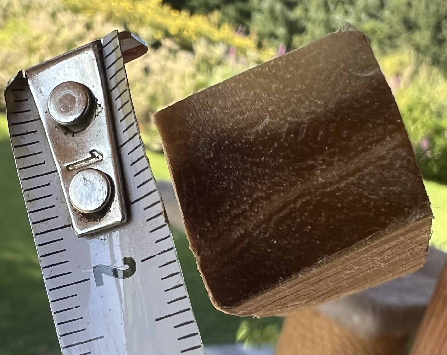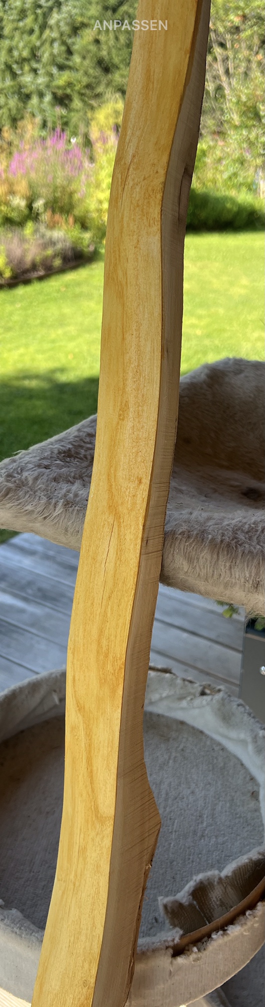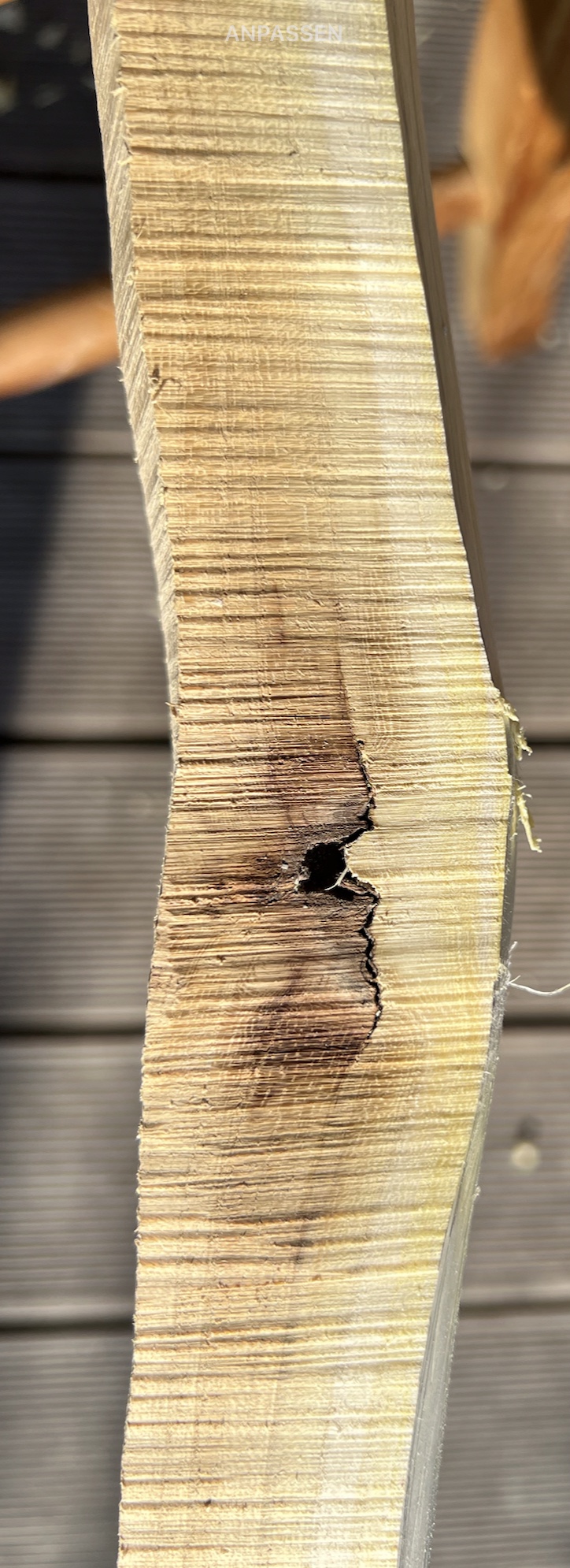 Habe einen Robinienbogen in Arbeit. Geerntet im März 2025, Holzfeuchte derzeit 13%, 90 Grad verdreht, dicke Splint-Kernholzringe, geplant ist ein Semi-Pyramidalbogen mit Splintring am Rücken. Die äußeren Splintringe sind gerissen, habe auf den letzten Splintring herunter gearbeitet, nur mehr wenige zarte Risse sind verblieben, der Bogen ist grob ausgeschnitten und der verschliffene Rücken mit Schellackwachs eingestrichen. Bogenlänge derzeit 2m. Jetzt muss er noch weiter trocknen. Meine Fragen sind: wie dick darf der Splintring sein? (Das Splintholz ist sehr zäh und elastisch), sind die dicken Jahresringe gut bei Robinie? Geplant sind ein Trapping und ein flacher Bogenbauch. Der Totast fällt beim Verschmälern weg. Glück gehabt.