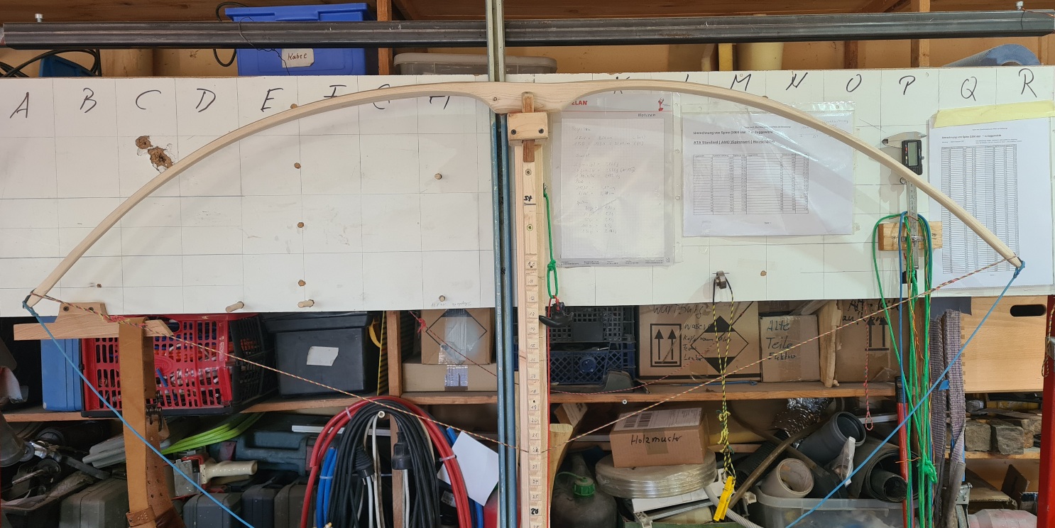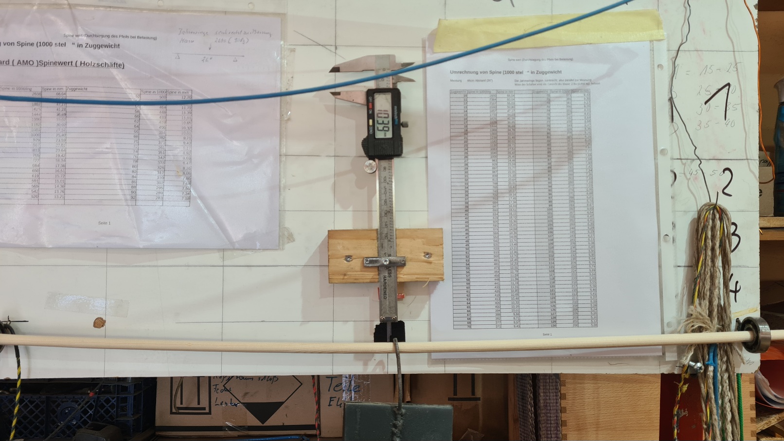 Mein Tiller Speinbrett ist am Motorkran des letzten Oltimeraufbau befestigt. Der steht auf Rollen. Seitliches ziehen daher schwer. Ich habe keine Wand mehr frei. Es ist schwierig wenn eine Garage sehr unterschiedliche Funktionen erfüllen muss. Schweißraum, Schlosserei, Elektro/Elektonik, Bogen Armbrustbau, Galvanik, Lackiererei....... Speinwert des neuen Pfeil 63# Bei 33,5g