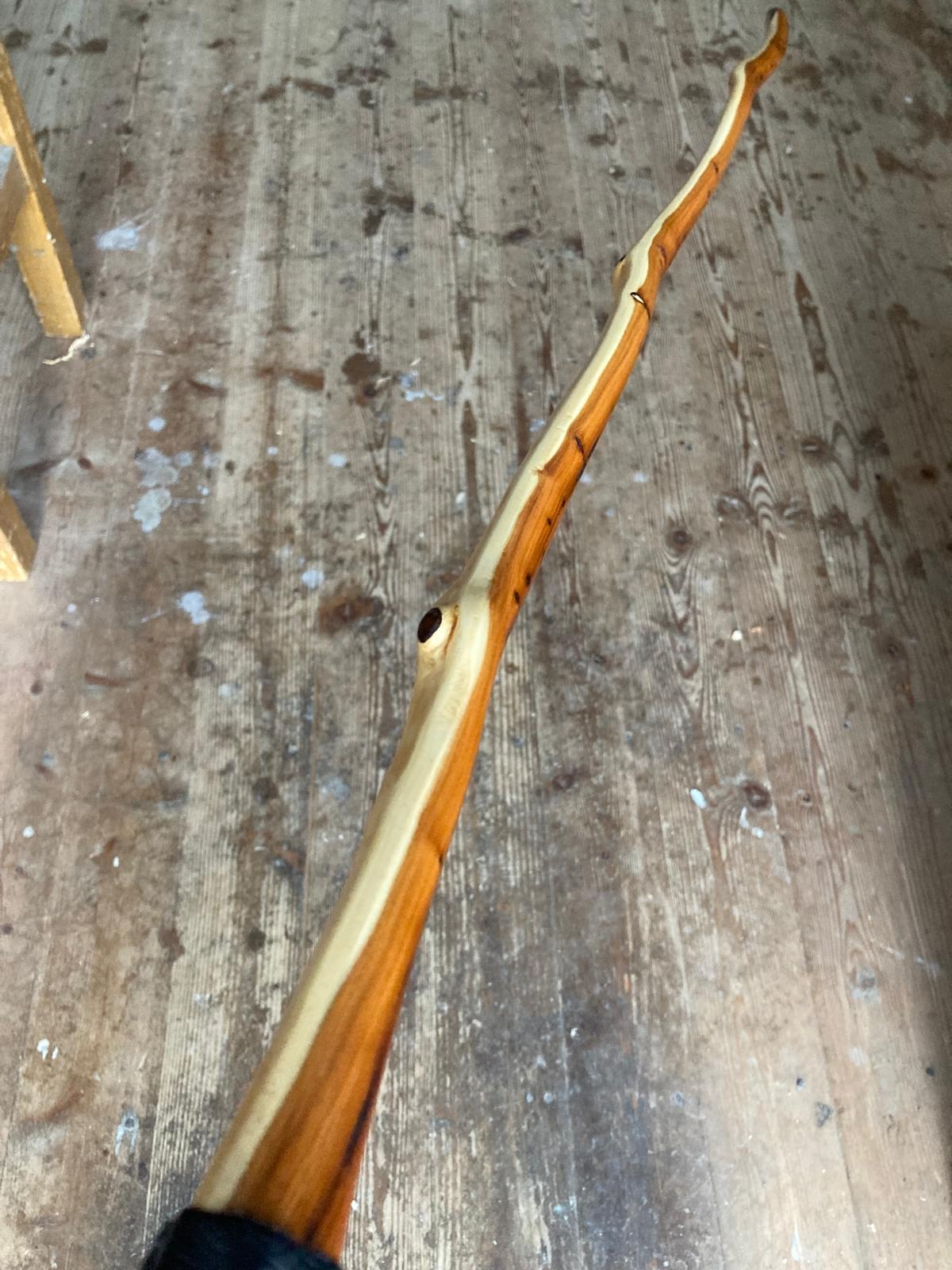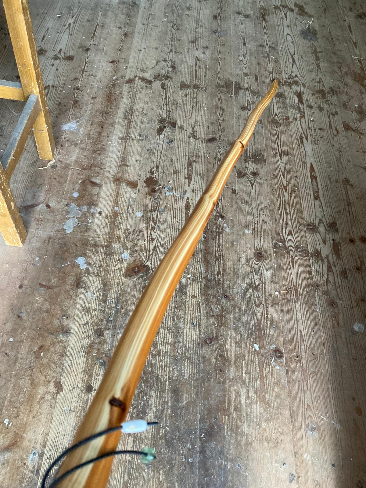 Der Bogen entstand aus einem 1 m langen Eibenstämmchen, das ich teilte und die beiden Billets im Griff verspleißte. Der Bogen sollte bei einer Länge von 170 cm ein Zuggewicht von 40-45 Pfund erreichen. Die Wurfarme hab ich auf gut 3 cm Breite und 2,5 cm Dicke ausgeschnitten,ohne auf Holz oder Jahresringe zu achten